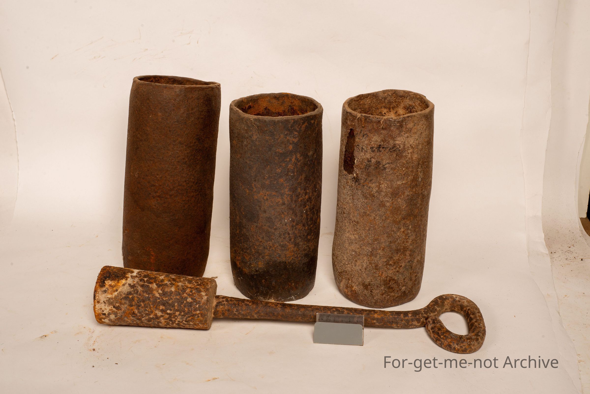 These are 3 dolly pots made from old mercury jars. These were used for putting small portions of quartz that were gold bearing and then hammered down with the, plunger to break it up into powder.Collection
