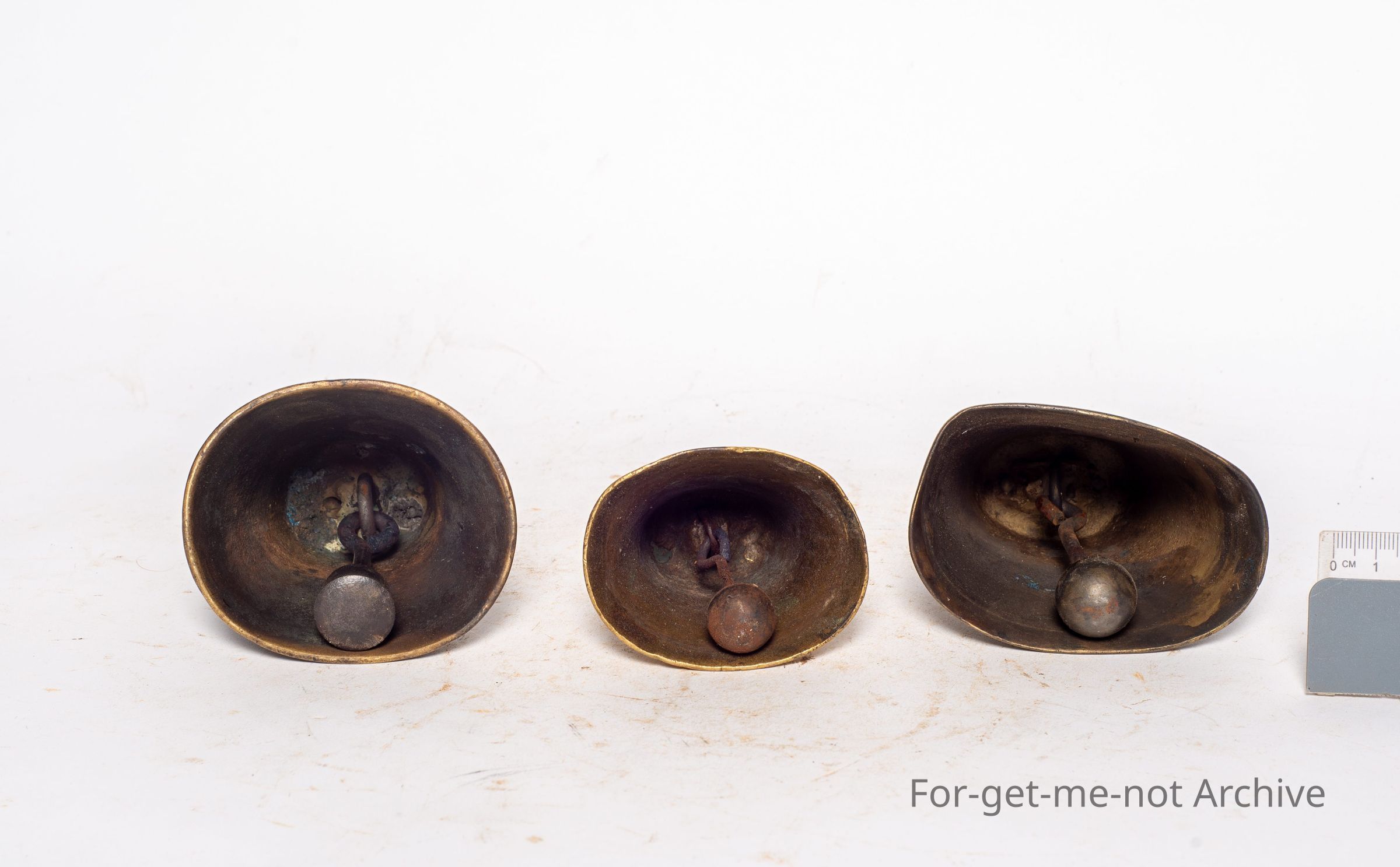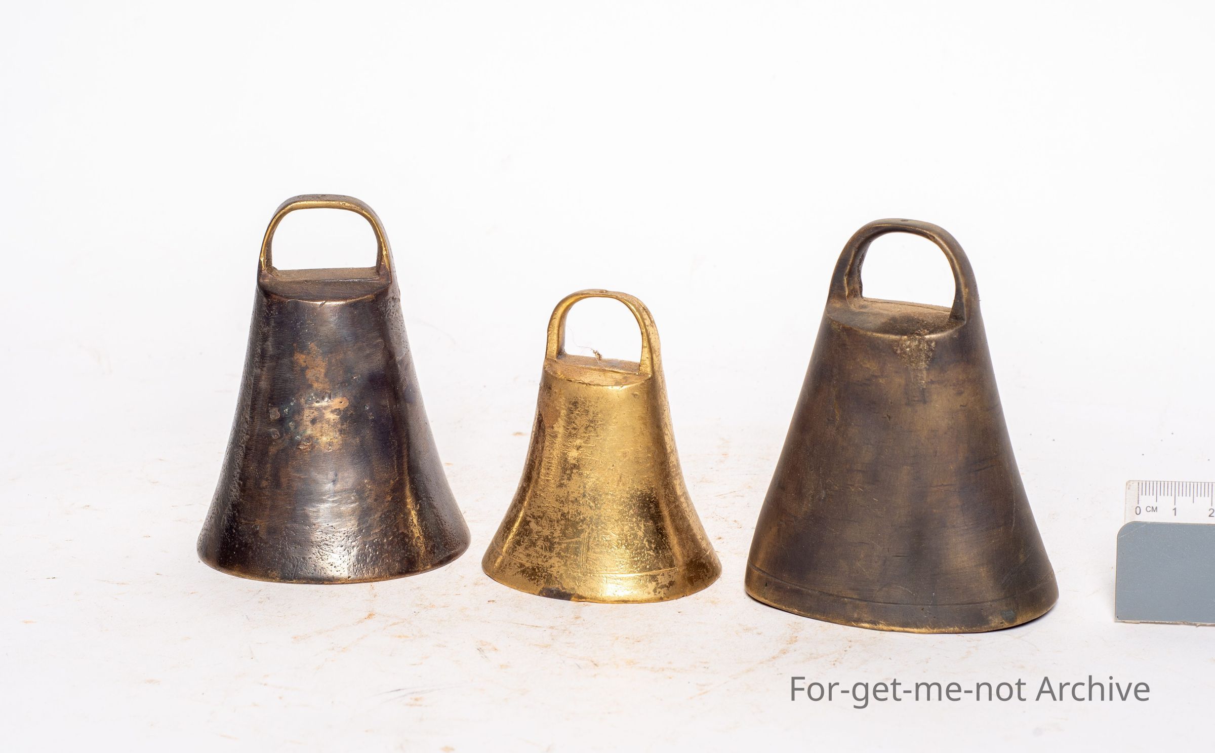 These are 3 cast brass bells. These are known as donkey bells. They're all the same shape, same patterning. Quite a hard one to find. These were used on donkey teams when they were released at night to feed, for locating them in the morningCollection