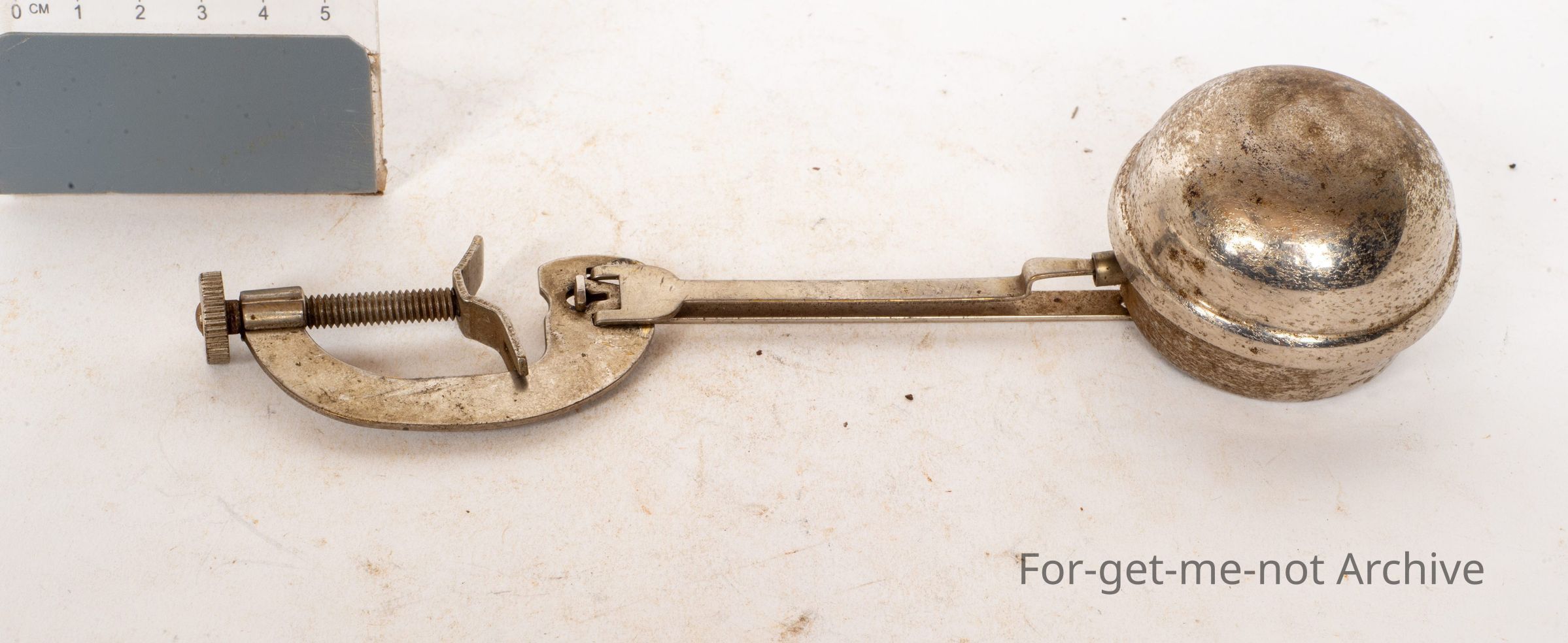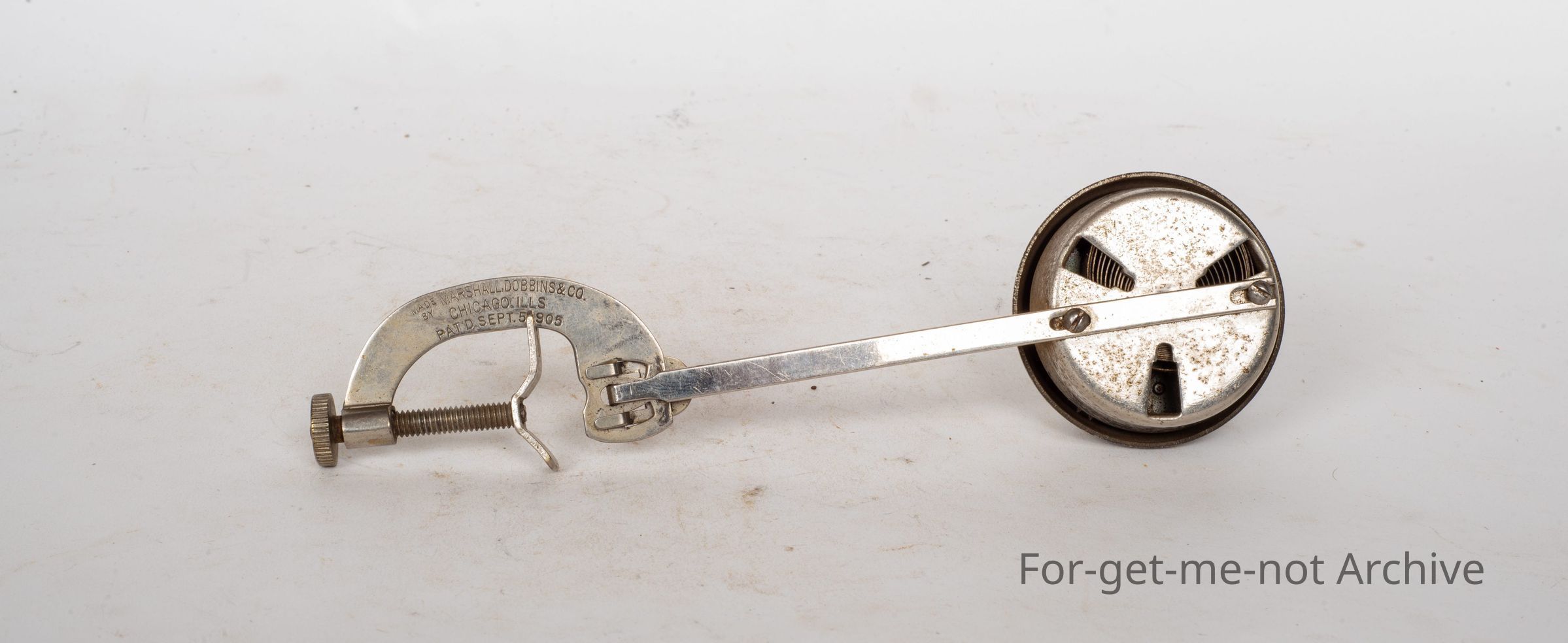 This is a door alarm that fits on the handle of the door on the opposite side to the turner. When it is rotated over, the alarm goes off. Made by Marshall Dobbins and Co, Chicago, Illinois. Patent, 1905. Very rare, very hard to find.Collection