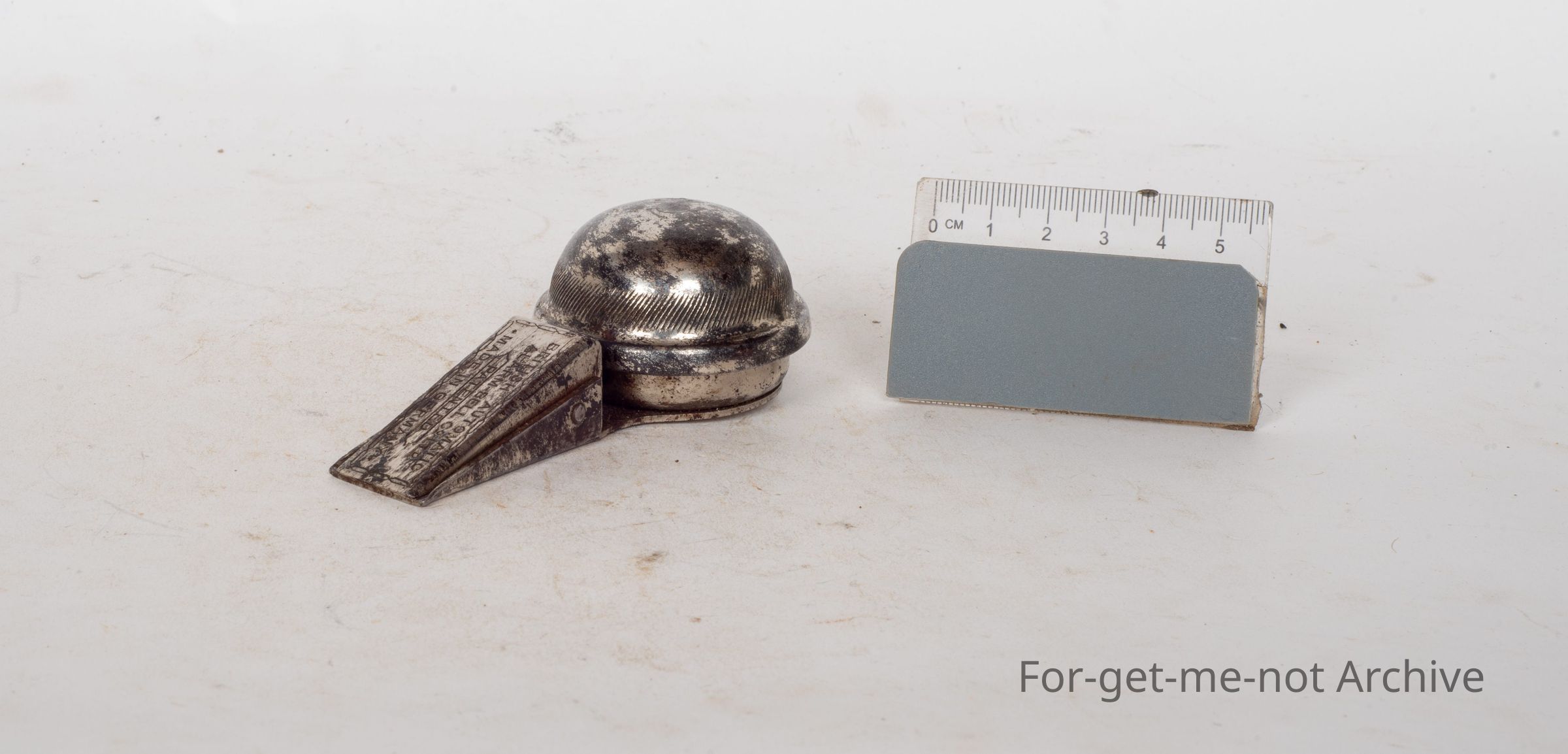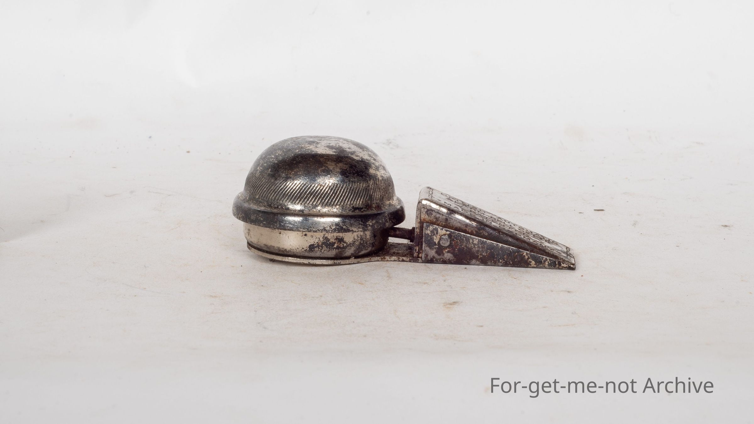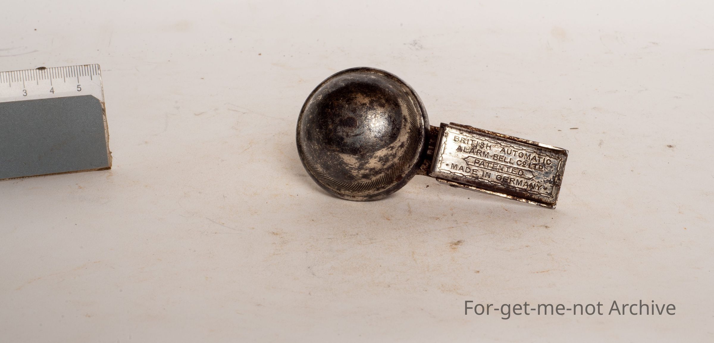 This door alarm is made by the British Automatic Alarm Bell Company. Patented. Made in Germany. This one doesn't appear to have a patent number, a different design to the last one. The same idea fits under the door. When the door is pushed away, the bell rings.Collection