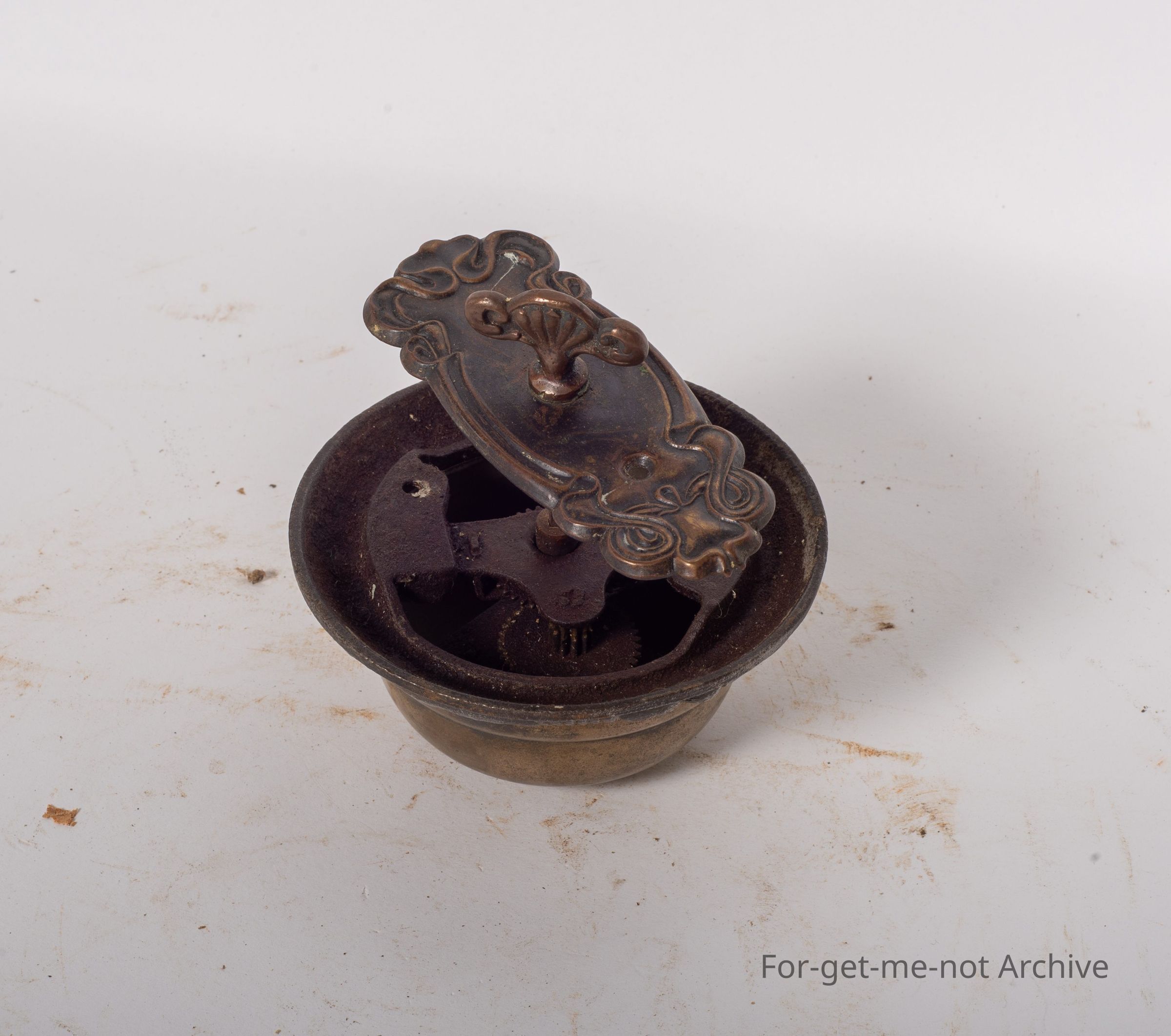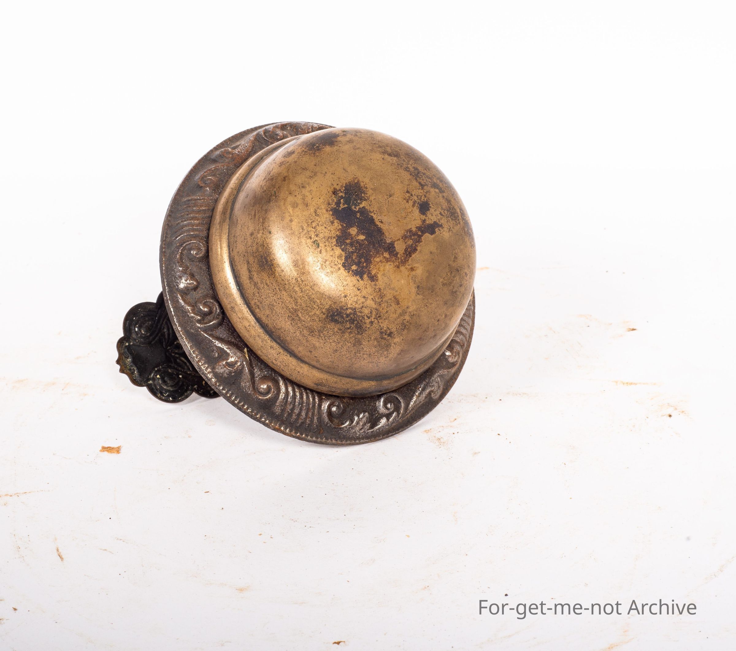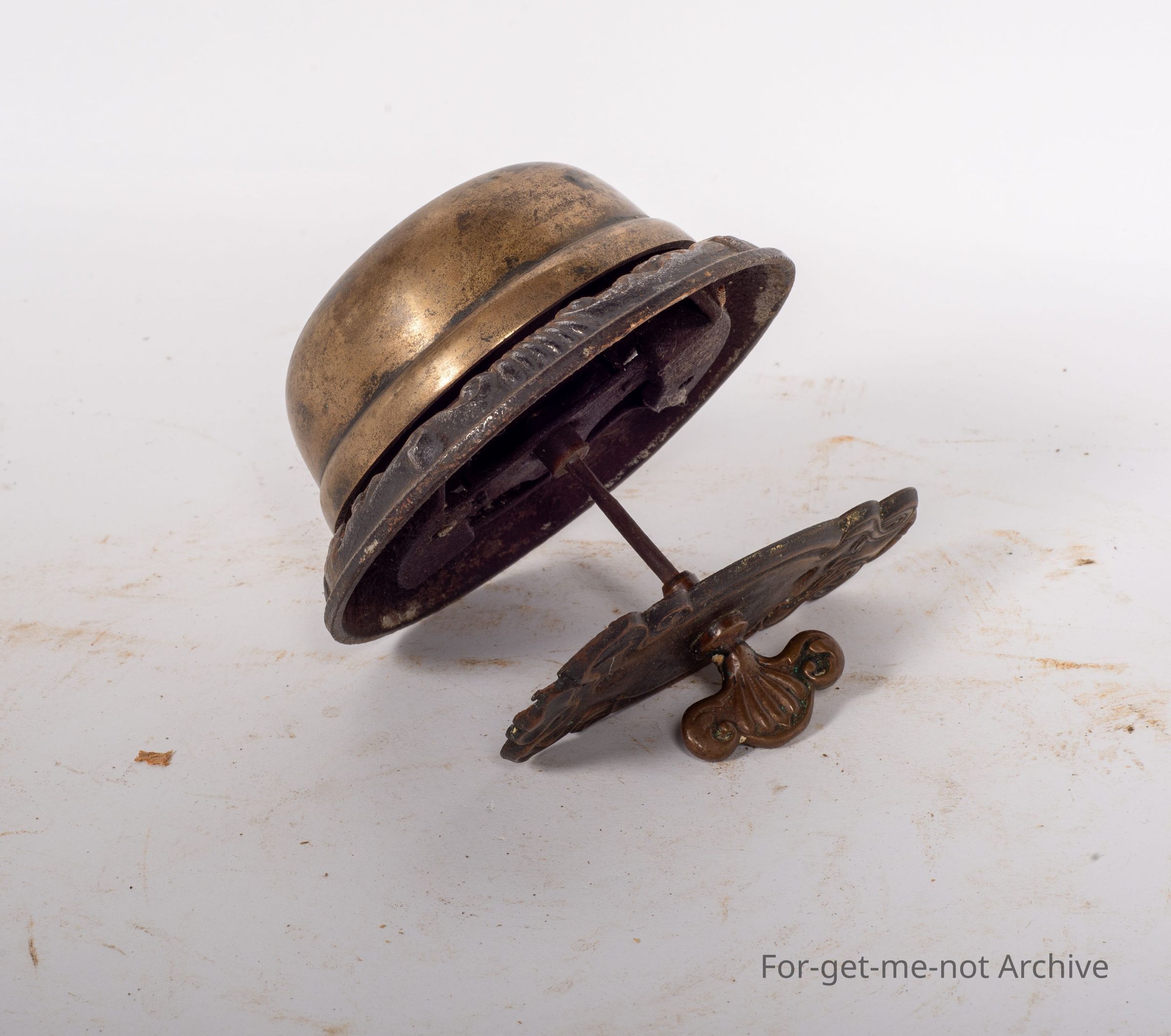 This is a front door bell from a homestead. An intricate, plate for the outside. The valve part would have been internal, the key would have been external on a heavy door. This bell has a glorious ring to it.Collection