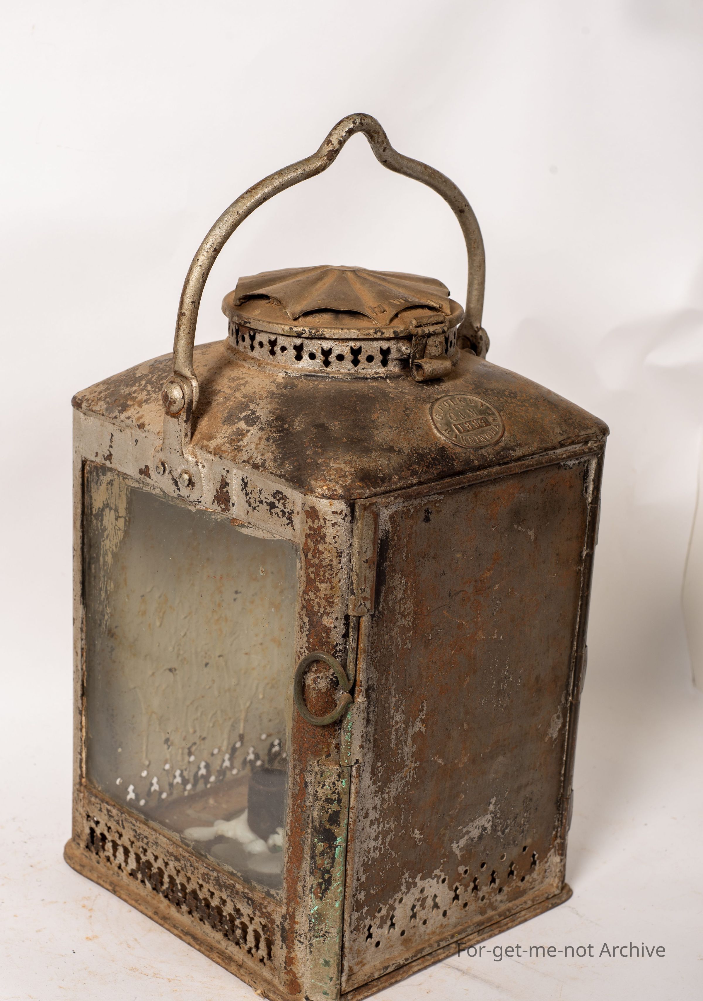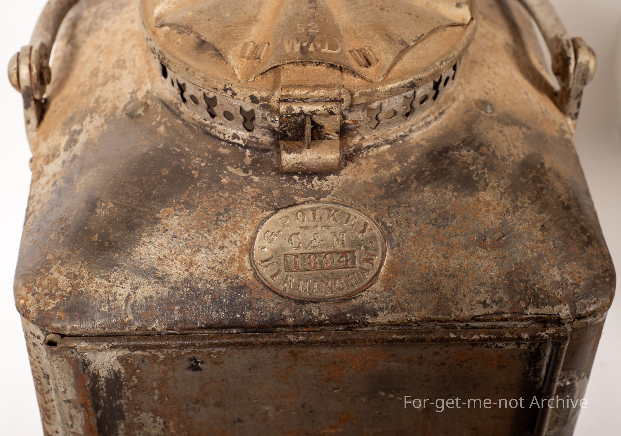 This is, category oil lamp description. This one is a double candle, railway lamp made in England, Birmingham, I think it was. Yeah. Birmingham, by Polke. Polke won the first contract for supplying lanterns for the, start of British Rail, very collectible in England. This one has a maker's plaque, a stamp on the top of the vent, a decorative air vent piece around the bottom with all the glass intact. Very interesting lamp.Collection
