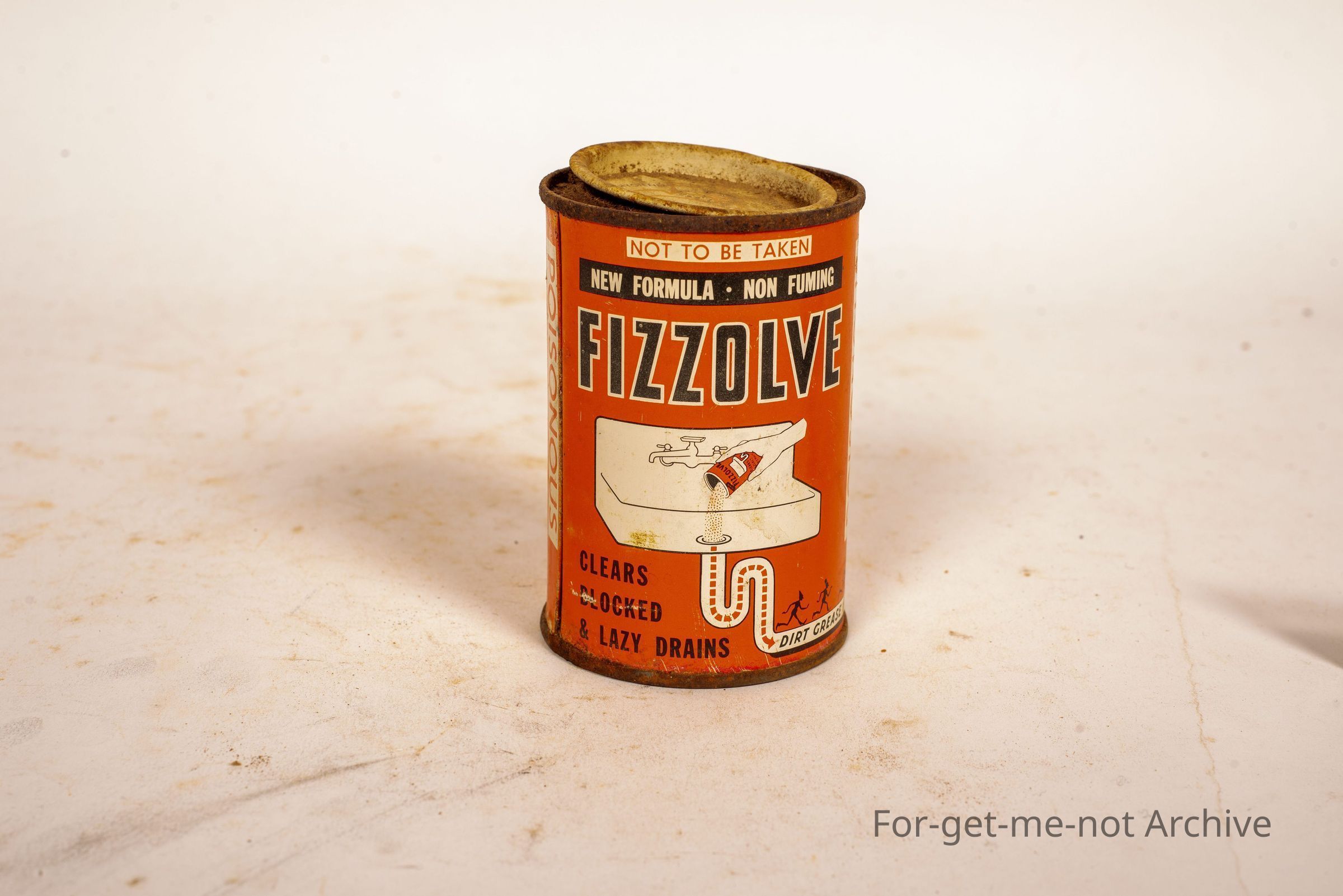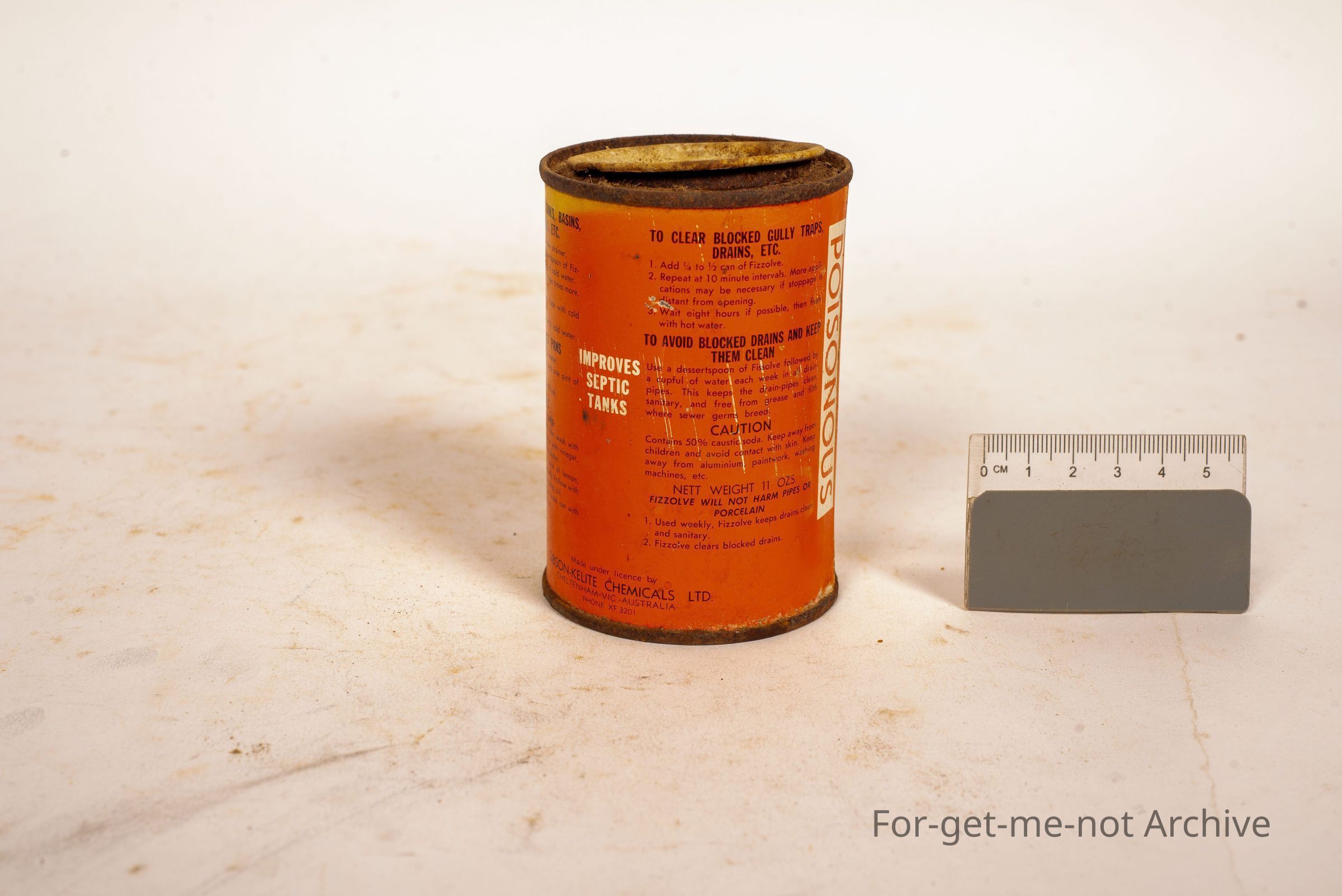 Is a tin of fizzol. Clears, blocked, and lazy drains. Poisonous. Made by Gibson Key Light Chemicals, Cheltenham, Victoria.