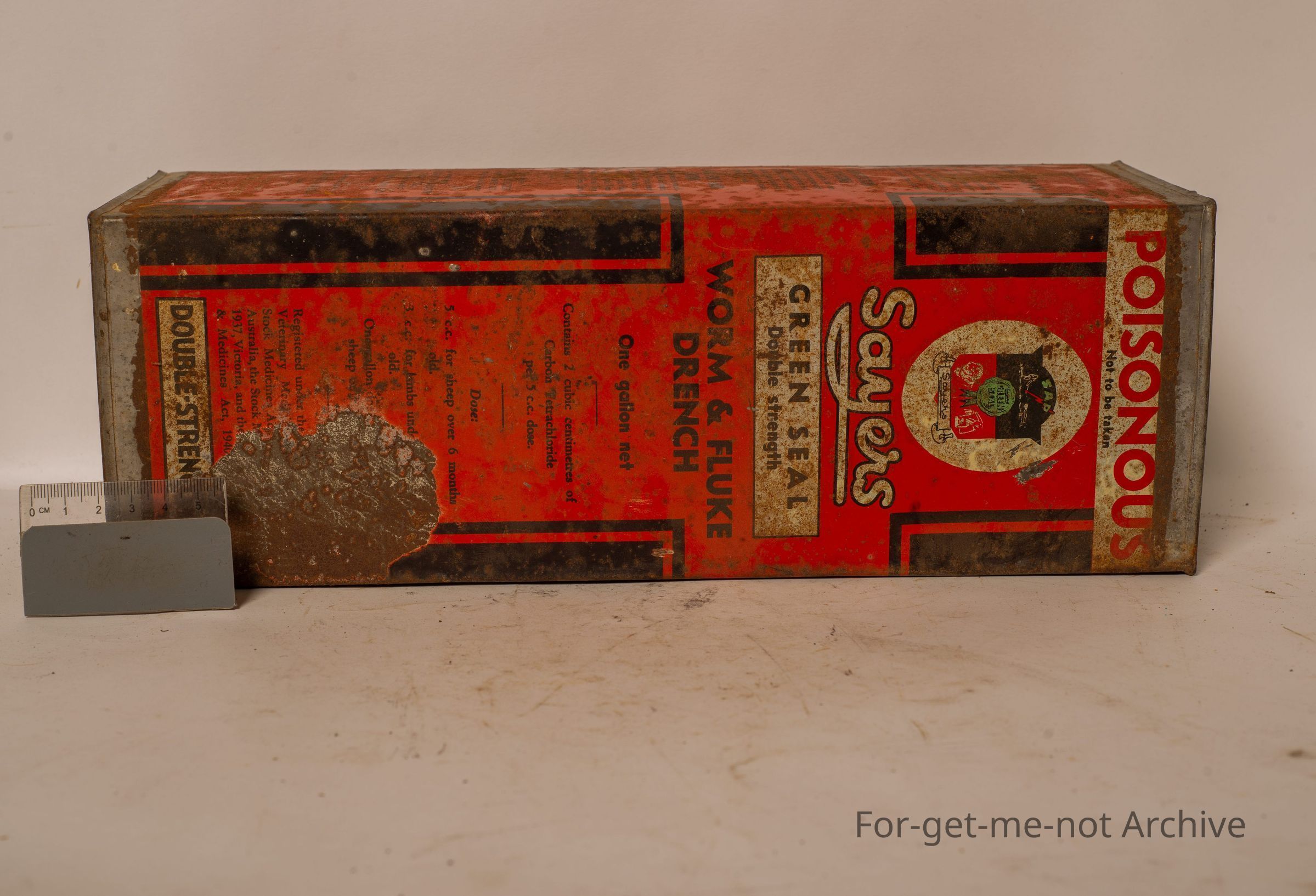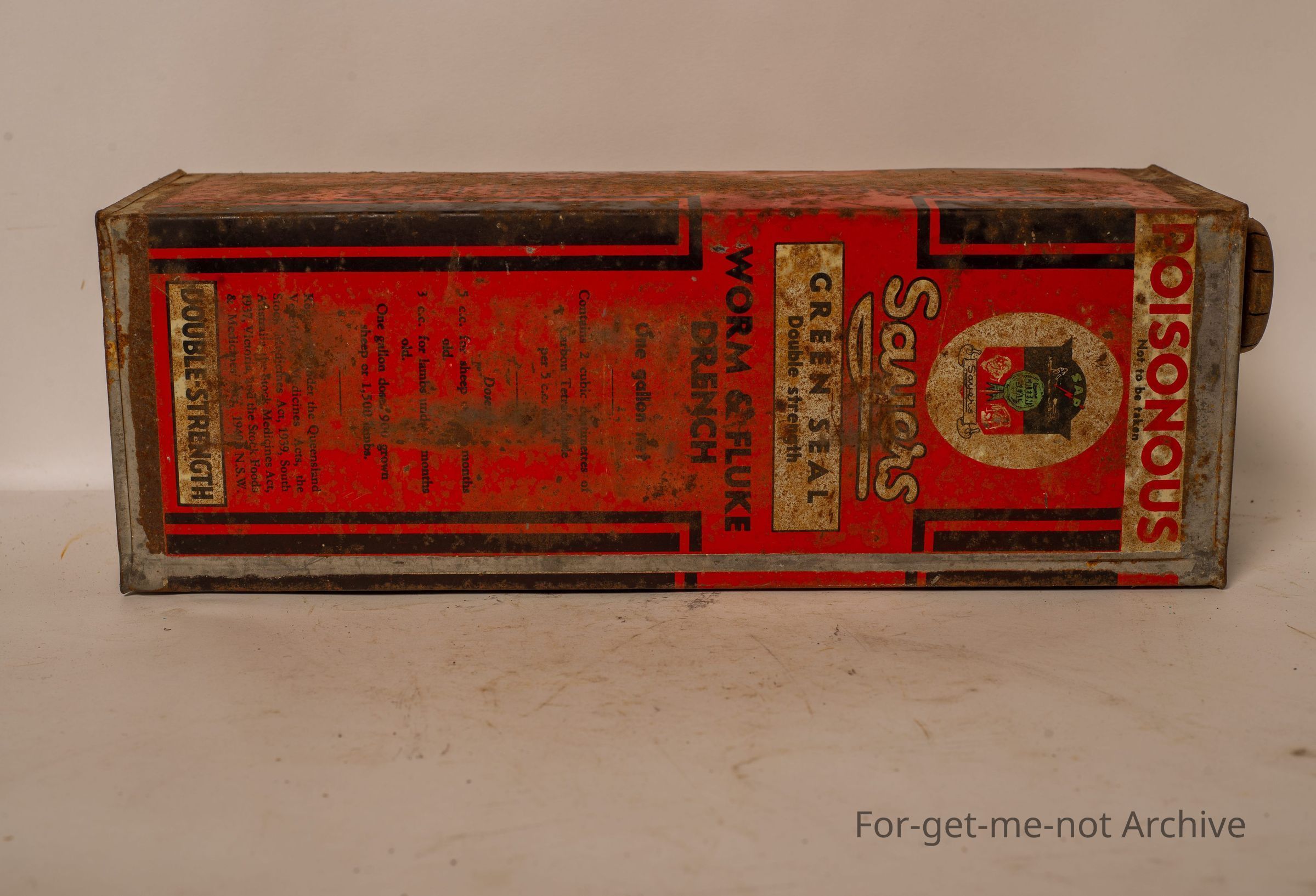 A large tin of Sayers Green Seal, double strength, Worm and Fluke Drench 1 gallon net. This is a tall square tin. Very unusual to see these in any sort of condition. Quite a square a scarce tinCollection