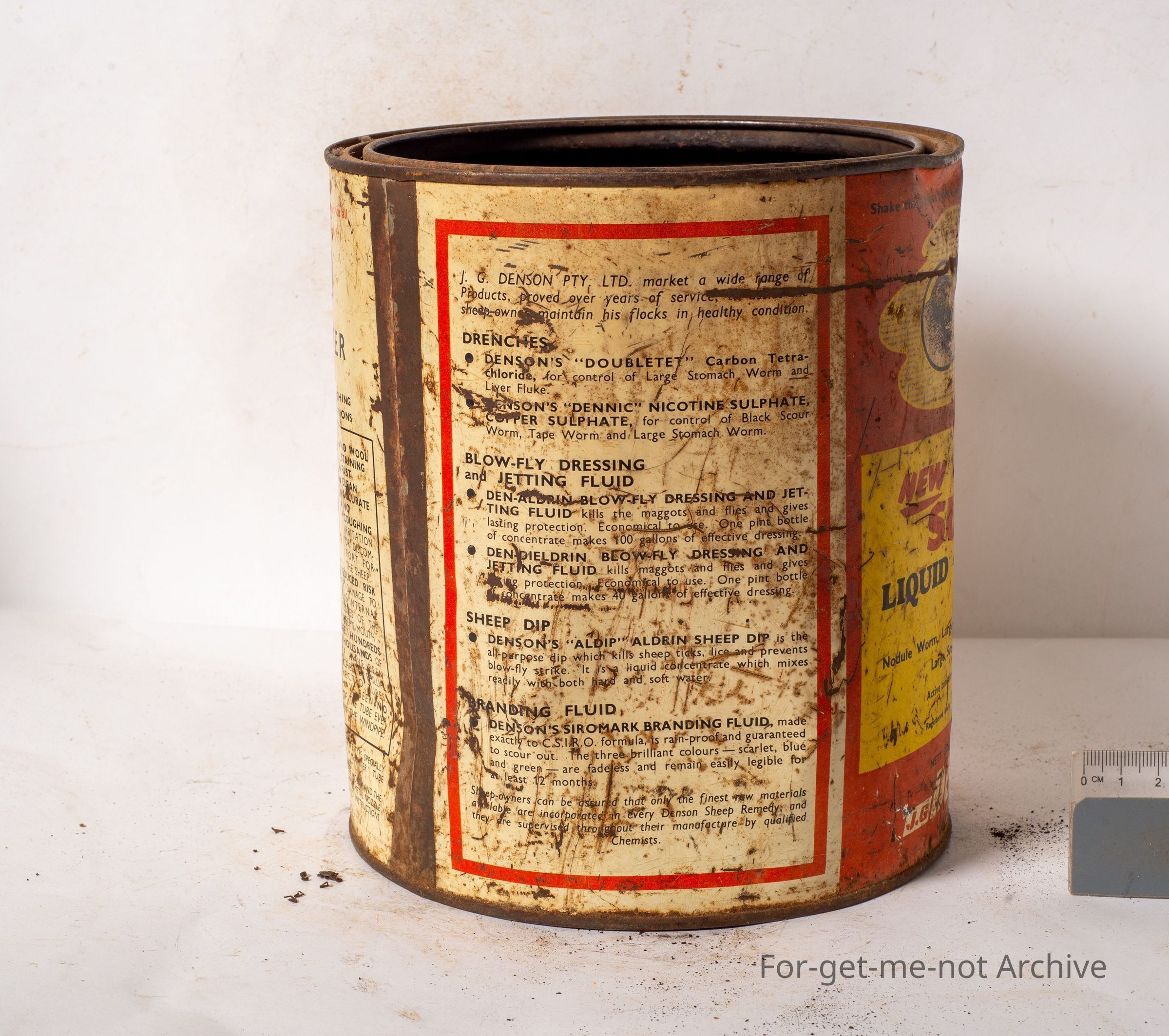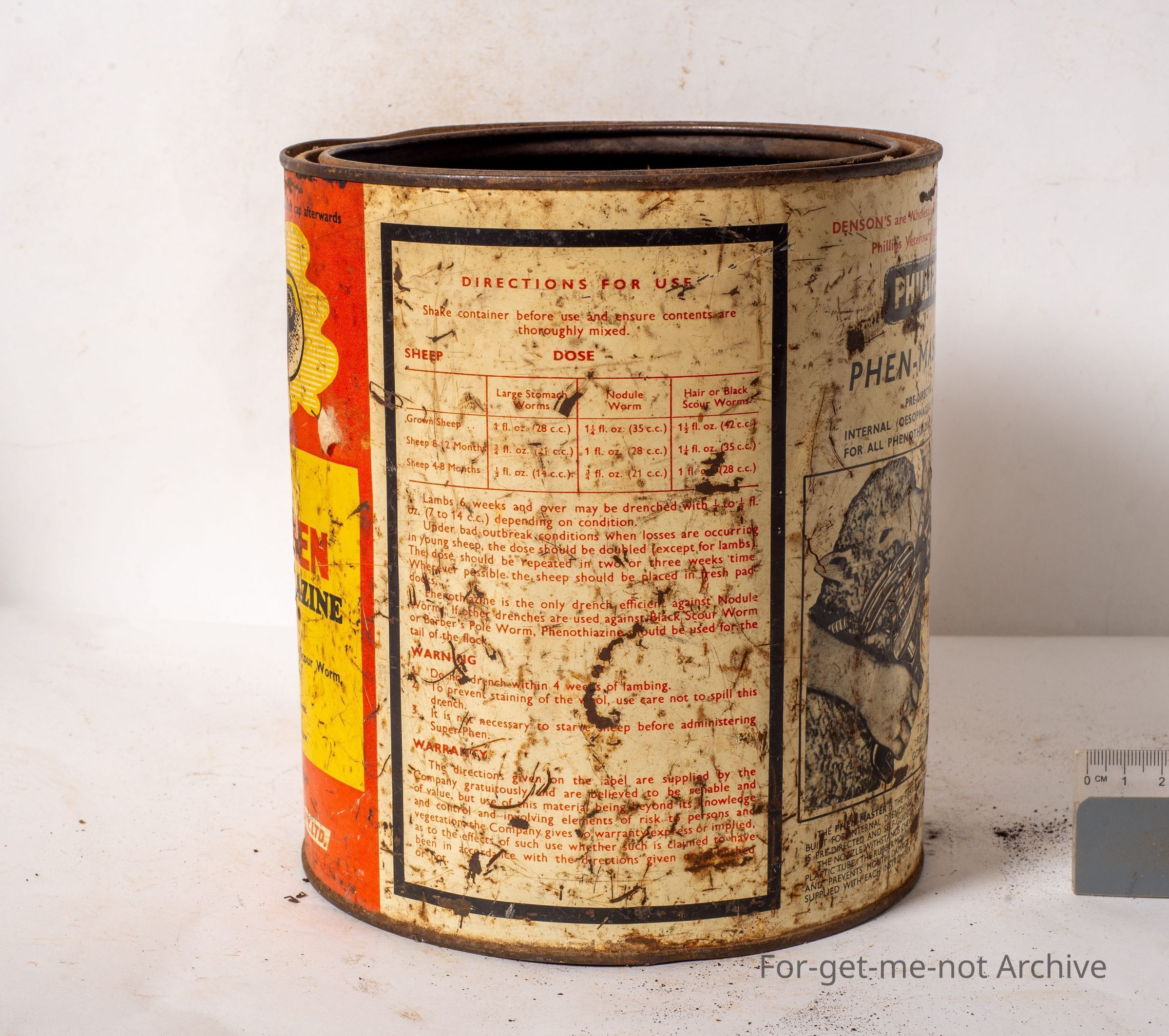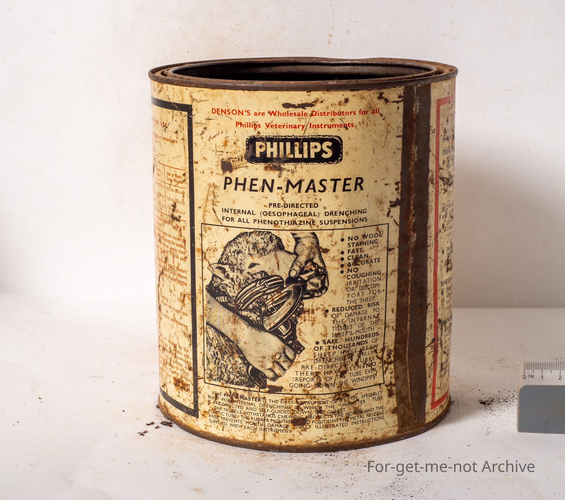 Denson's Super-phen Liquid Phenothiazine Sheep Drench. This is an unusual tin. Haven't seen this before. Also advertising the Phillips Phen Master Drench Gun. J.G. Denson pty ltd