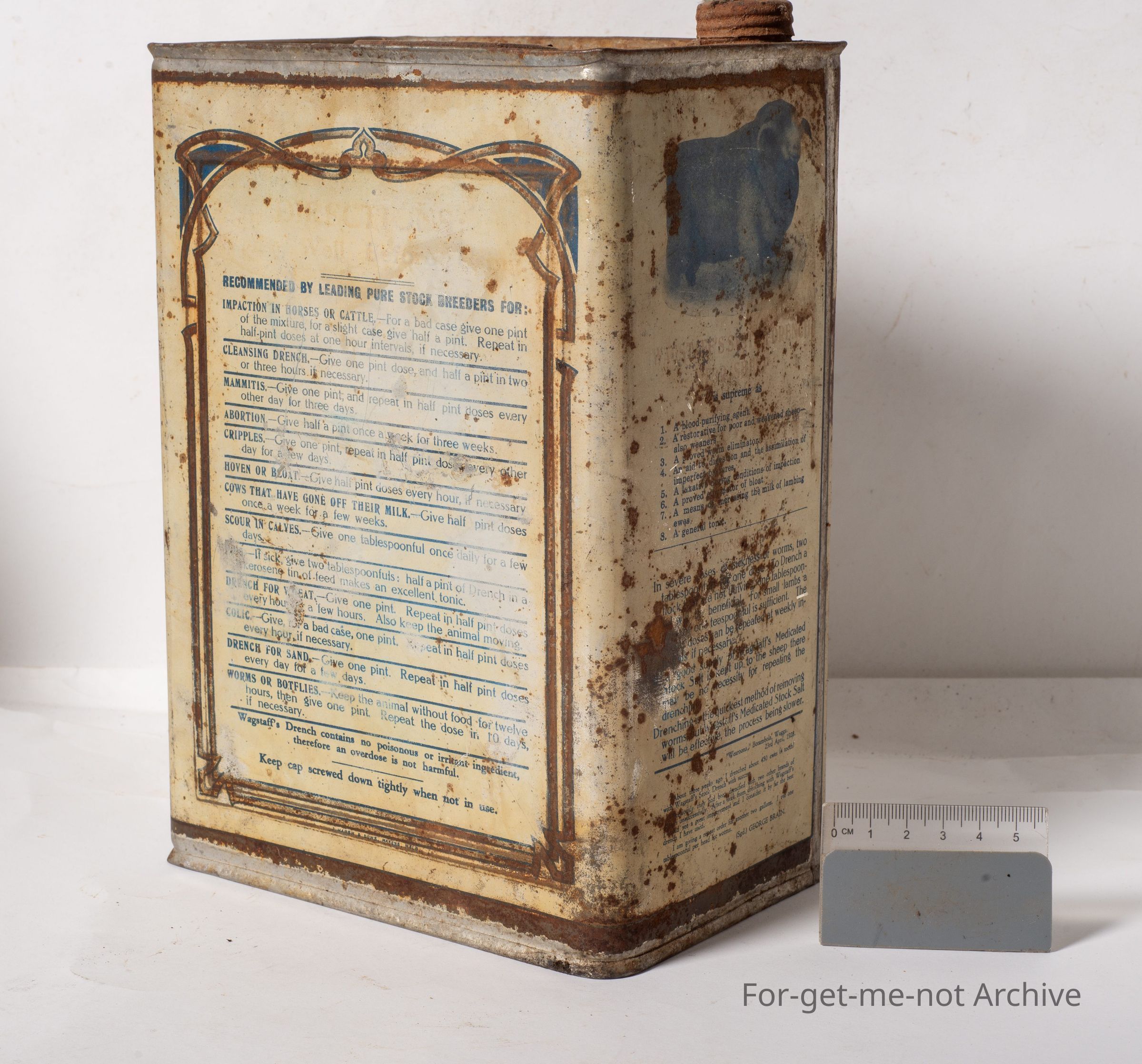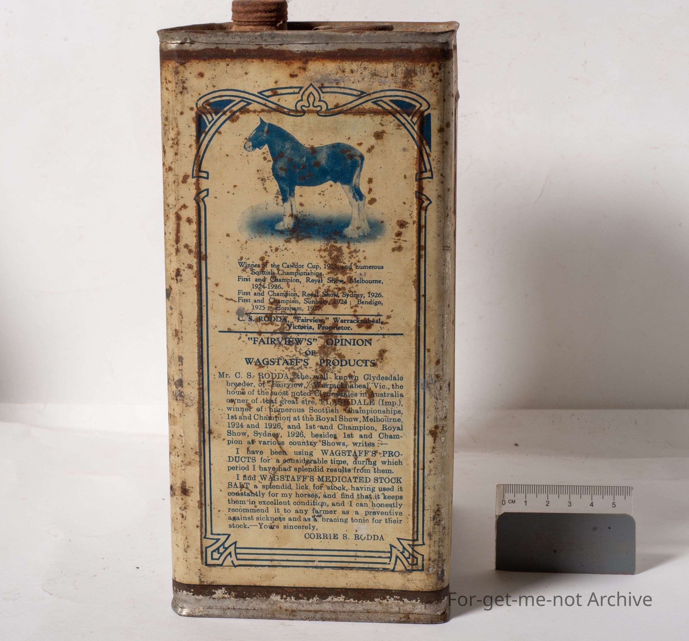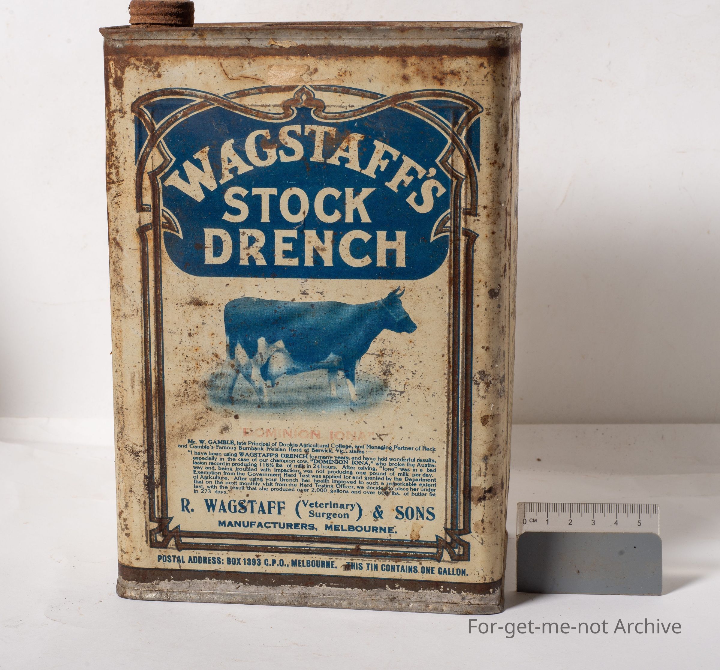 This is a 1 gallon tin of Wagstaff Stock Drench. Image of cow. Wagstaff and Sons Manufacturers Melbourne. This sin is in reasonable condition.
