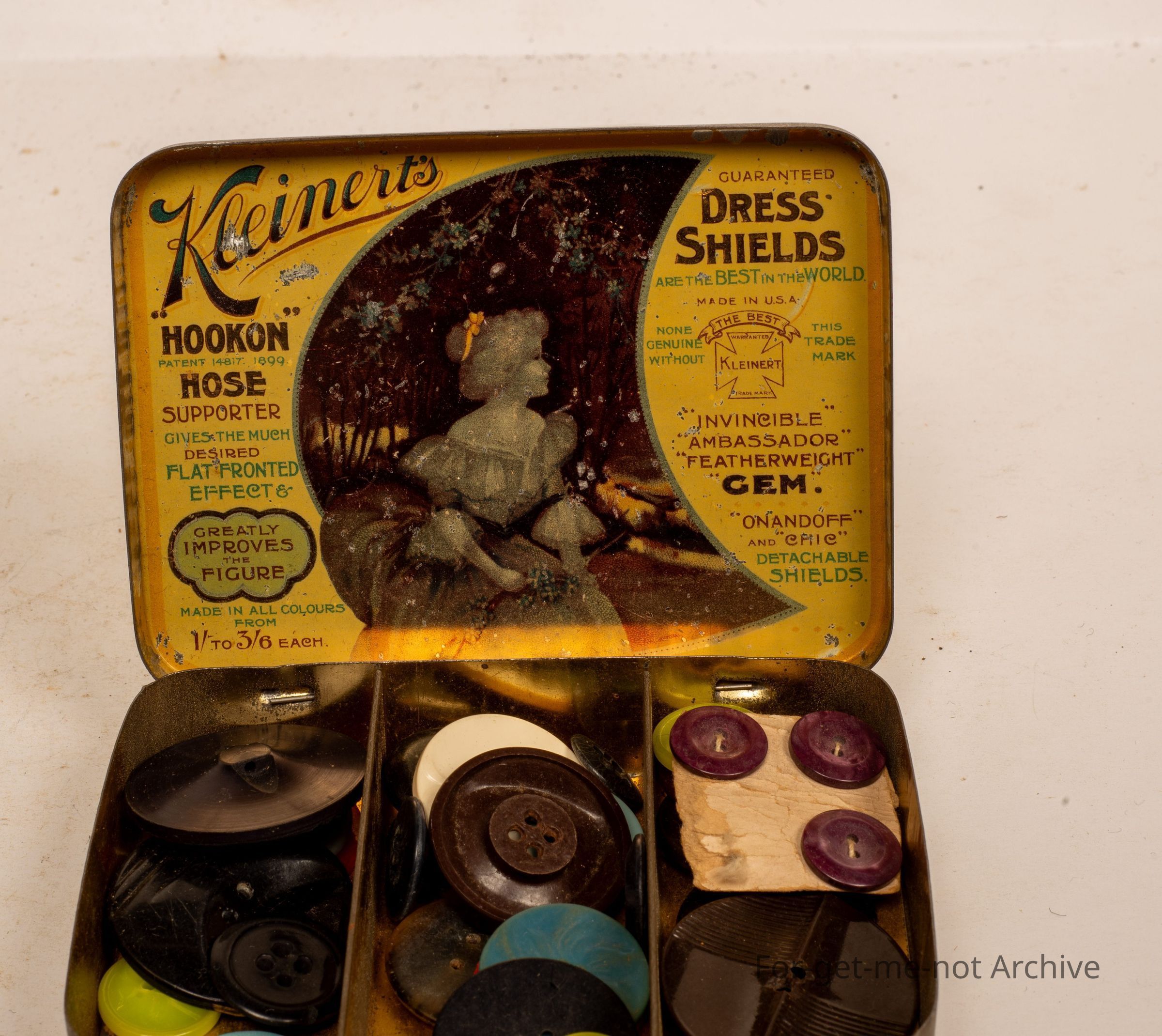 Is a very early tin of Kleinert's Dress Shields. Best in the world. Featherweight, greatly improves the figure.