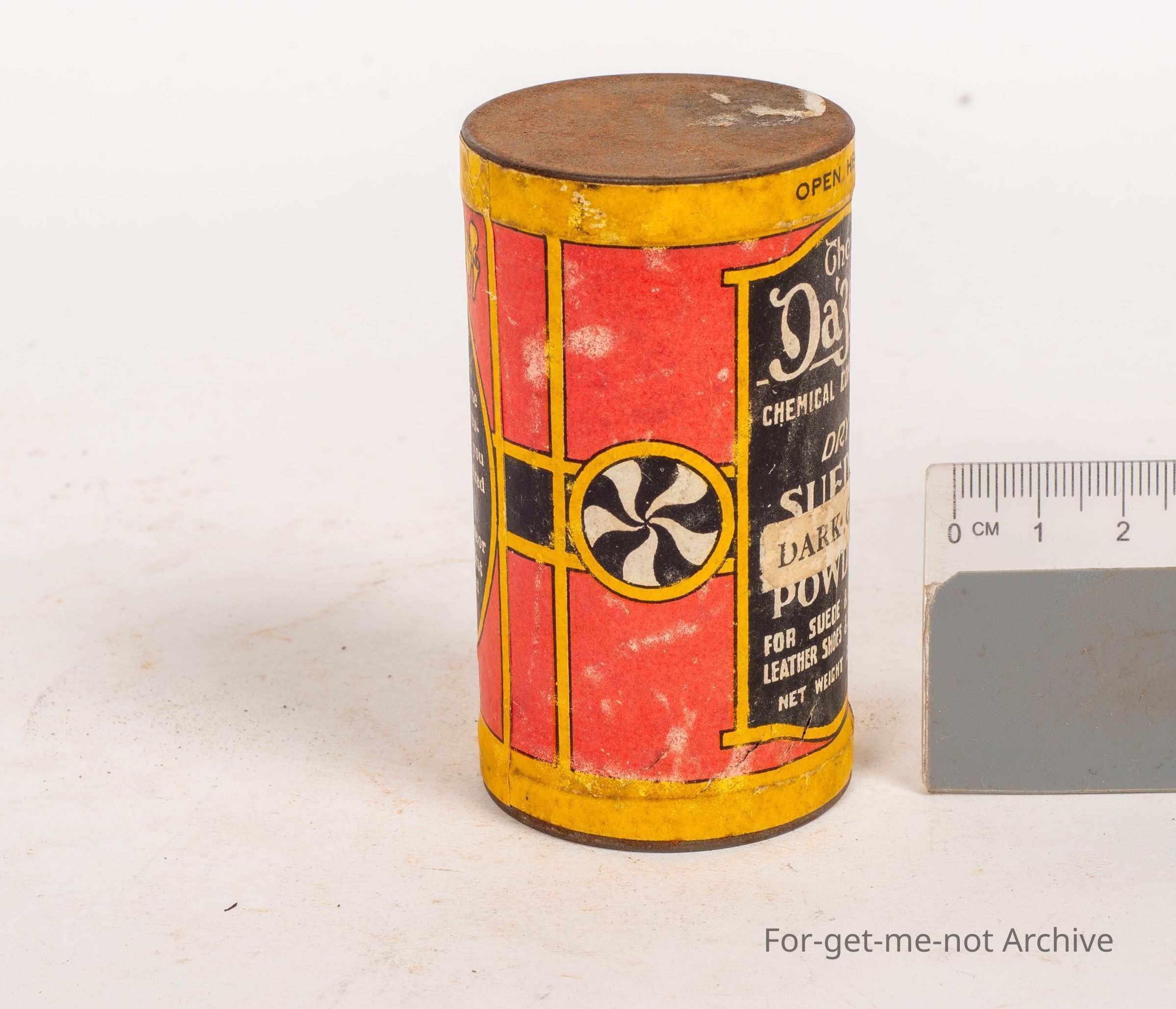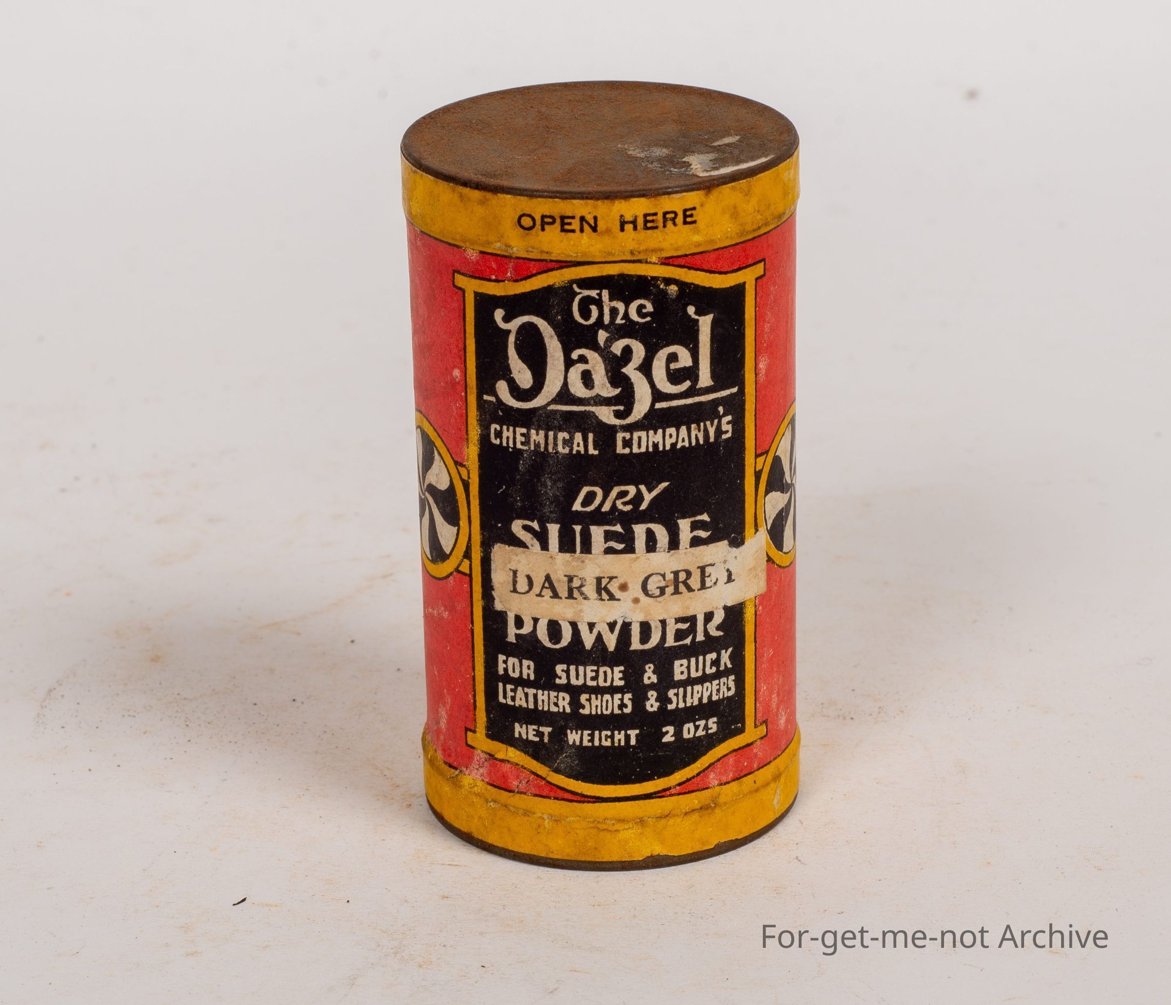 Suede cleaner, tin, The Dazzle Chemical Company's Dry Suede Powder for shoes and buck leather shoes, 2 ounces. Paper label