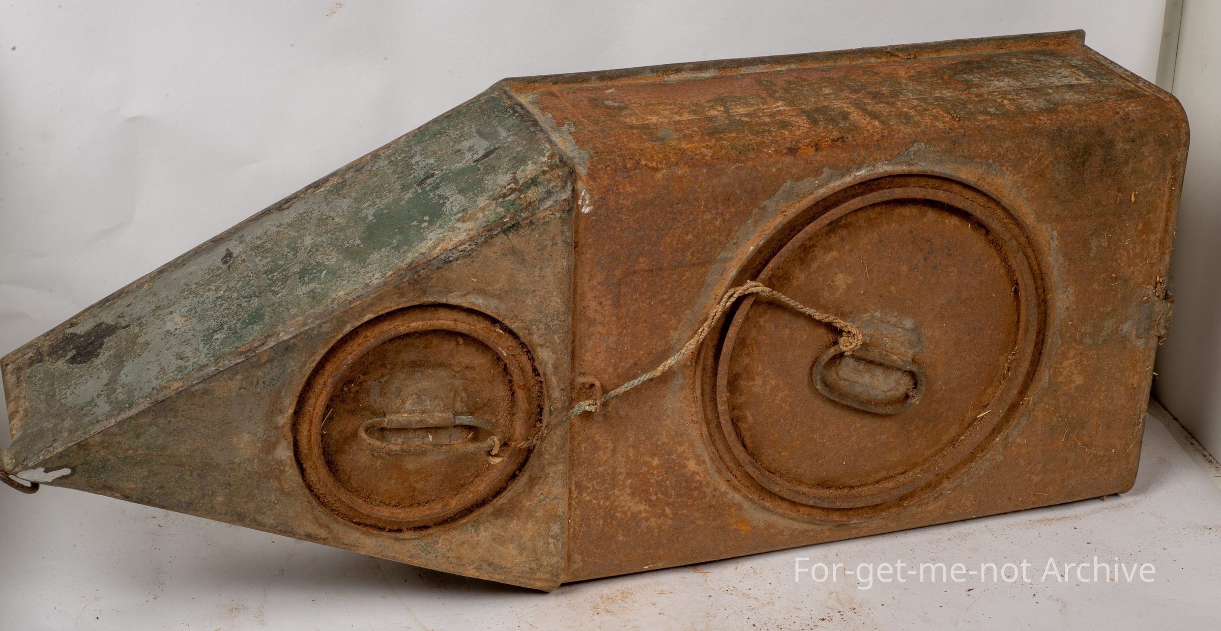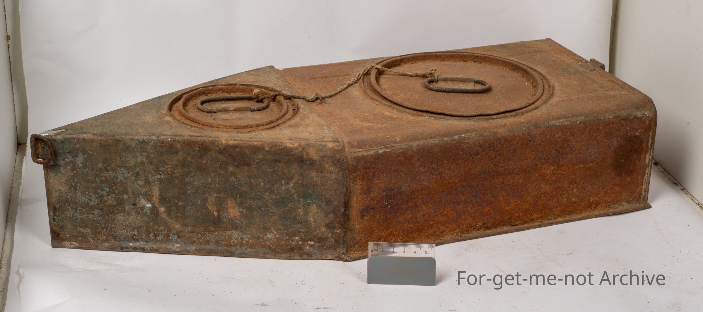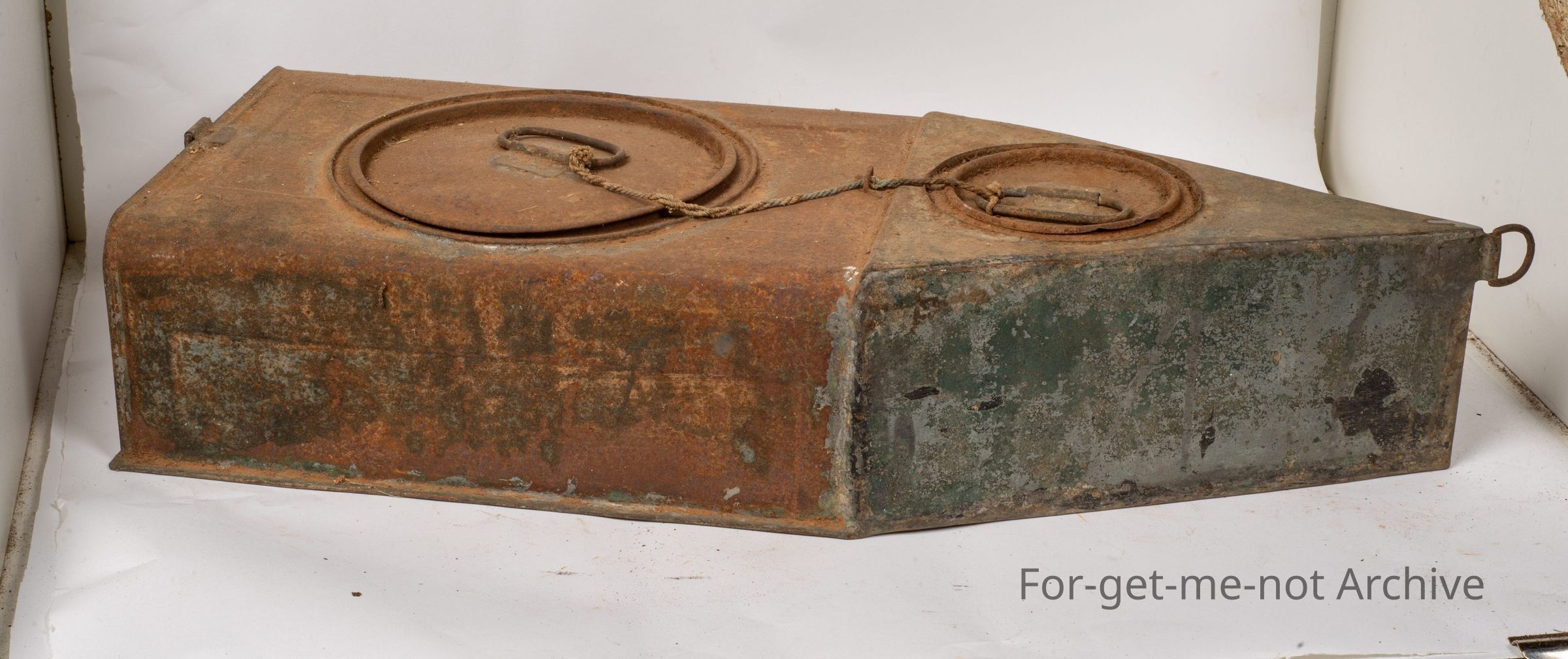 This is depression improvisation at its best. This is all homemade from kerosene tins. These were used by Duck Shooters to carry, quite large quantities of, cartridges which were cardboard and not waterproof. These had a lid, in 2 compartments, a large lid and a small one. They had a piece of train or leather that went to their belts so that as they walked around, this thing floated on top of the water and it could be pulled in either direction. This one is in excellent condition. No holes. Just a wonderful example of what they were made for.Collection