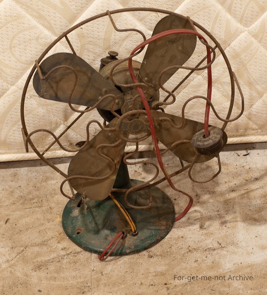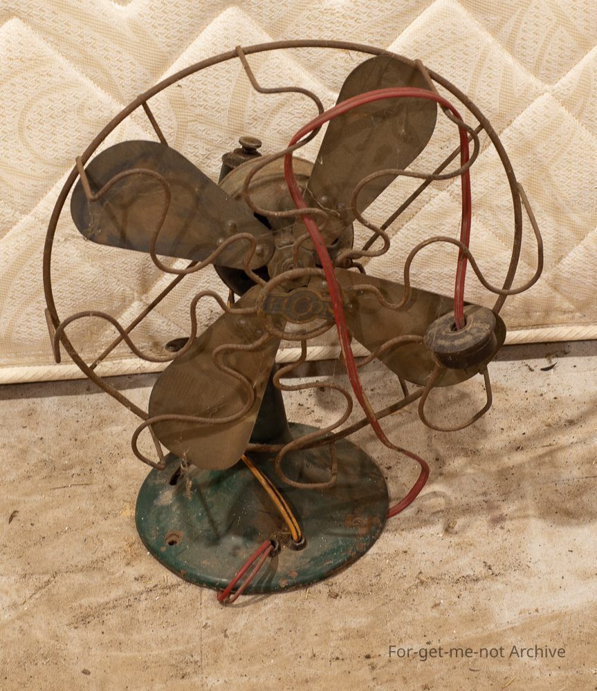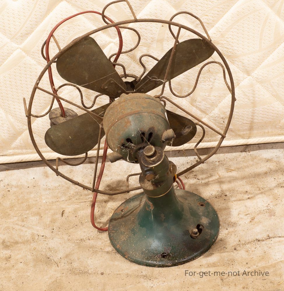 very early brass fan, protective wire cone, heavy cast iron base probably 1920a