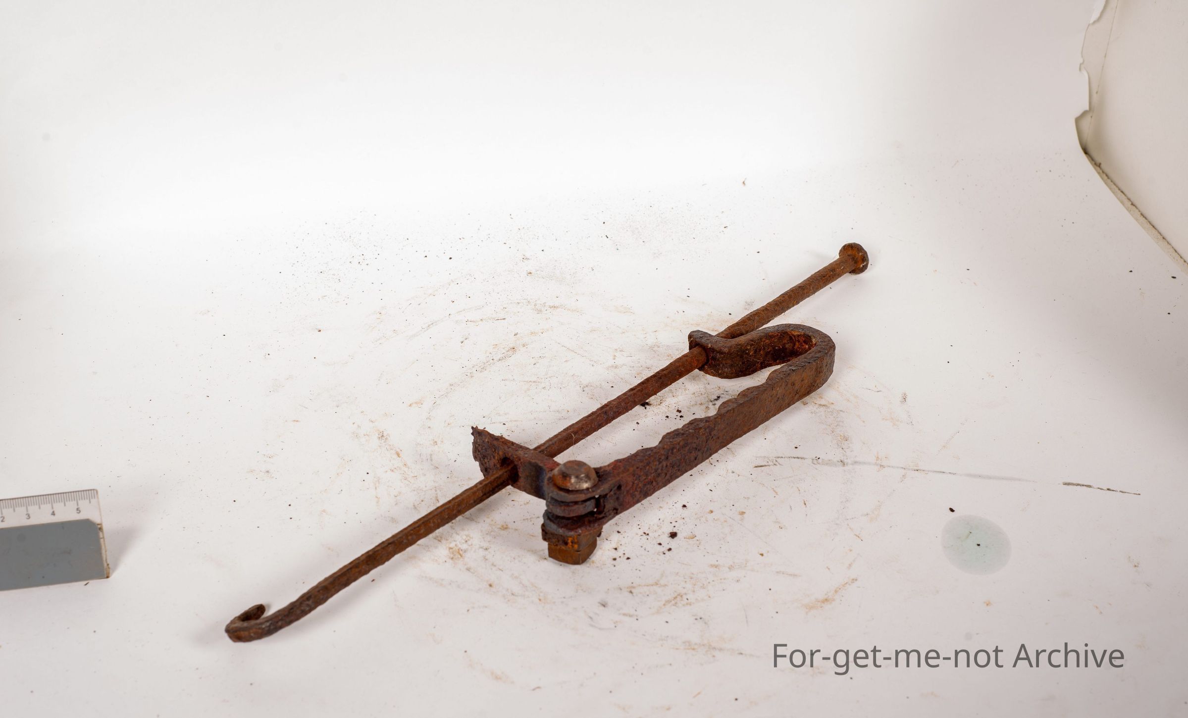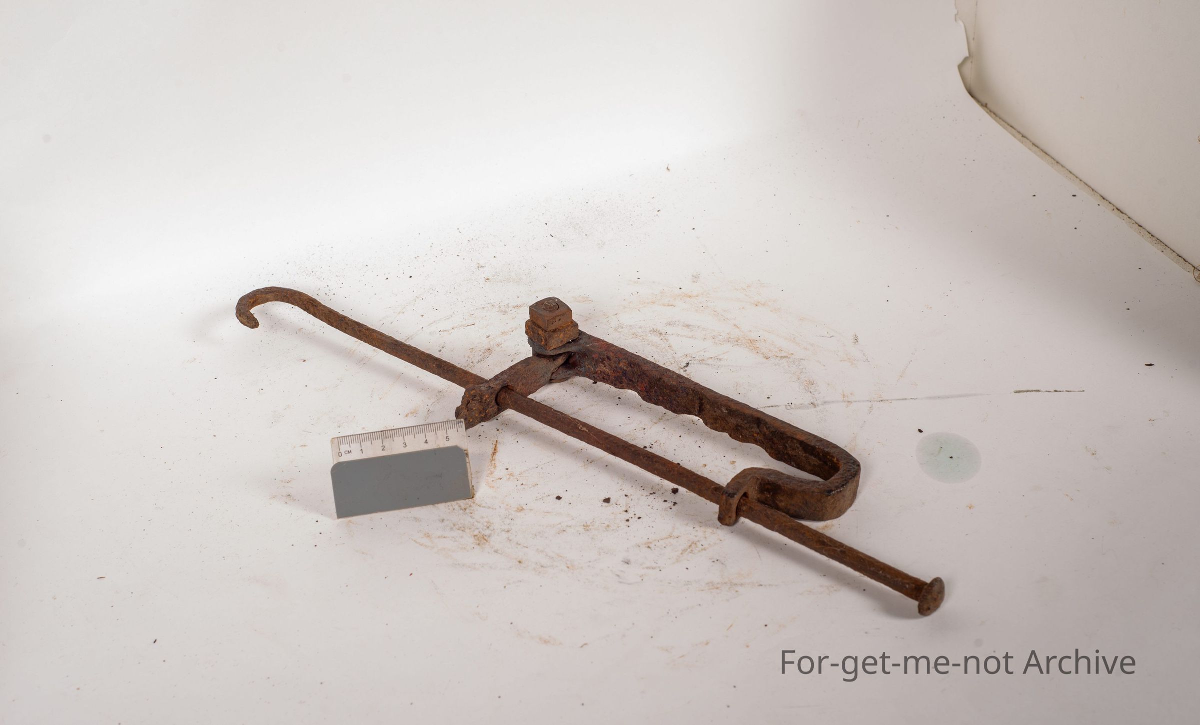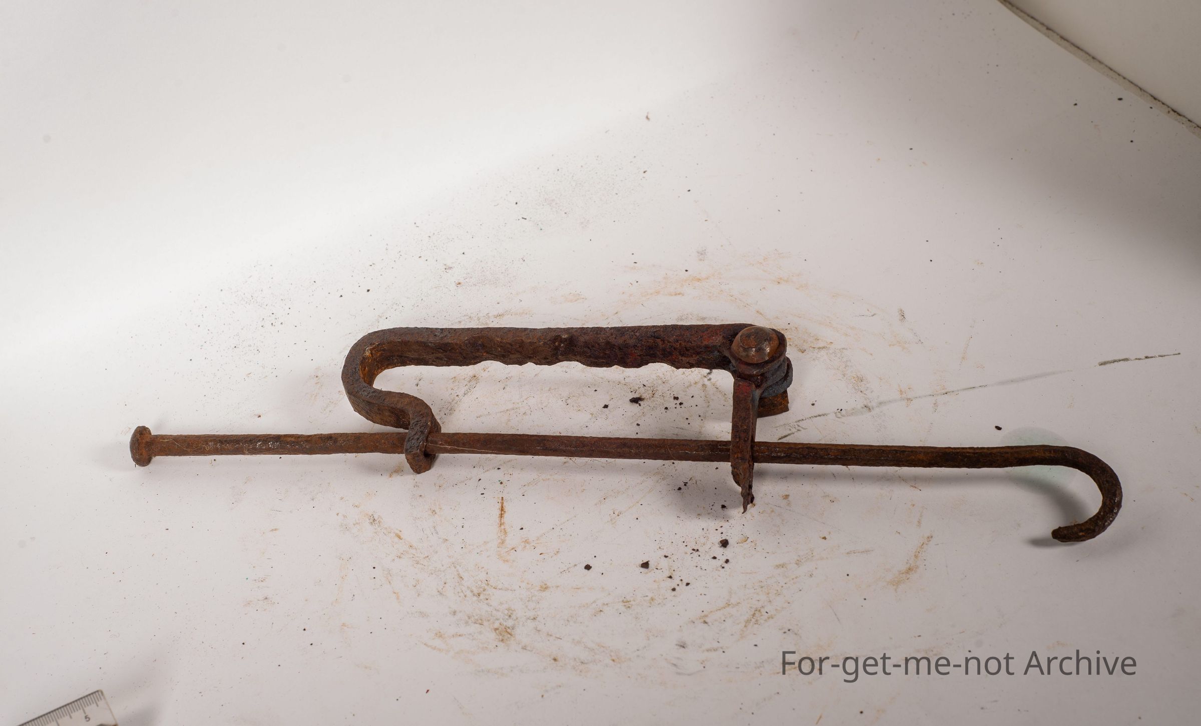 This is a very early hangar that hung on the fireplace crane in the early homestead buildings prior to cast iron stoves. They're adjustable on the height with a locker bar that, would allow it to go either up or down. This one was found, on Glenfine in the old hut on the creek, may go back to the days of the Roe family rather than the Howe family because it's so early and old.Collection