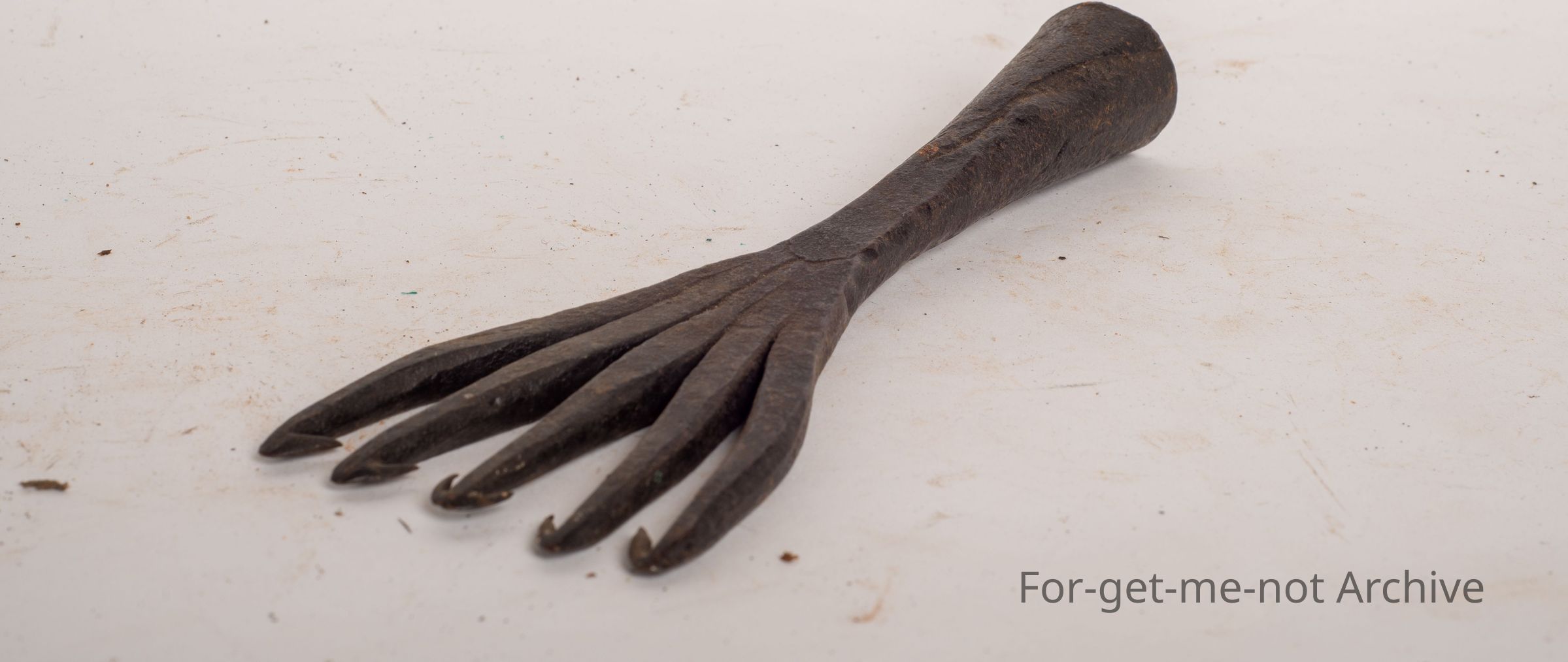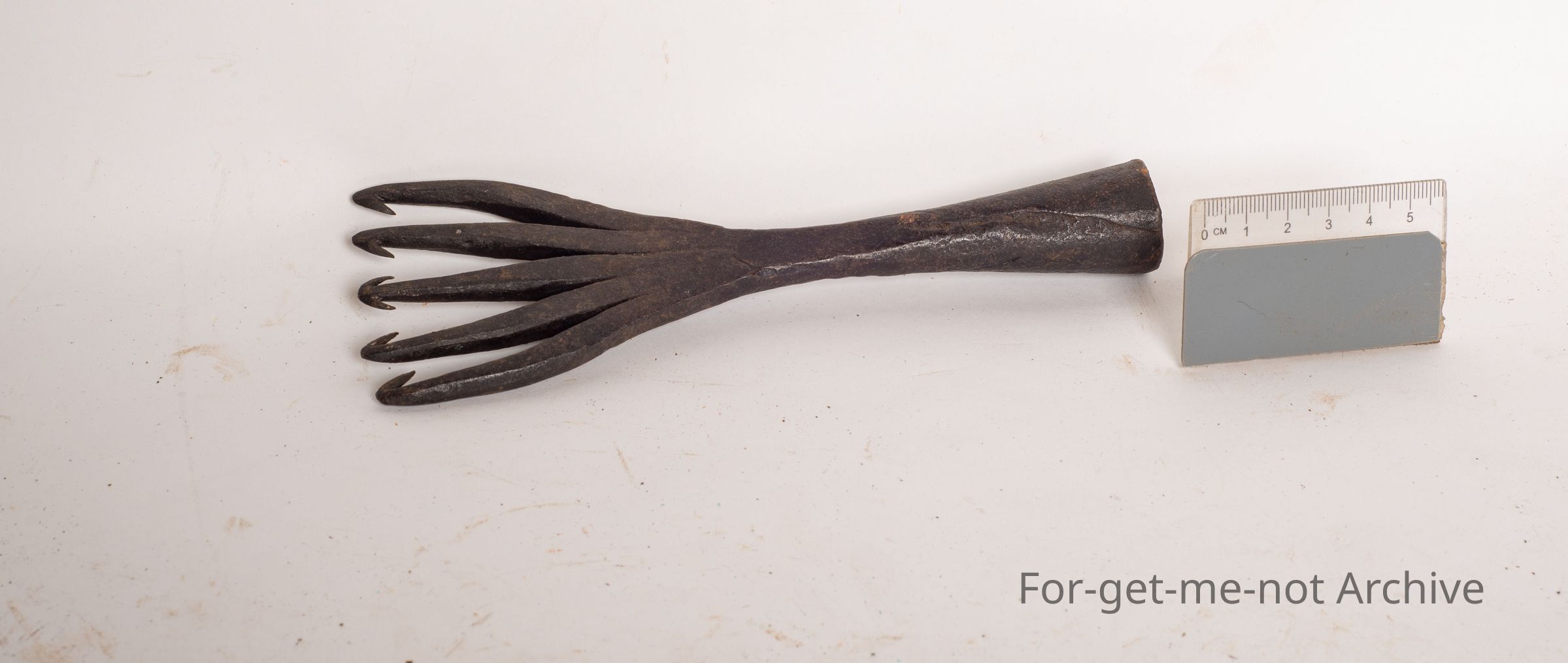 This is a glorious blacksmith made eel spear, 5 prongs all with extra hooks on the end so they cannot get off. Would have had a long wooden handle. This is a forge made one. Very old, beautiful condition.Collection