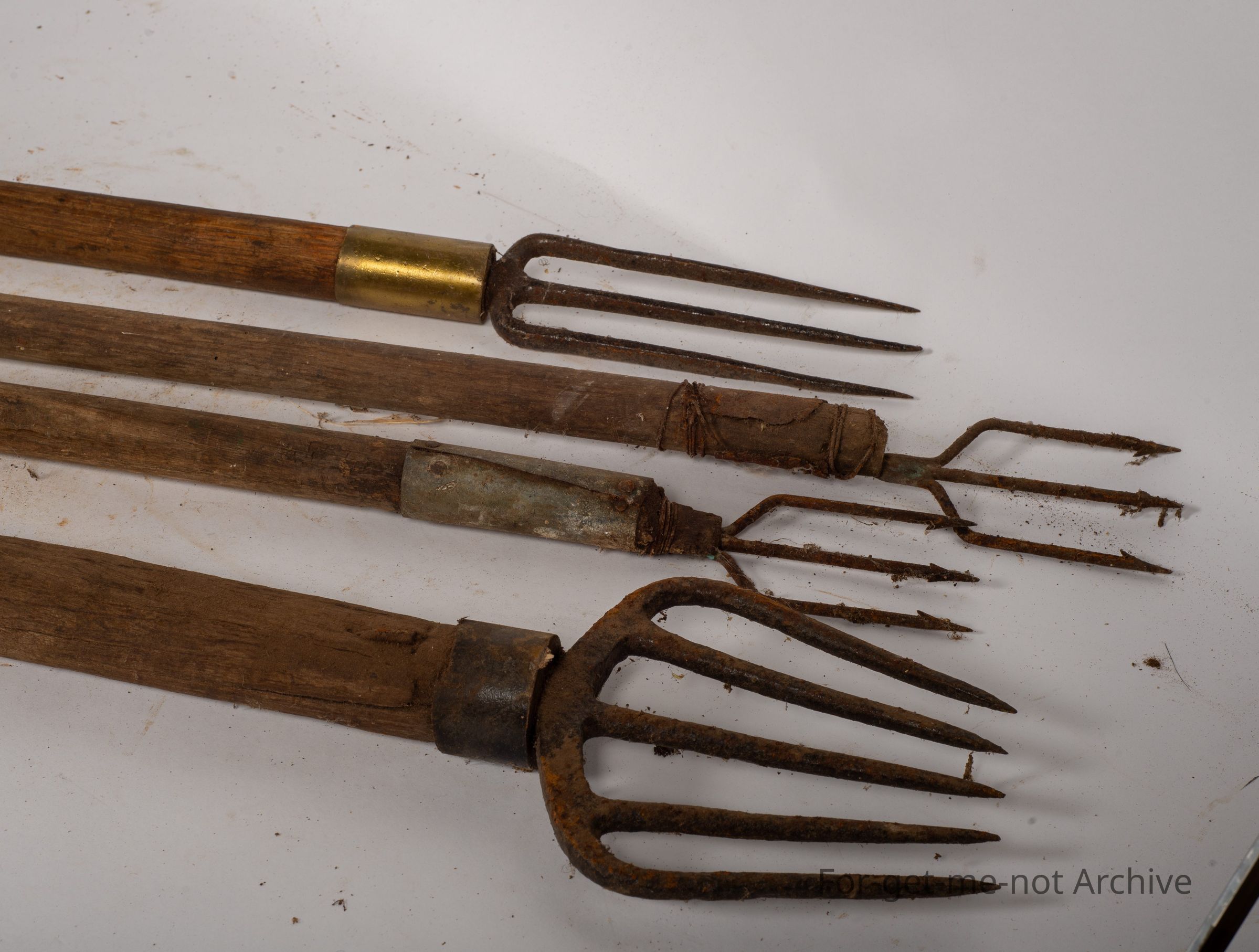 Rural of tools. These are 4 wooden handled eel spears. Quite often they were barbed on the end. These were used to, spear the eels and catch them. Usually during the day when they were virtually dormant, they were too active and moving at night, but during the day, you could see them in clear fresh water. These are quite an old and hard to find tool.Collection