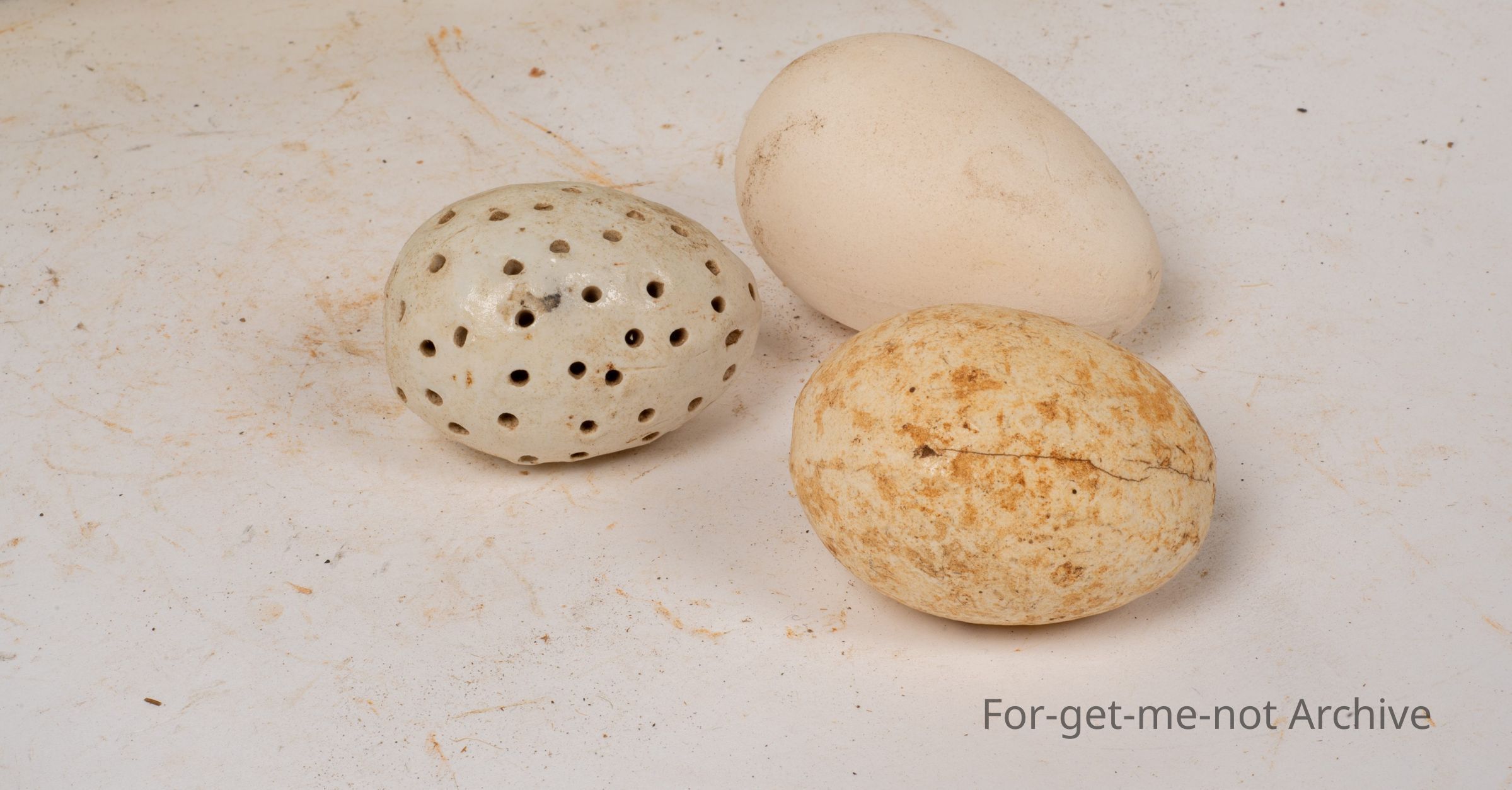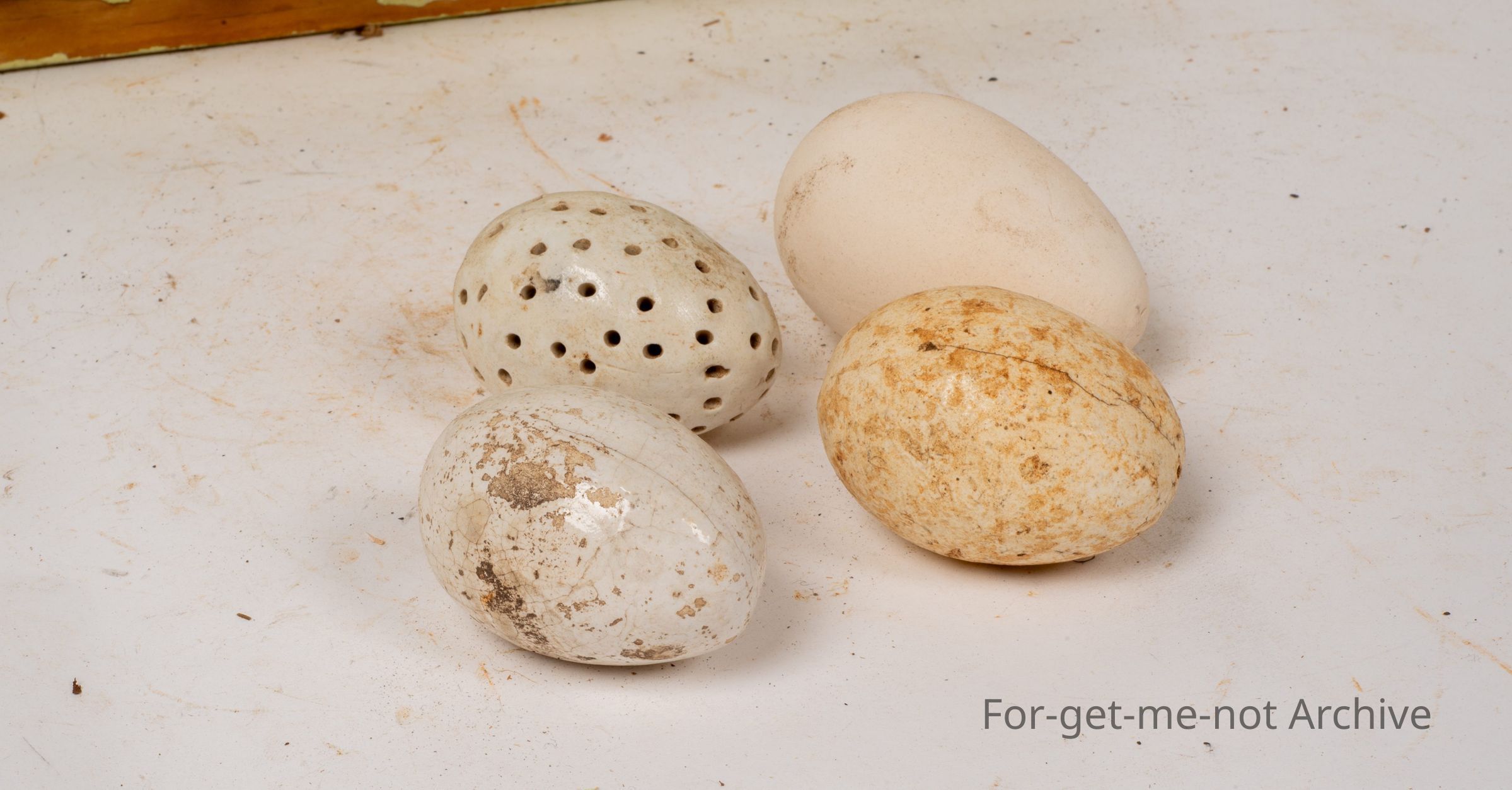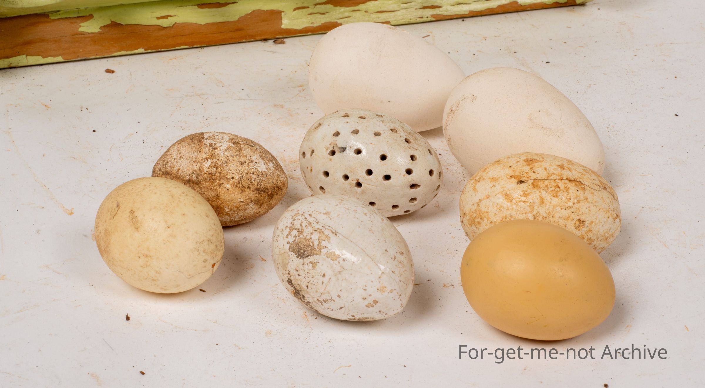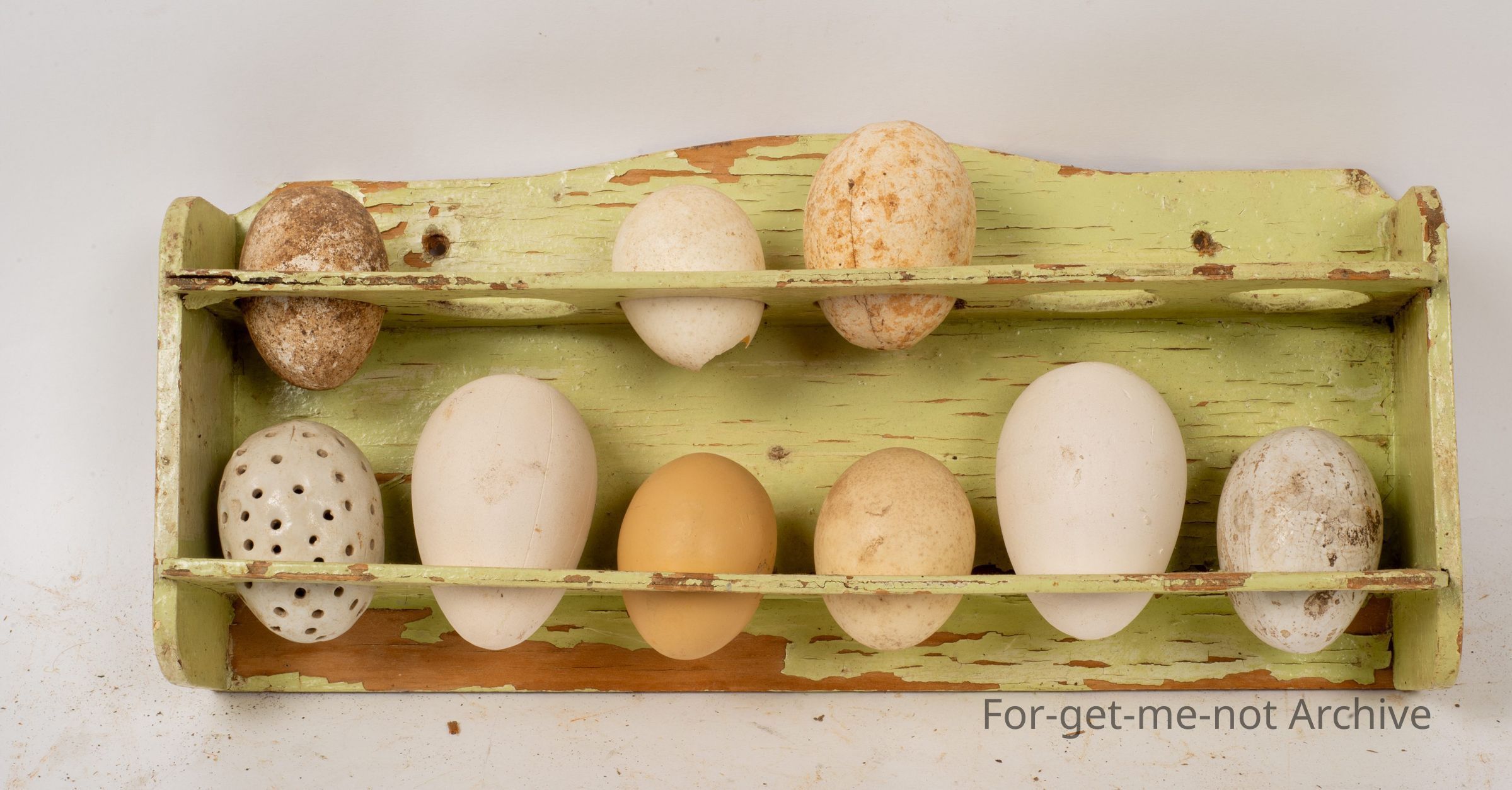 This is a homemade egg rack that holds 6, 1 dozen eggs, in 2 layers. Nice little kitchen piece that would have been put together in the twenties or thirties. The display eggs are made up of decoy eggs to get the chooks motivated to lay in the layer box and the eggs with holes a eggs that are filled with pesticide that would then transfer to the chooks when they lay eggs to kill the bugs on the chooksCollection