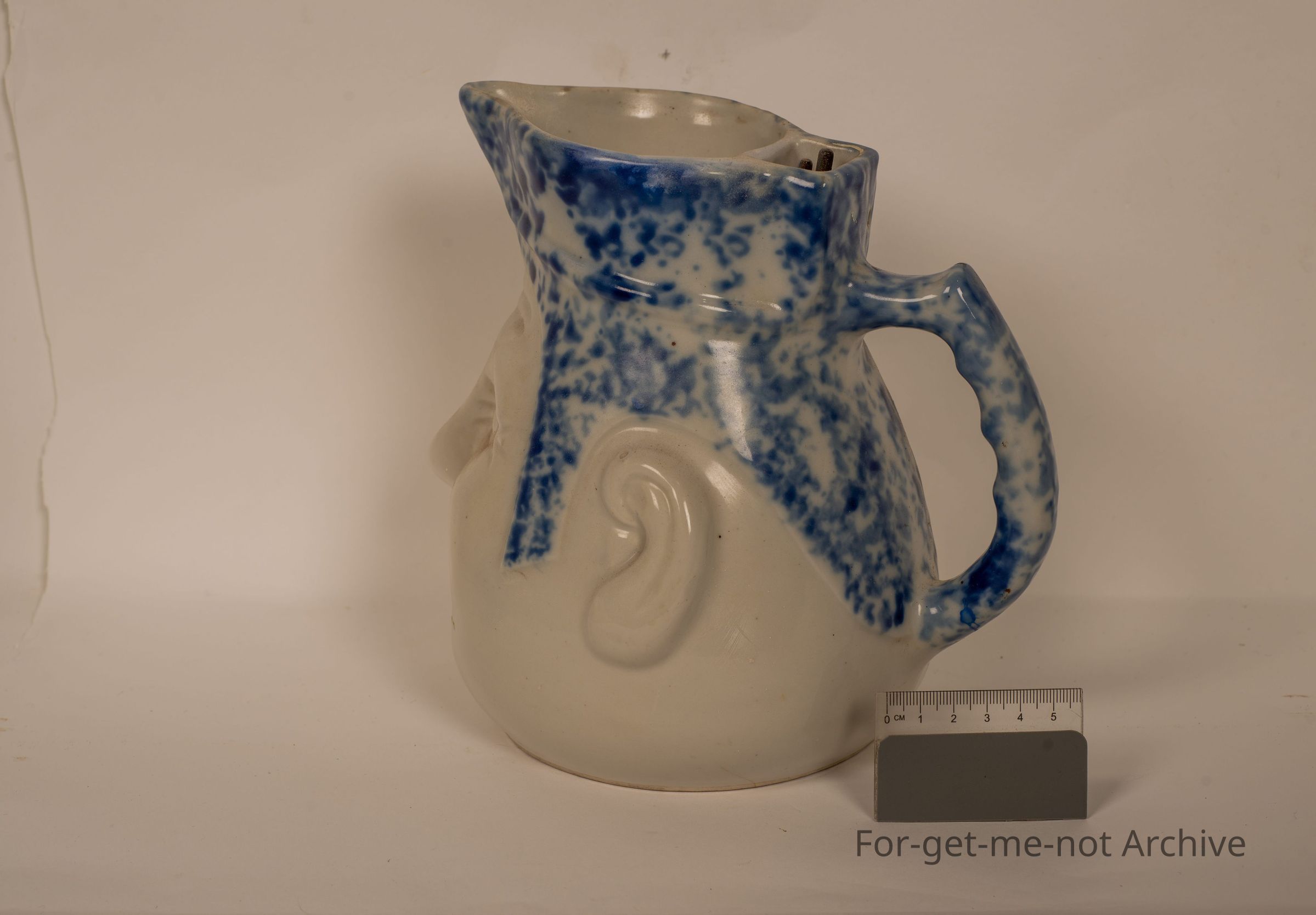 Electric ceramic jug called a face jug, with an image on the front, no lid