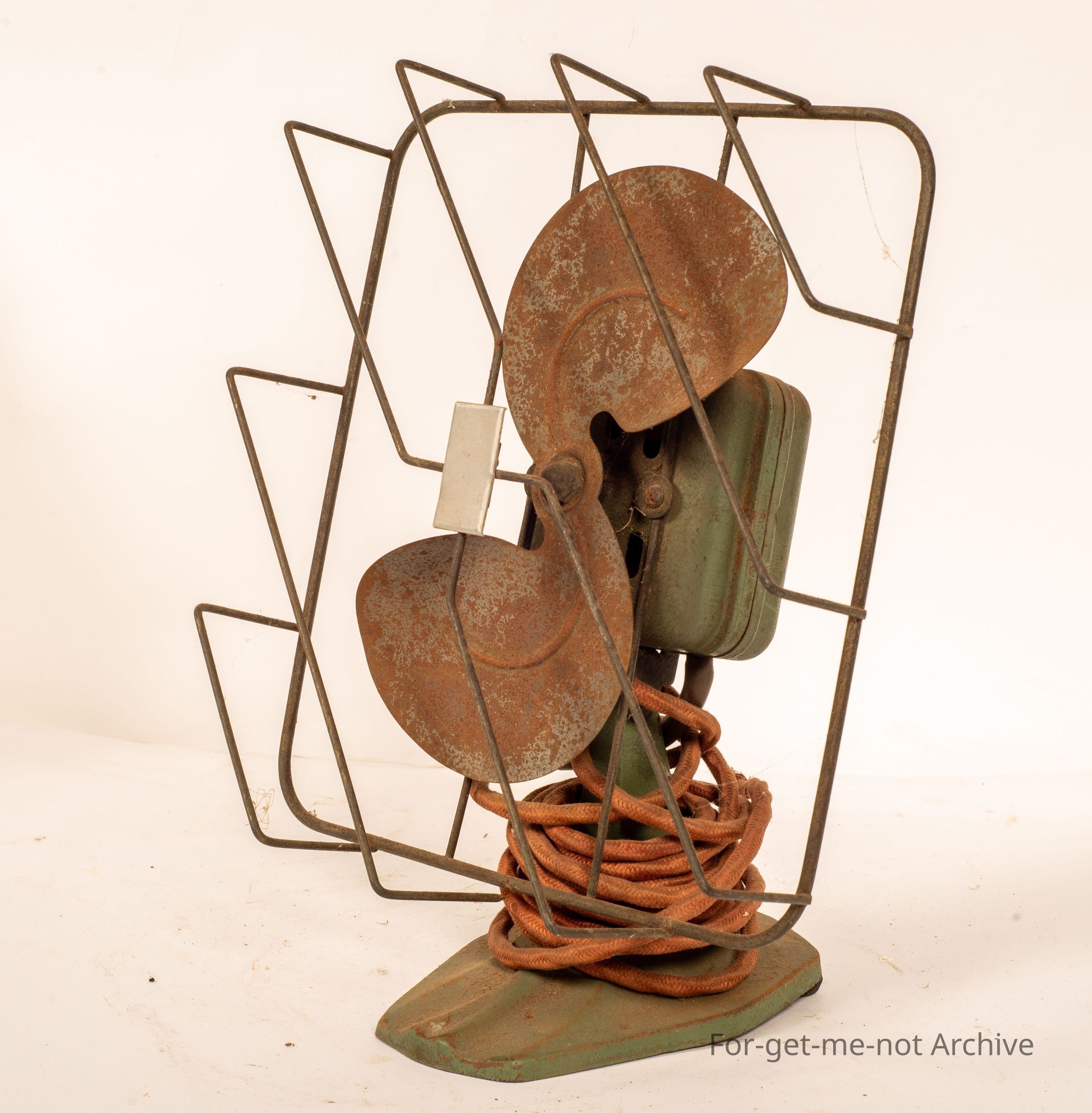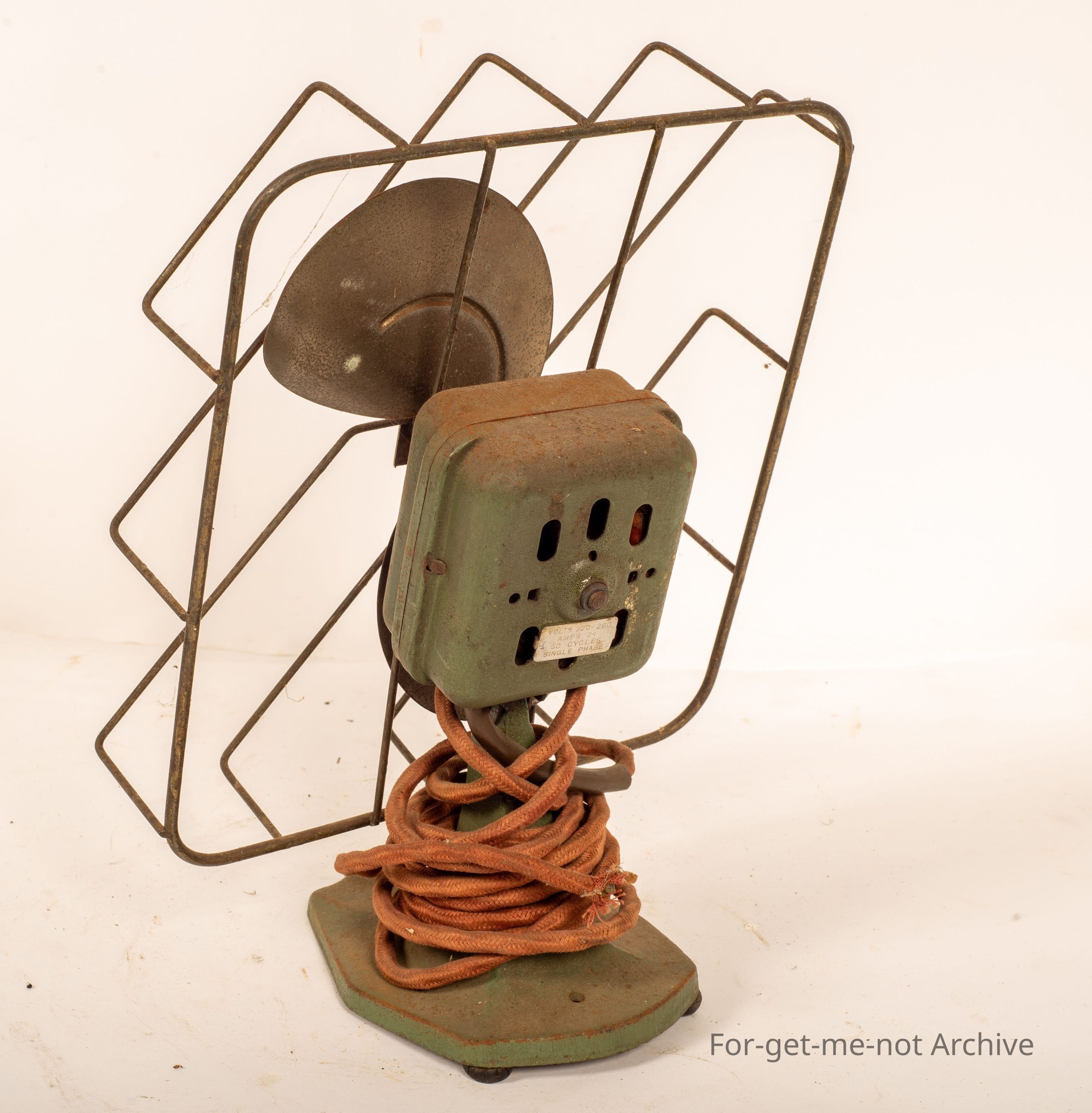 This is a delightful little household electric fan on a stand, has a wire, protecting frame, only 2 fins to the fan, has a little compliance plate, but no manufacturer's details at all. The stand holding the electric motor is cast iron. Previous electric fan with the cast iron base is manufactured by Stromberg Carlson.Collection