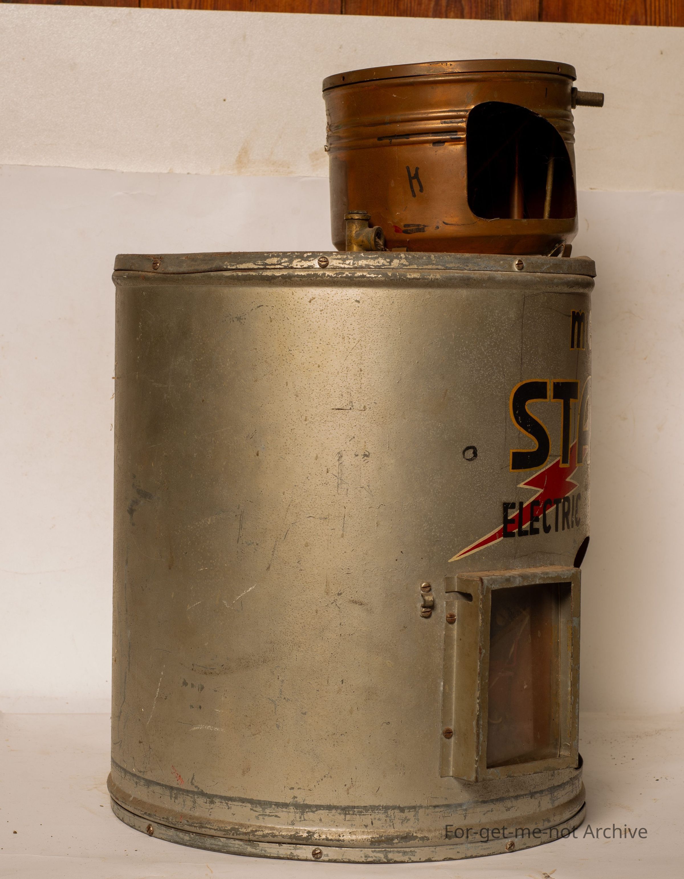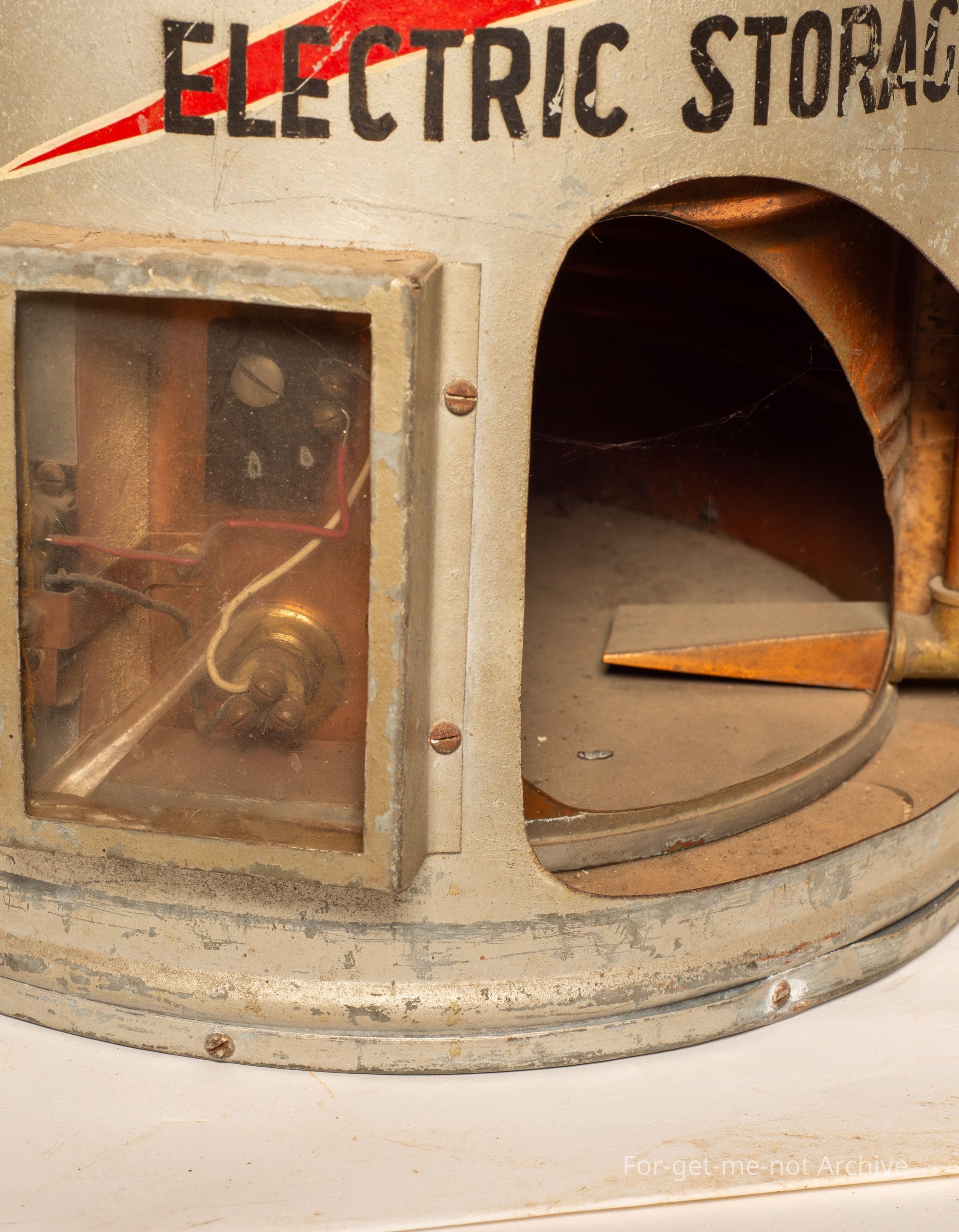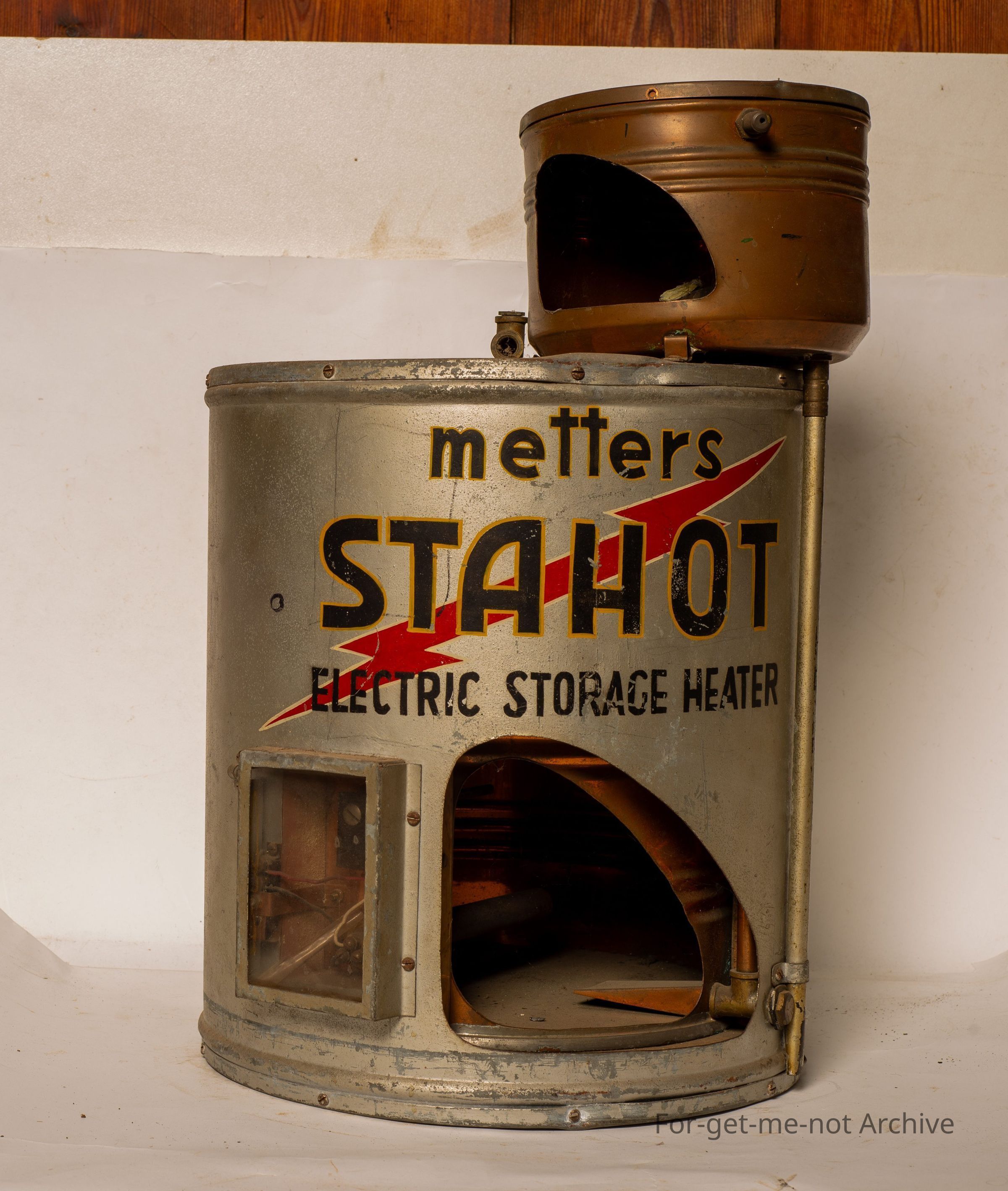This is a salesman sample of a metal Meters, Stay Hot Electric Hot Service, Hot Water Service. This is cutaway to show the element, the electricals, the top tank, so that everyone has an understanding of the construction of this thing. Rather a marvellous salesman sample of an unusual item.Collection