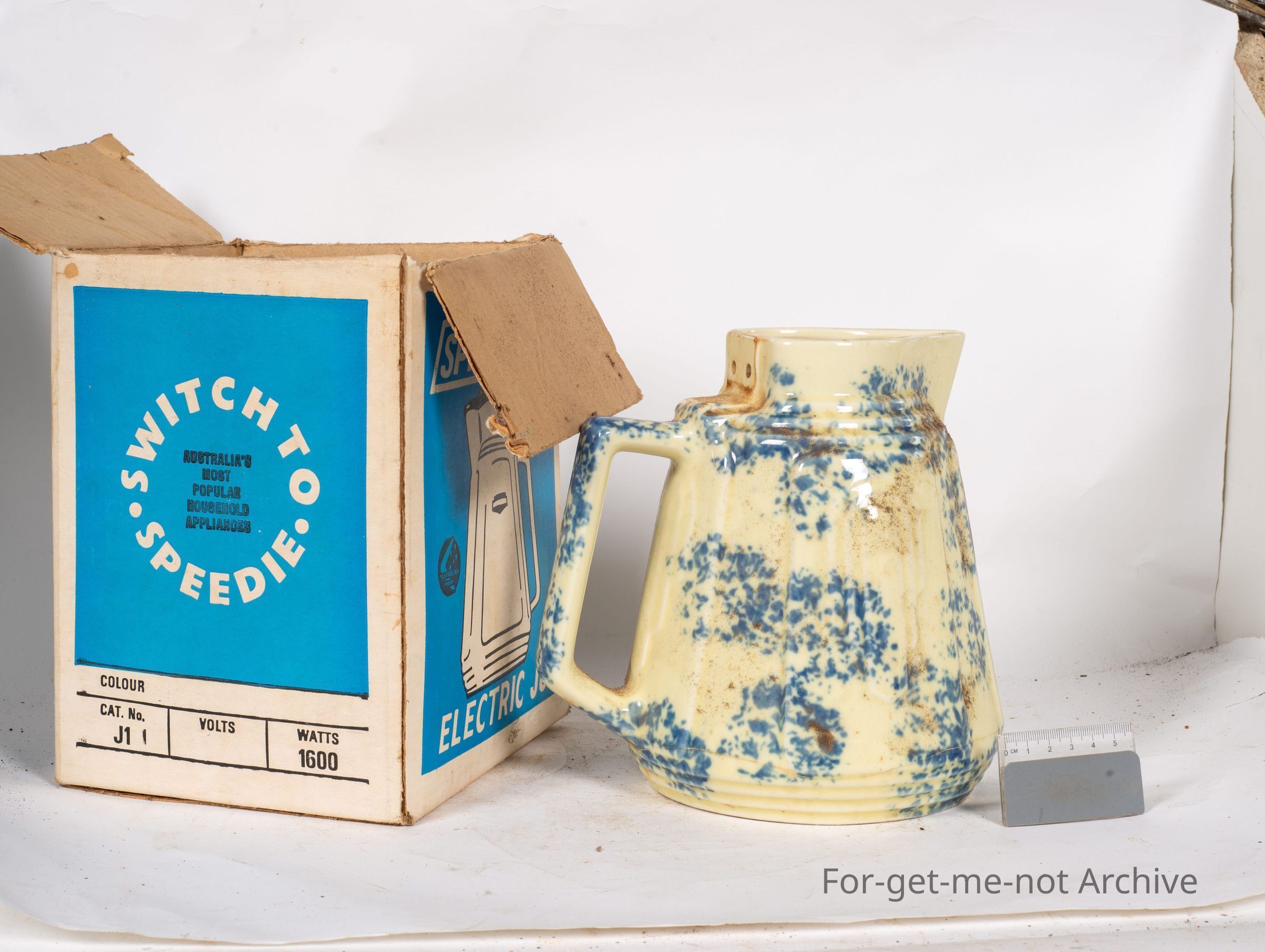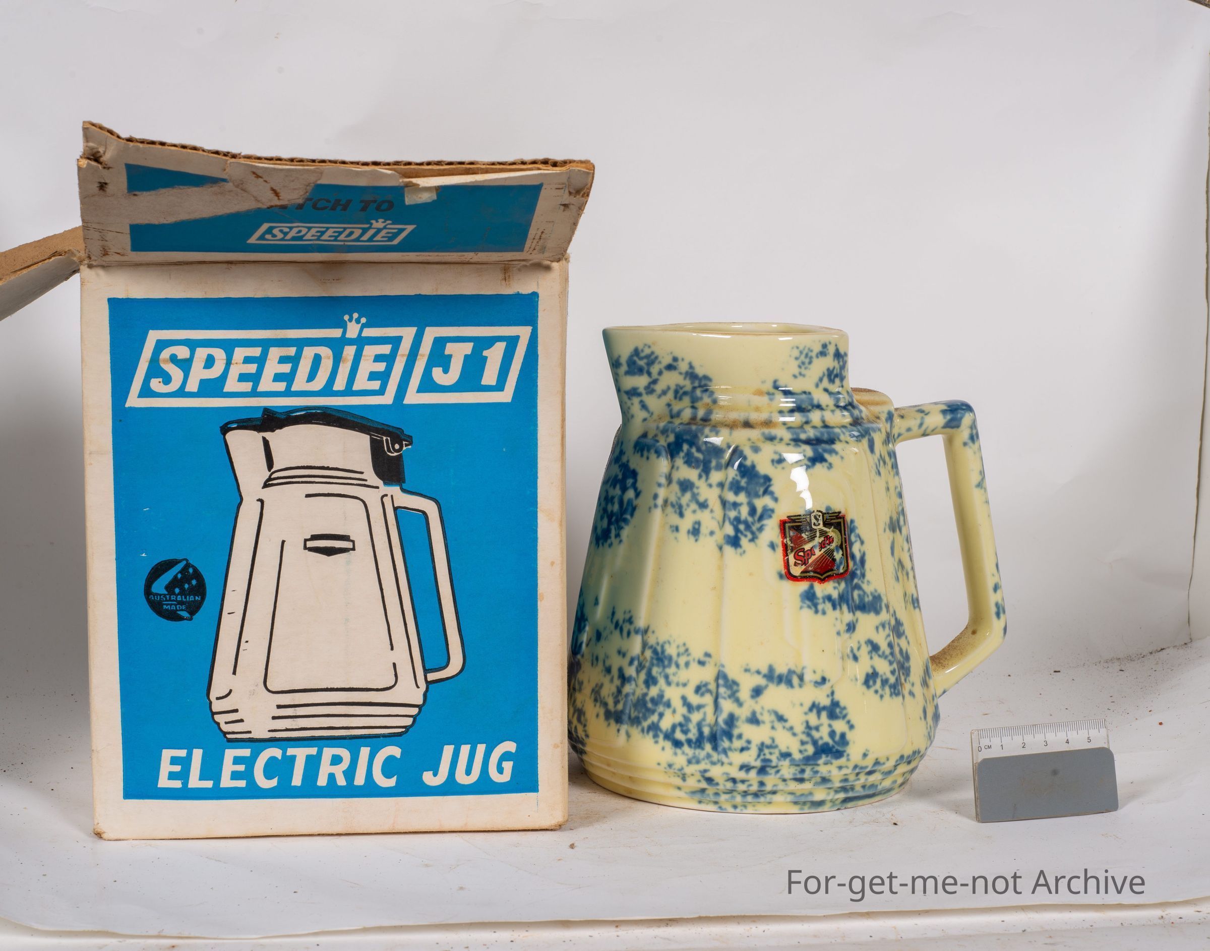 Electric jug. This jug has its, packaging box from Speedy called the Electric Jug J1. Jug is missing the lid, but it has the element jug in good order, value with the box and the jug,Collection