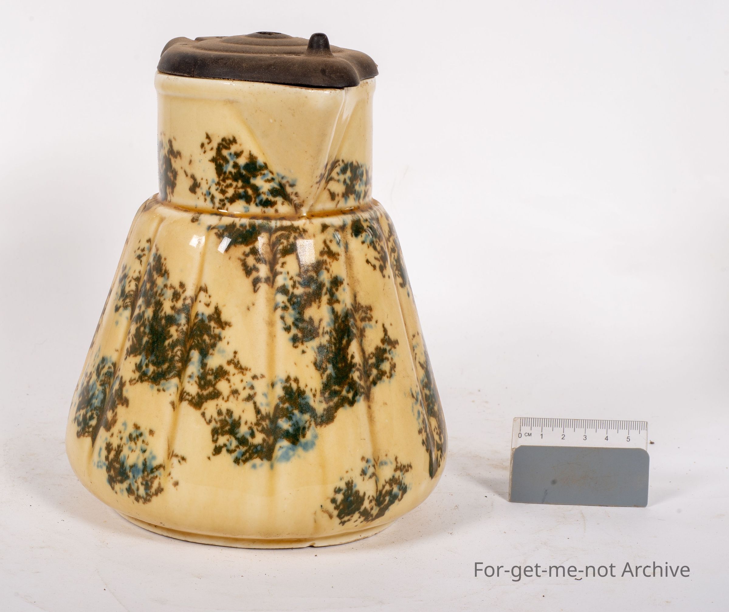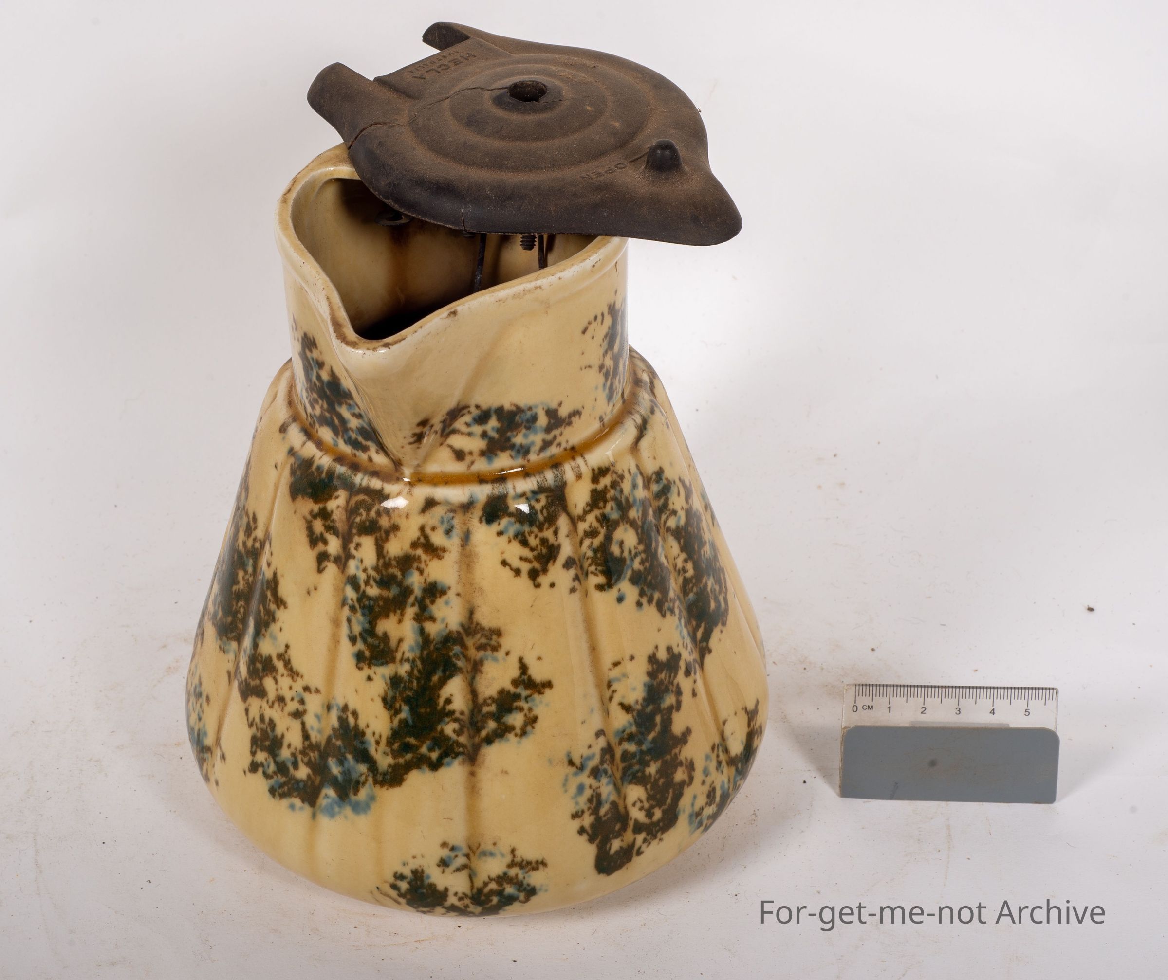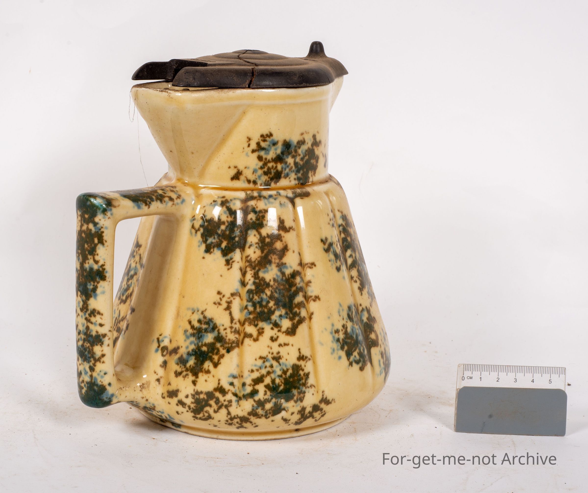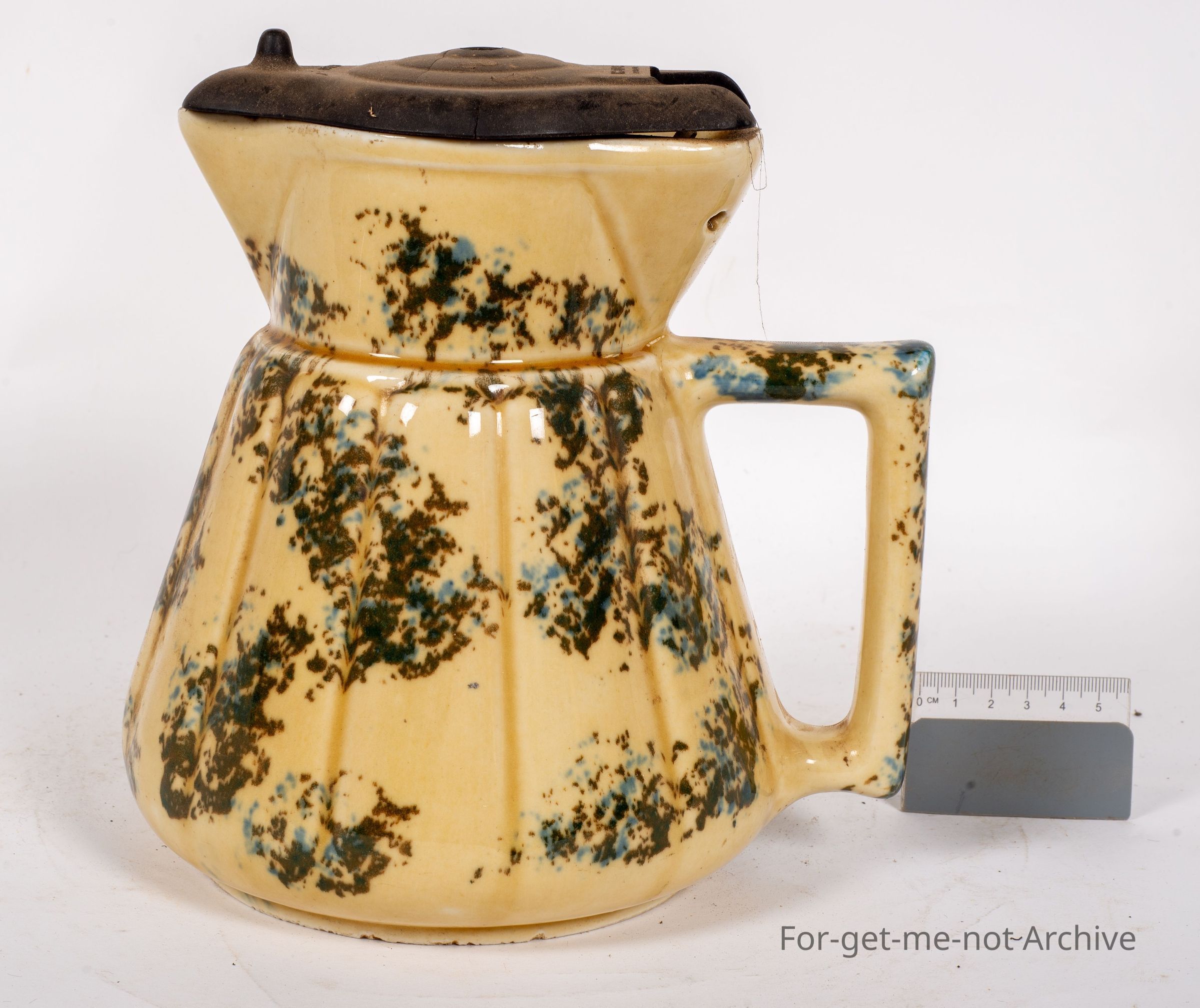 A ceramic electric jug. This one from Hecler. Has original lid, but cracked. Has the element. The body itself is in nice condition. Sponge glaze,