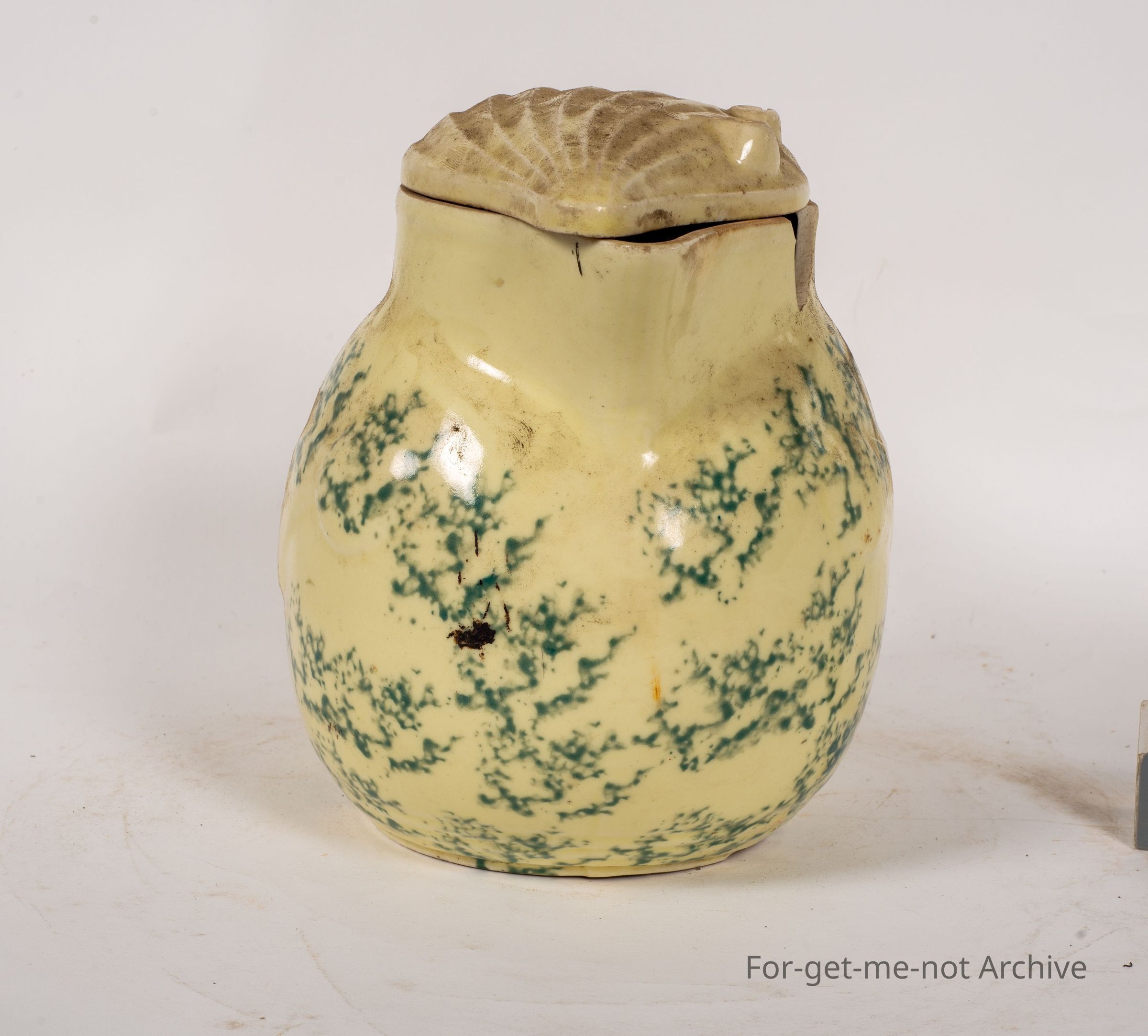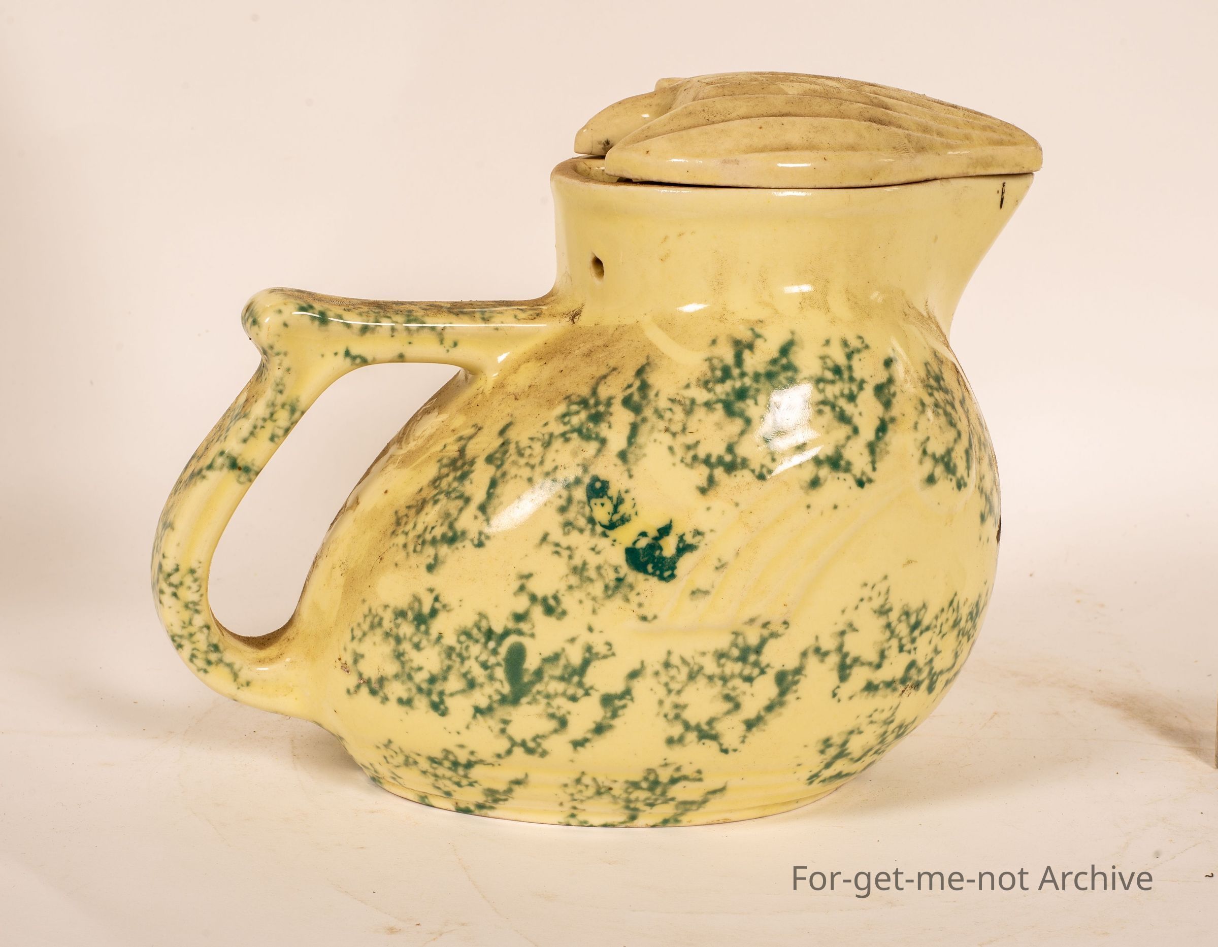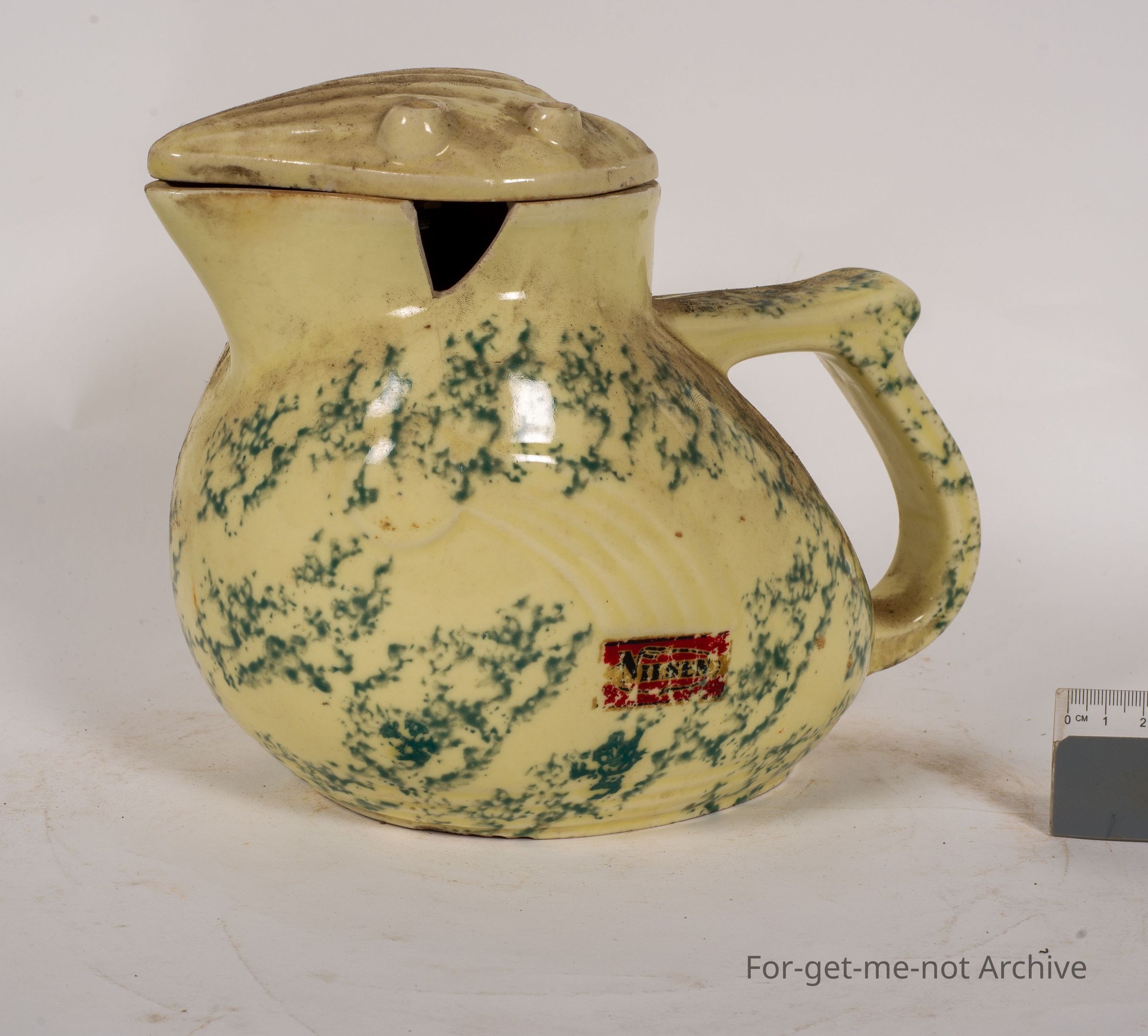Ceramic electric jug from Nilsen. This has its lid, one big chip out of the pourer, and the element is missing. Nice mottled glaze but damage
