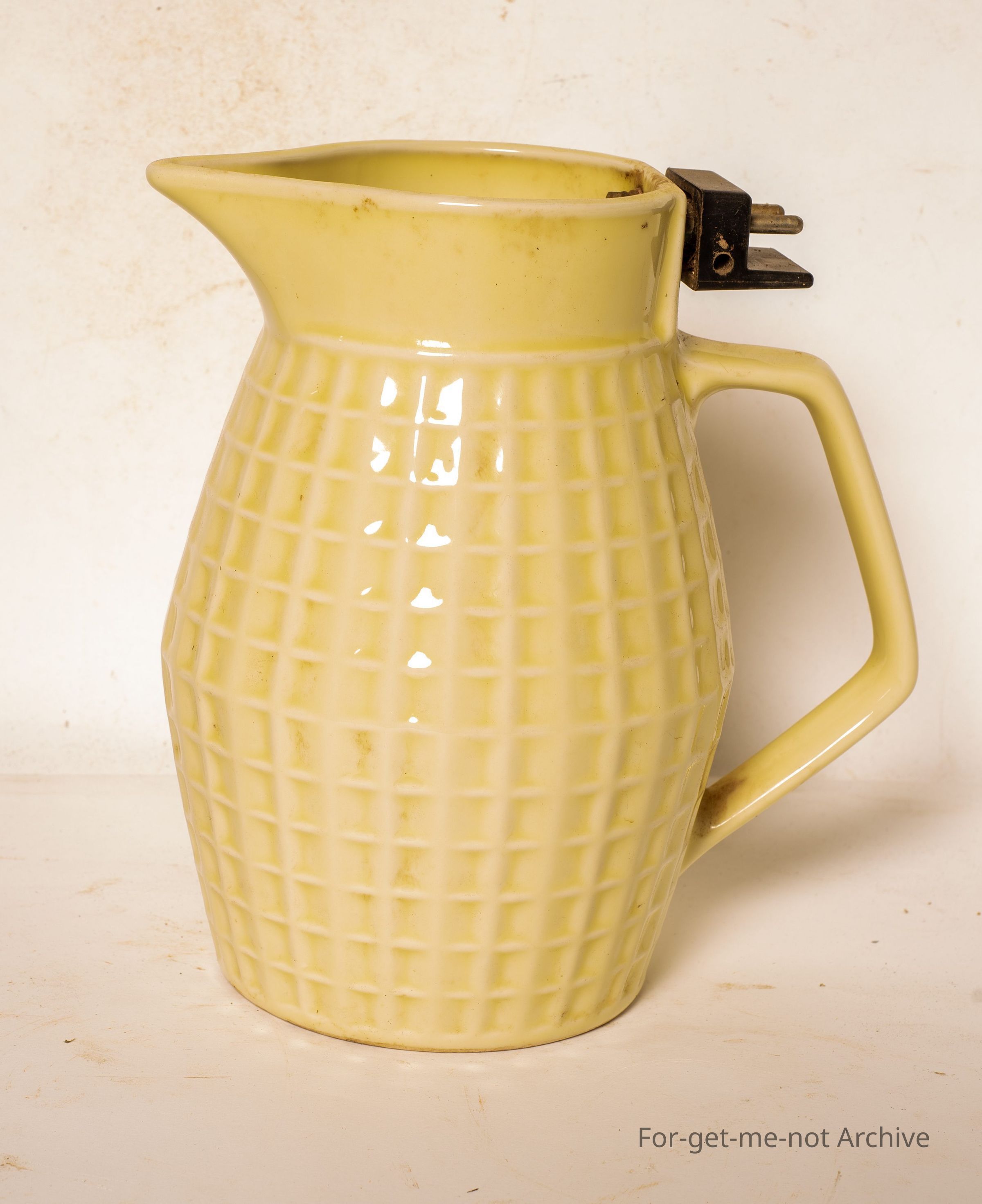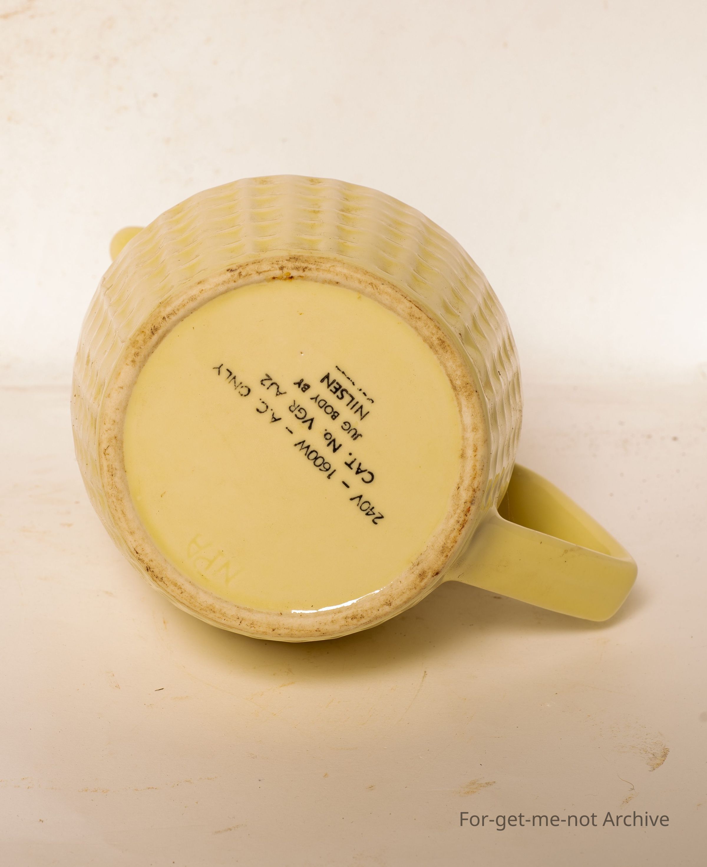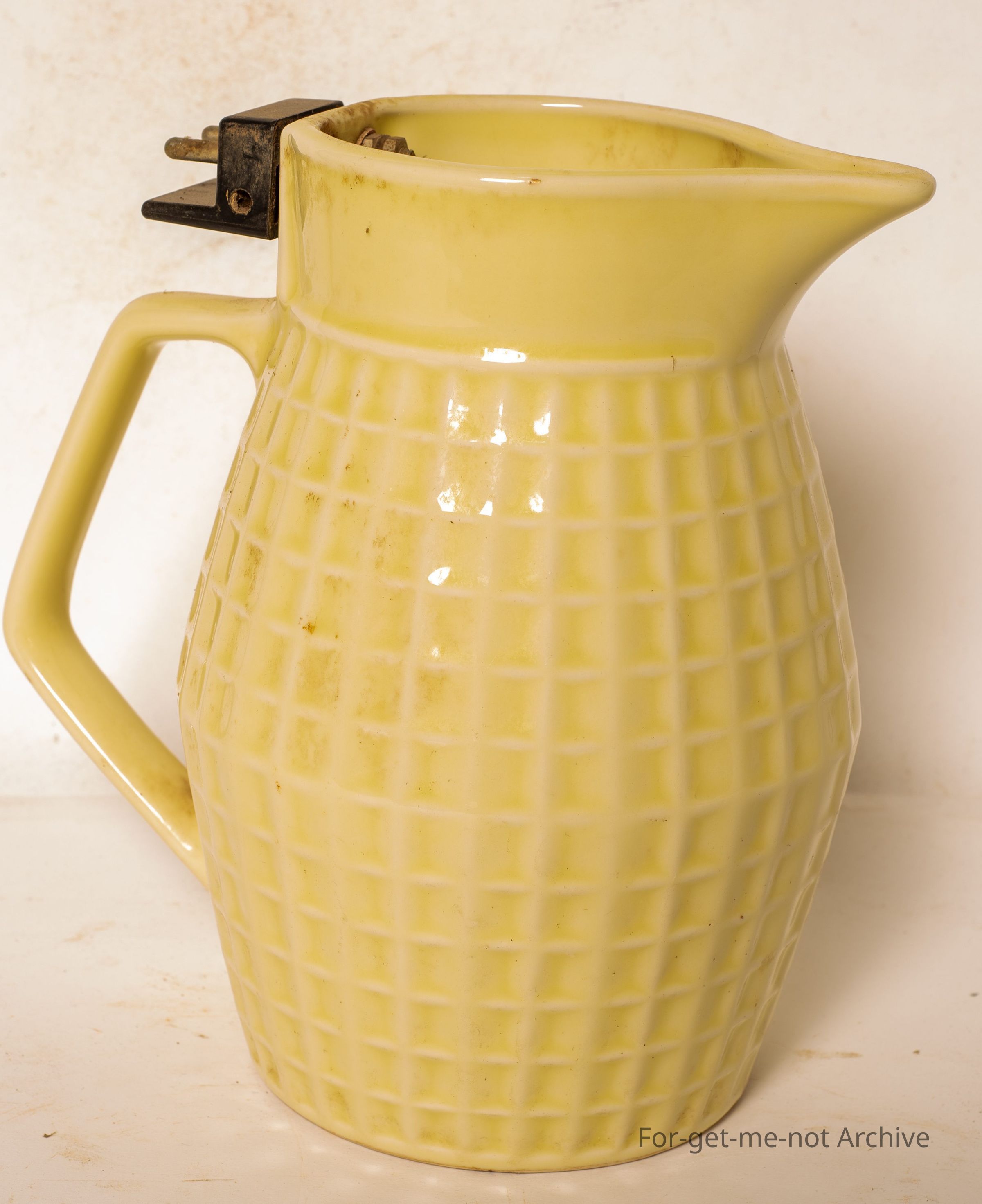 Ceramic electric jug ,square pattern, no lid, has the element made by Nielsen. Pretty common on garden.