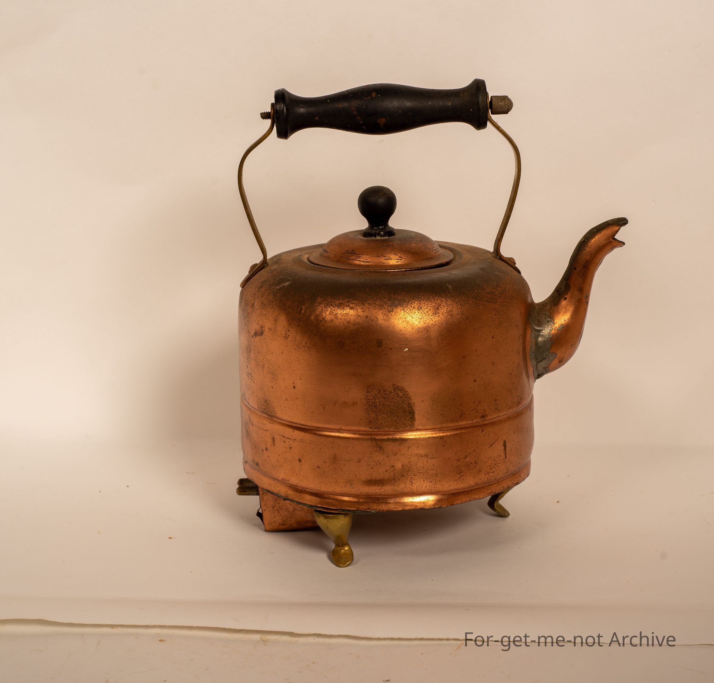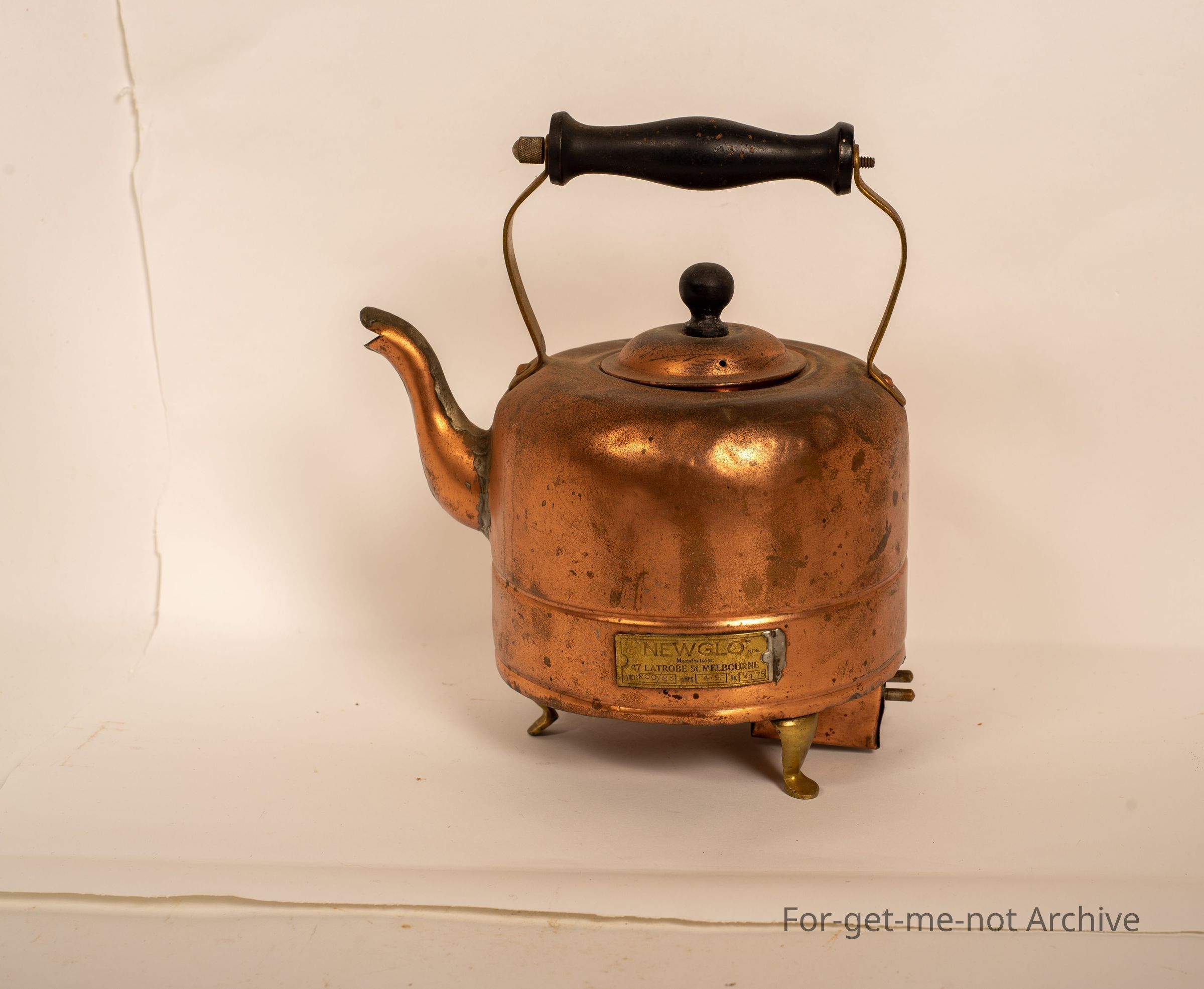 Electric kettle made by New Glow, Latrobe Street, Melbourne. Coppery colour, wooden handle.