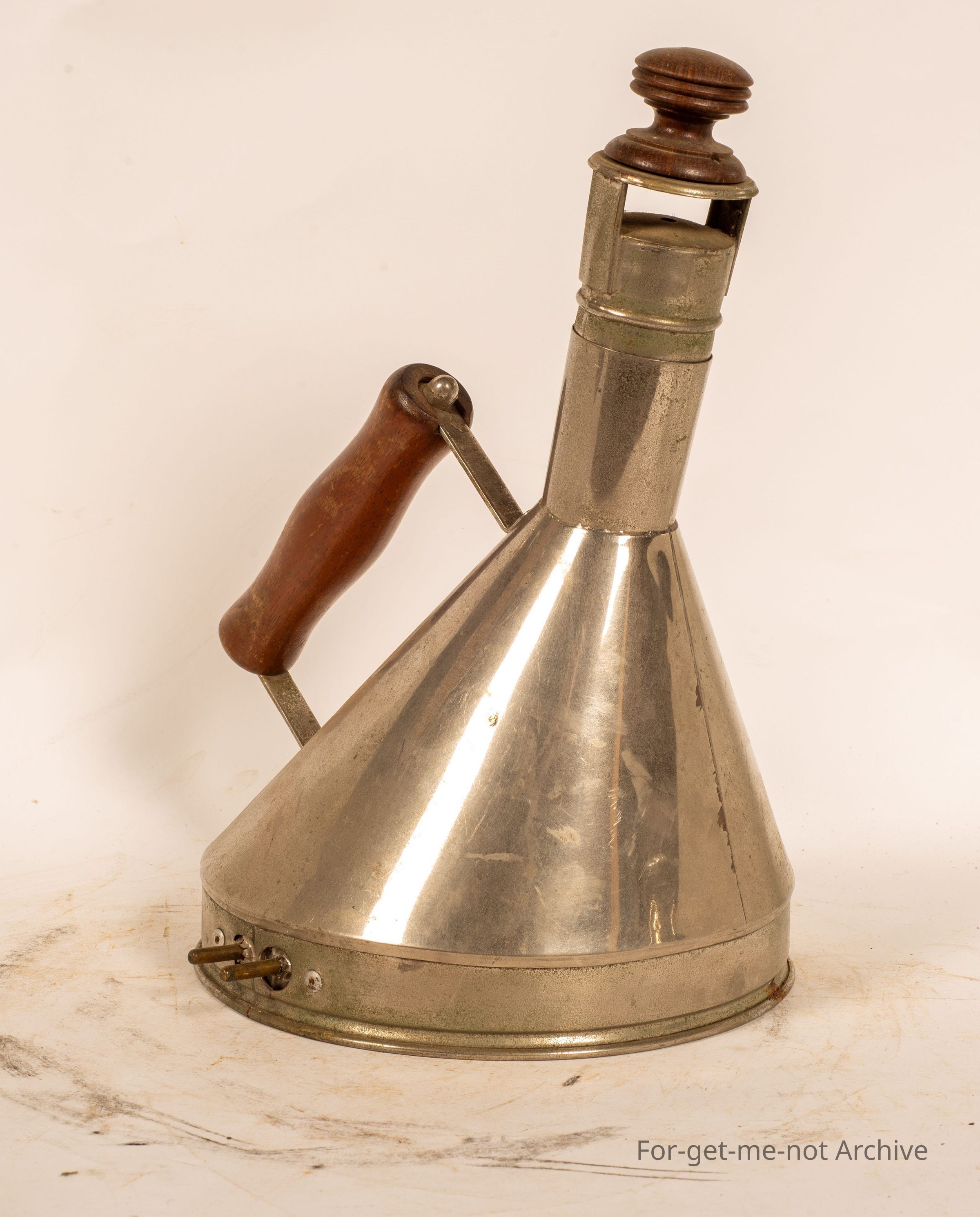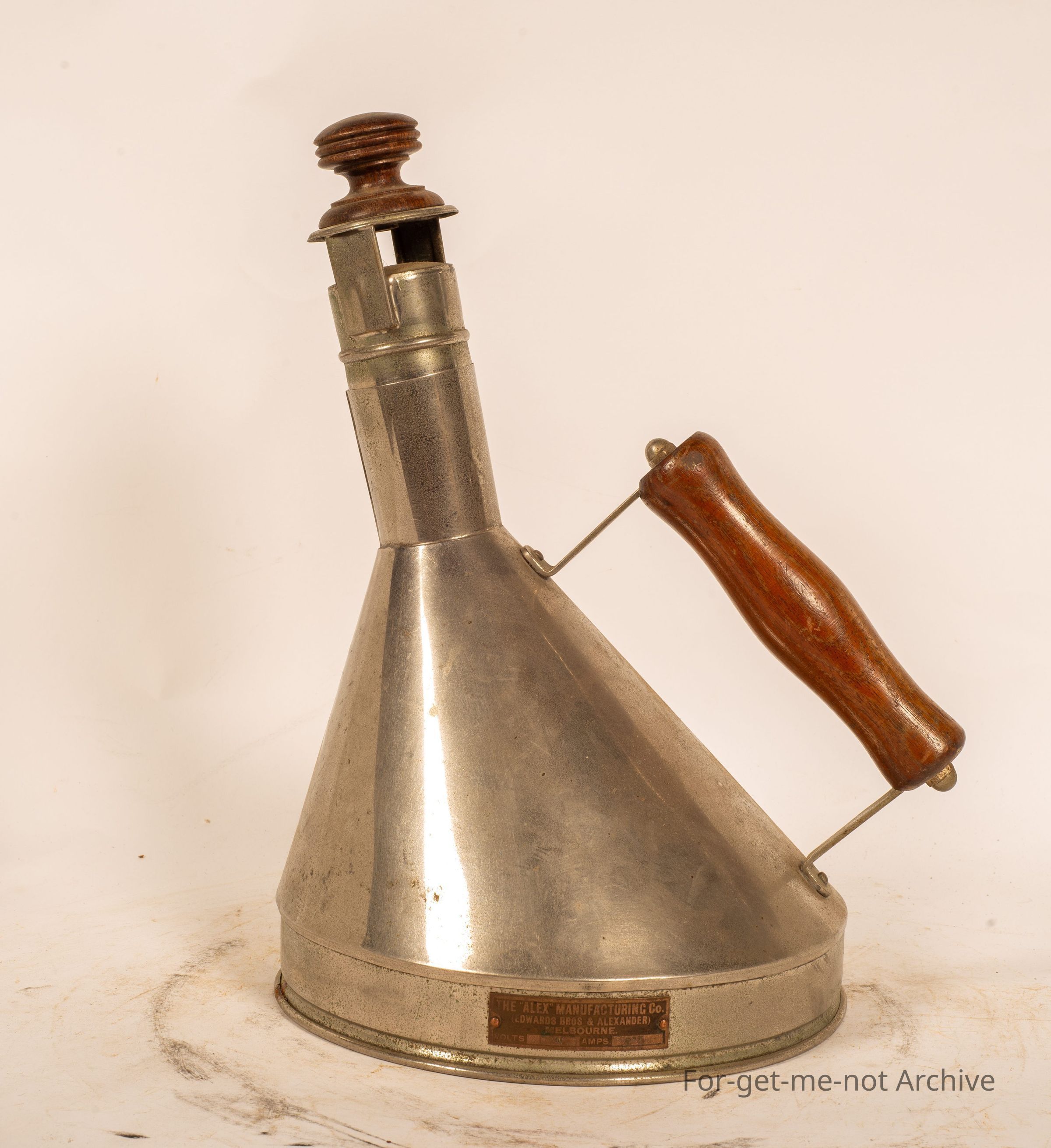 This is a very, designer kettle, electric, a wooden handle on the side. The most unusual thing, it has a long vertical spout with a built in whistle and, the very end of that pulls in and out for as a puller. This is made in Melbourne called the "Alex" manufactured by Edwards and Alexander , Melbourne. Most unusual piece.Collection