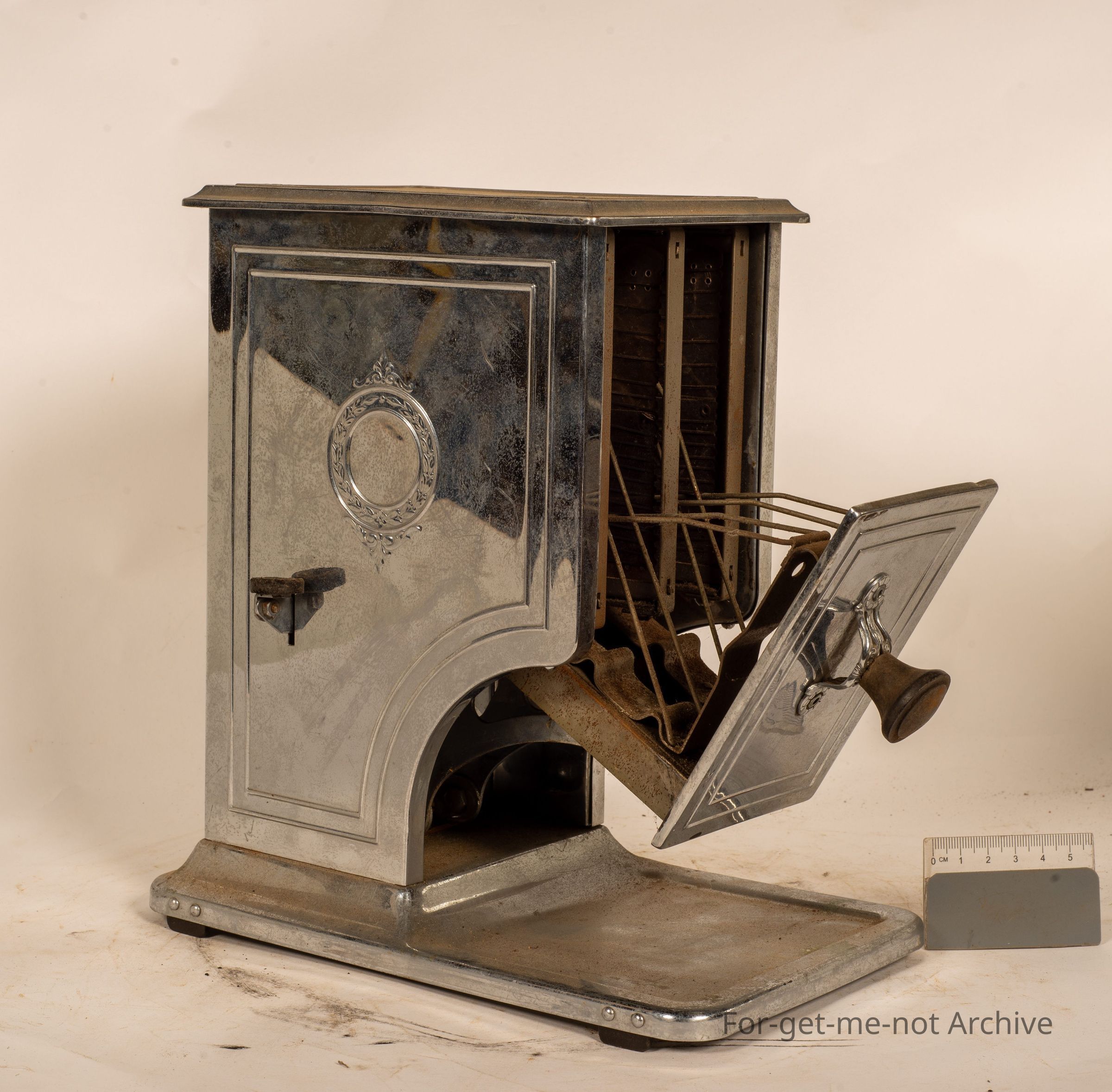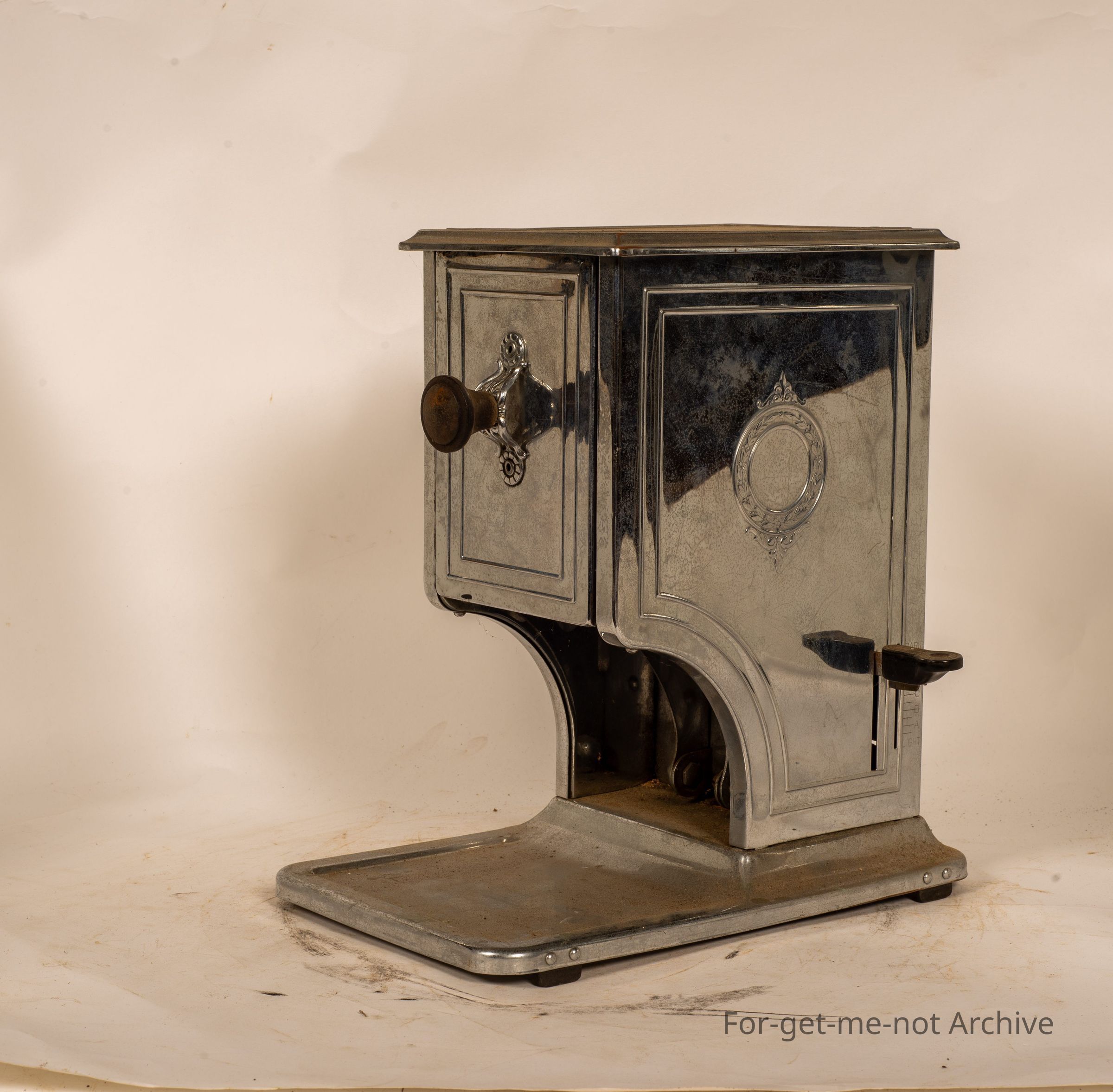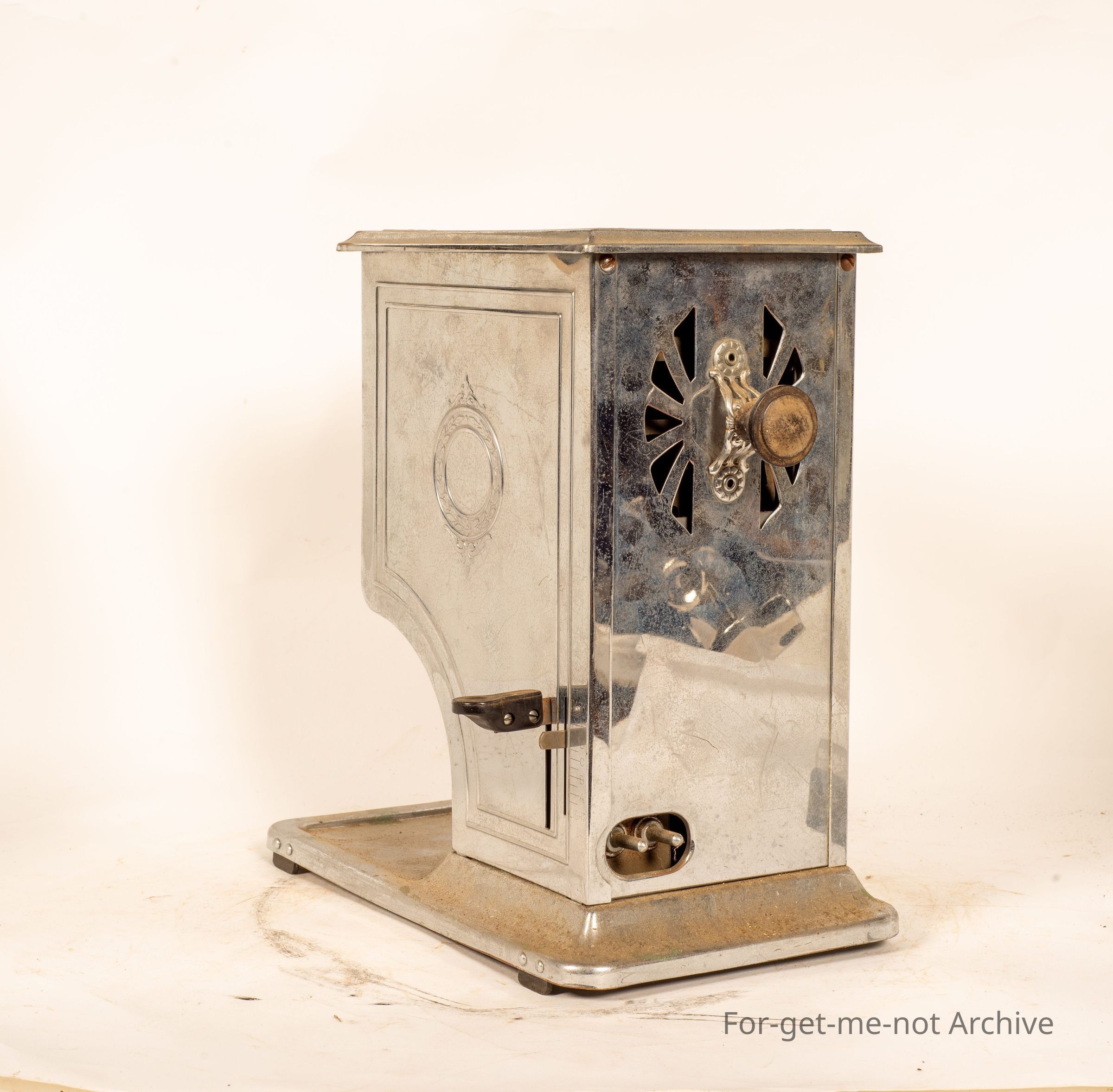 Metal Electric Toaster. This is of a most unusual design. A lever at the side to open the toaster. Two pieces of bread at once. This toaster has a built in timing clockwork which you wind up by pressing a lever up and down. A very American piece made by Universal Landers, Frey and Clark, Connecticut, USA.Collection