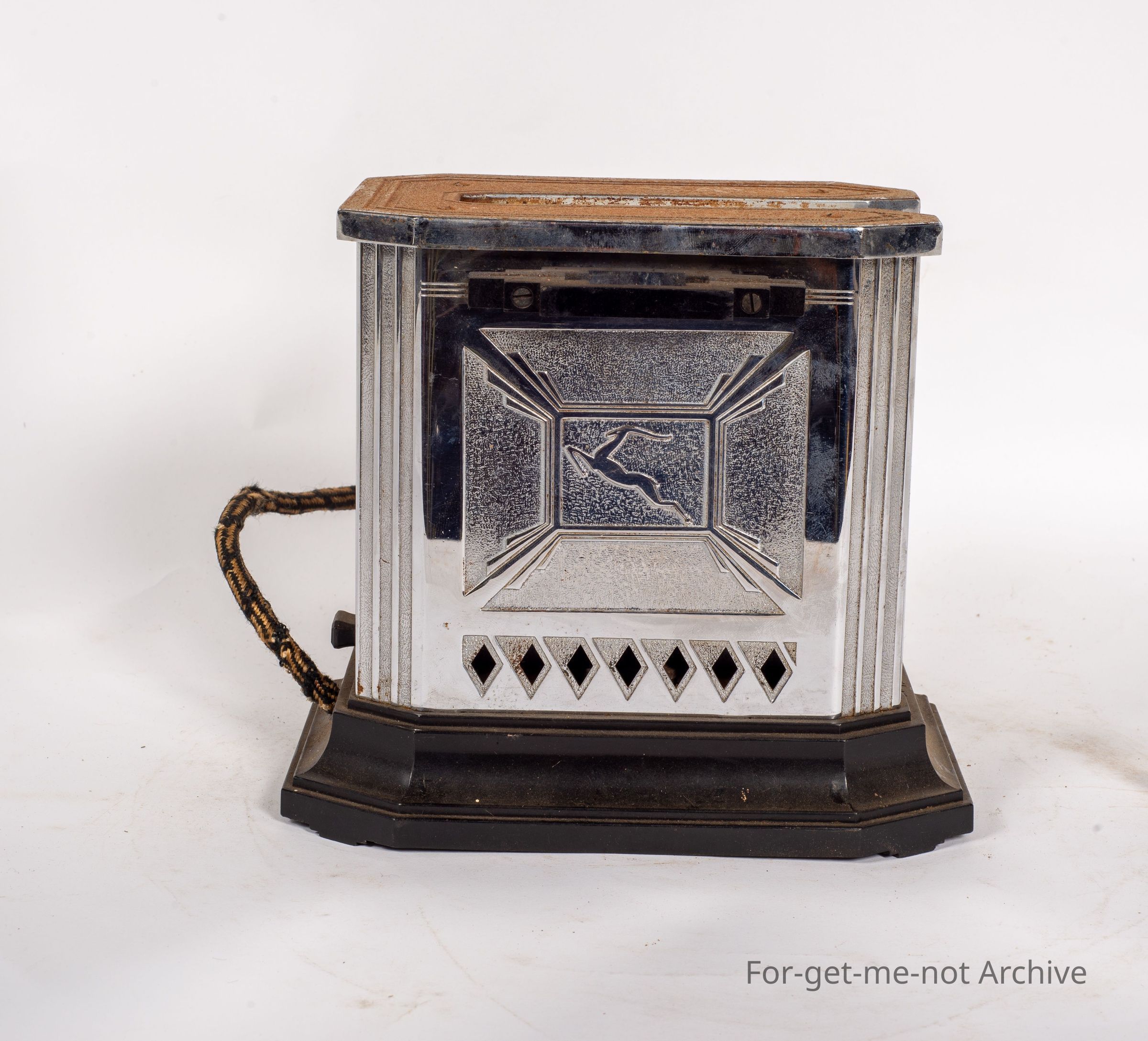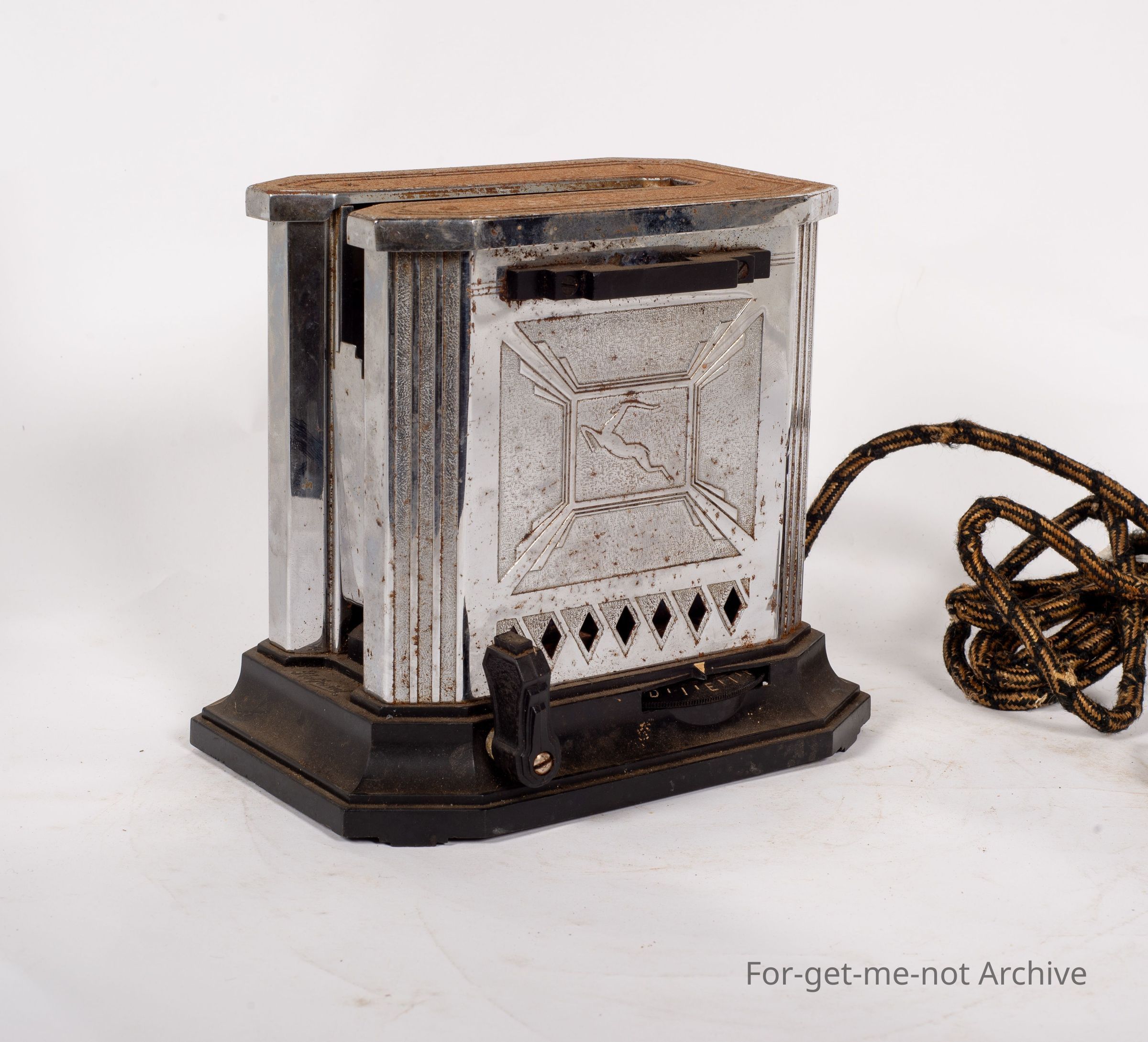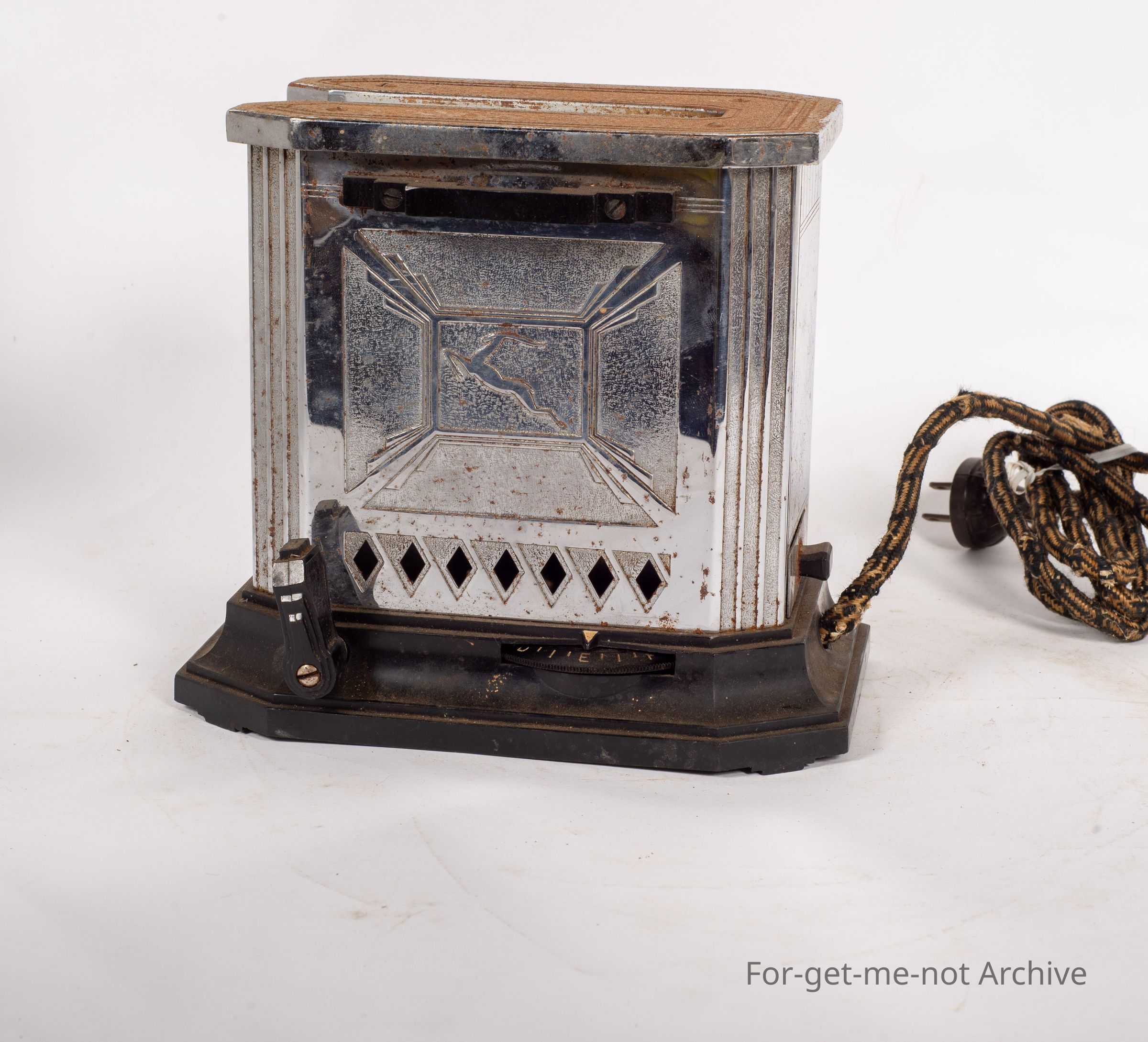 Another electric toaster. This time only a single piece at once. Has an elaborate mechanism underneath for getting the toast out. Quite an over engineered piece. American, of course, with John Deere, embossed into the front. No further information. Oh. It is Stamped Luxe Clock Manufacturing, Connecticut, USA. The Luxe Toaster has a timer mechanism incorporated under the toaster. Hence the extra engineering.Collection