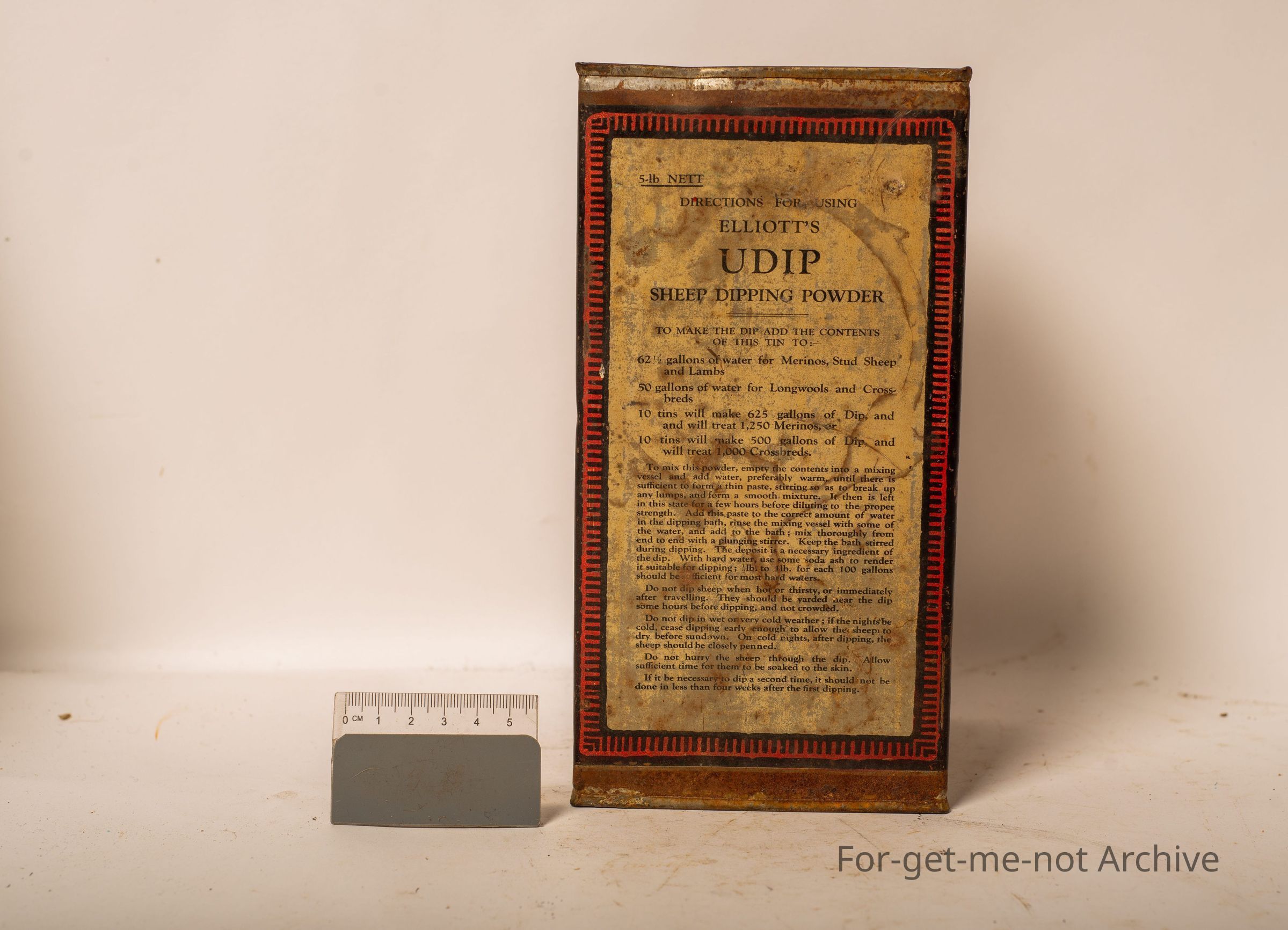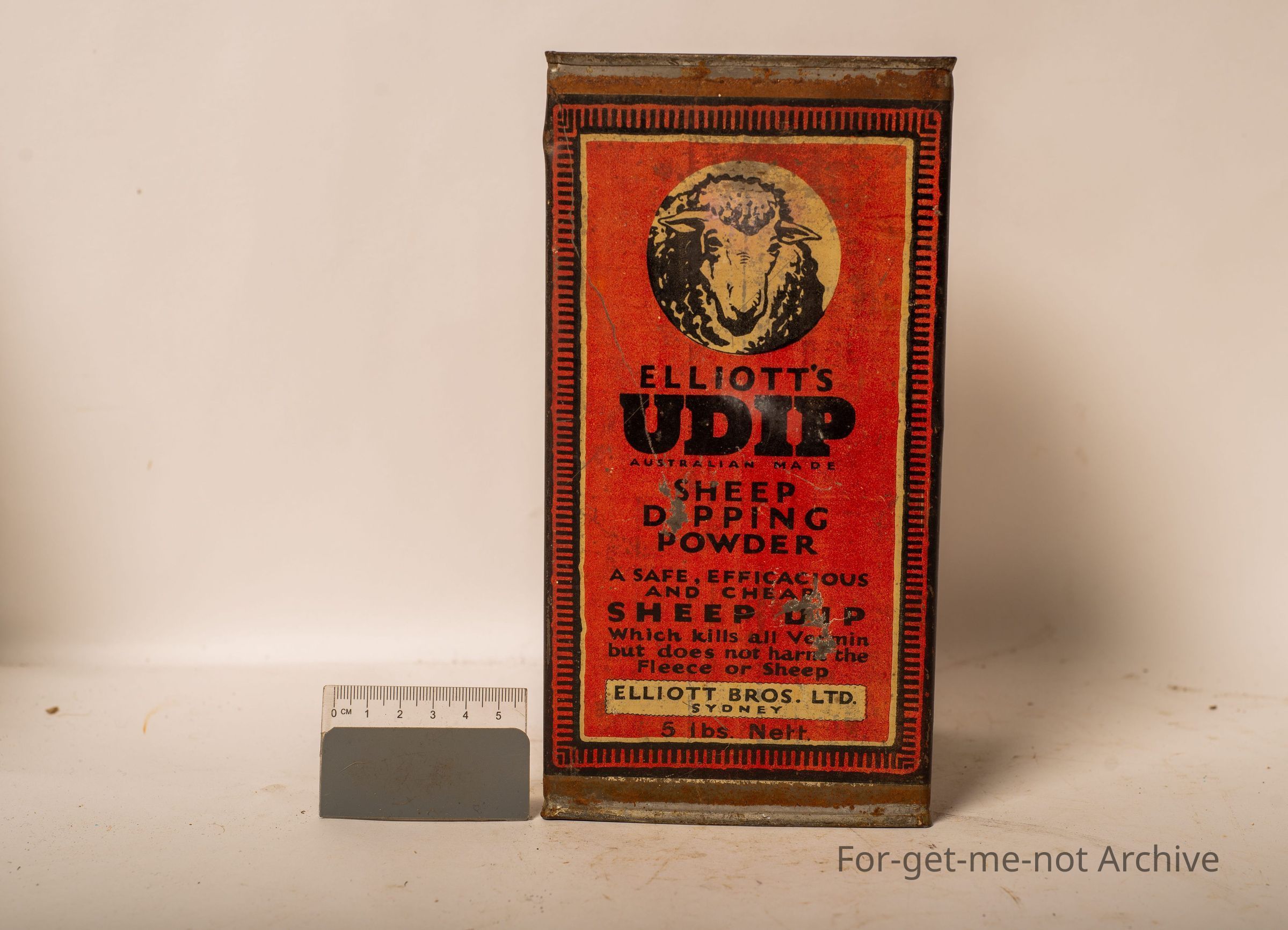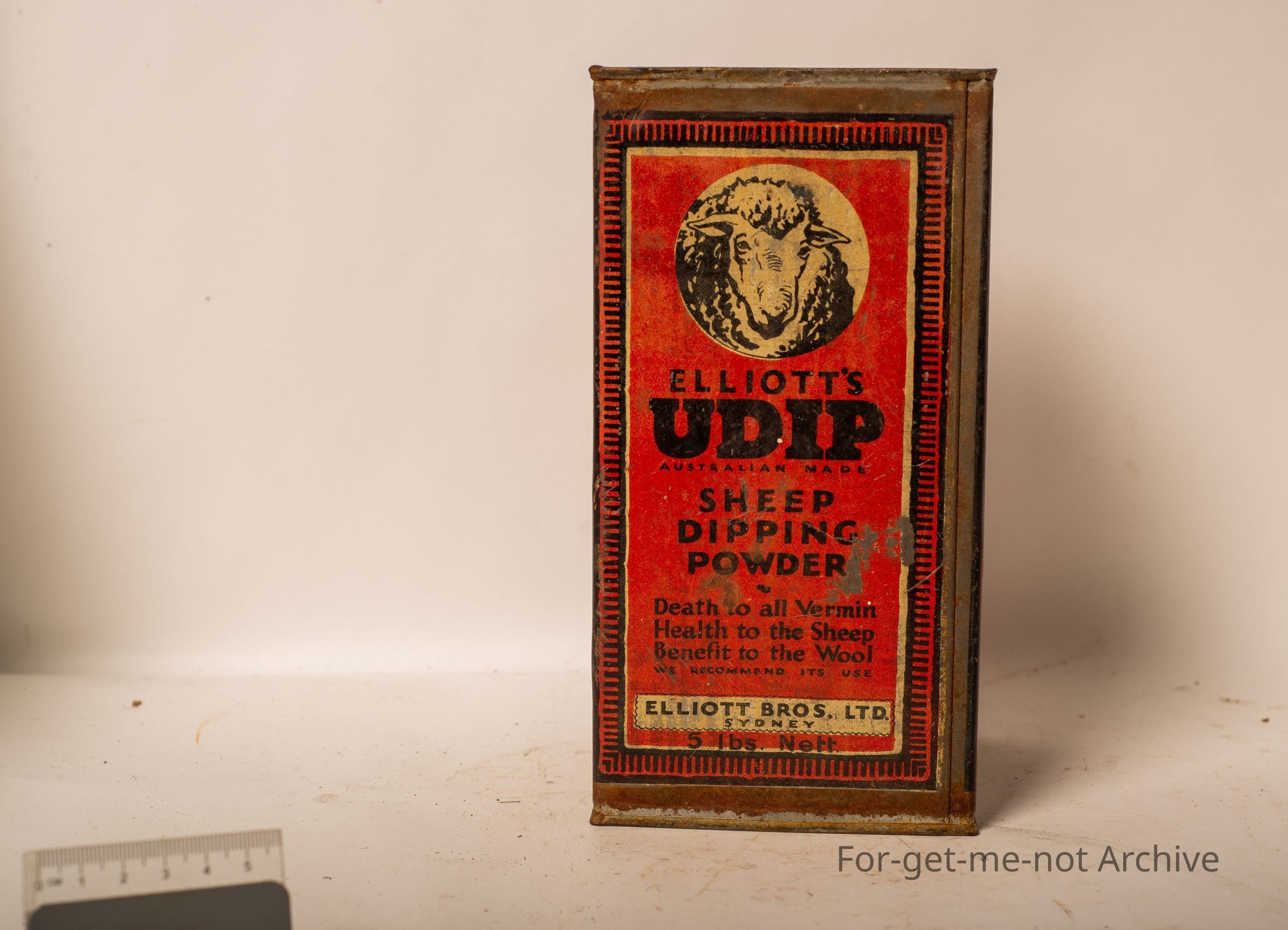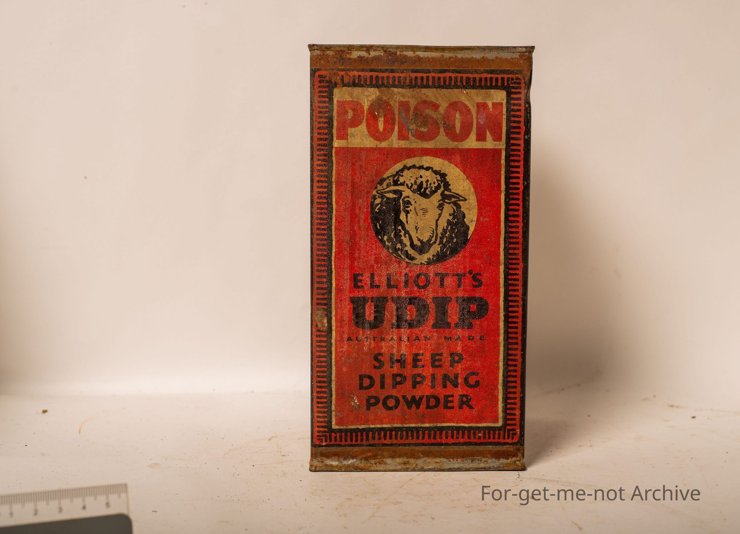 This is rather a marvellous tin, made by Elliot's U-dip. Sheep dipping powder, 5 pound capacity. Elliott Brothers Sydney with images all the way around the tin, and considering what it is, it's in good orderCollection