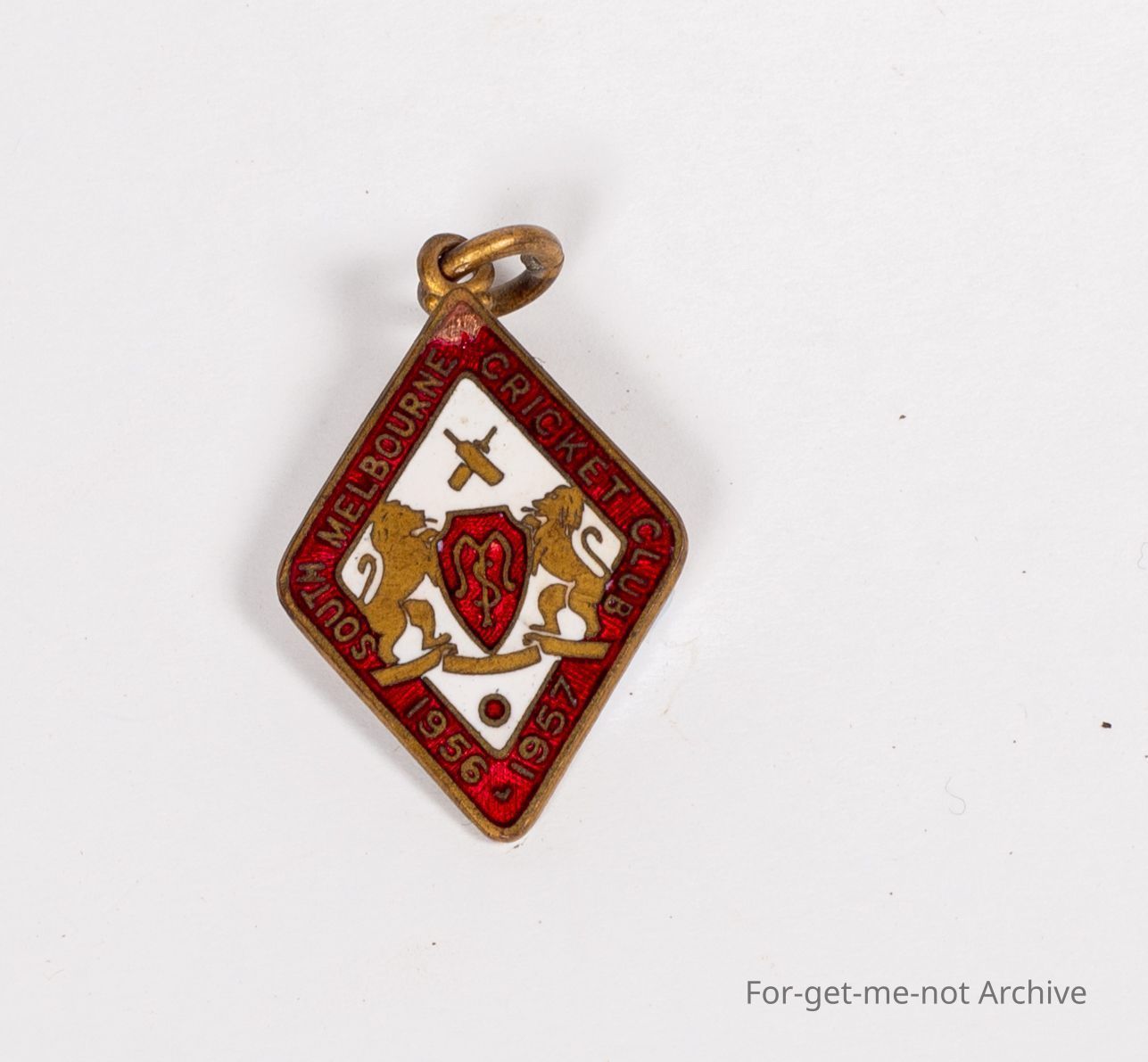 Cricket related, enamel badge. Cricket related enamel badge, , South Melbourne Cricket Club season 1956, 57, a small coat of arms with cricket bats in very good condition.