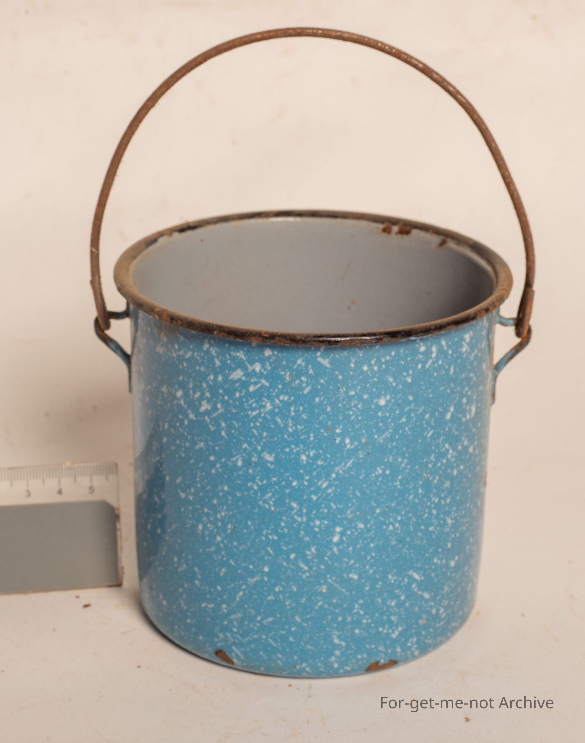 This is a lovely small size enamel billy. Gray enamel inside, freckle, white blue on the outside with handle value.