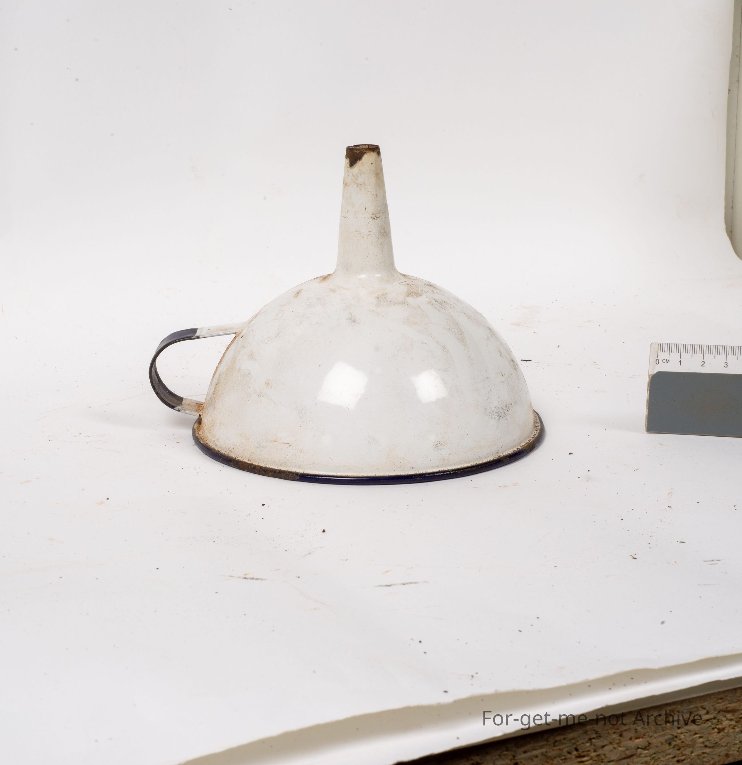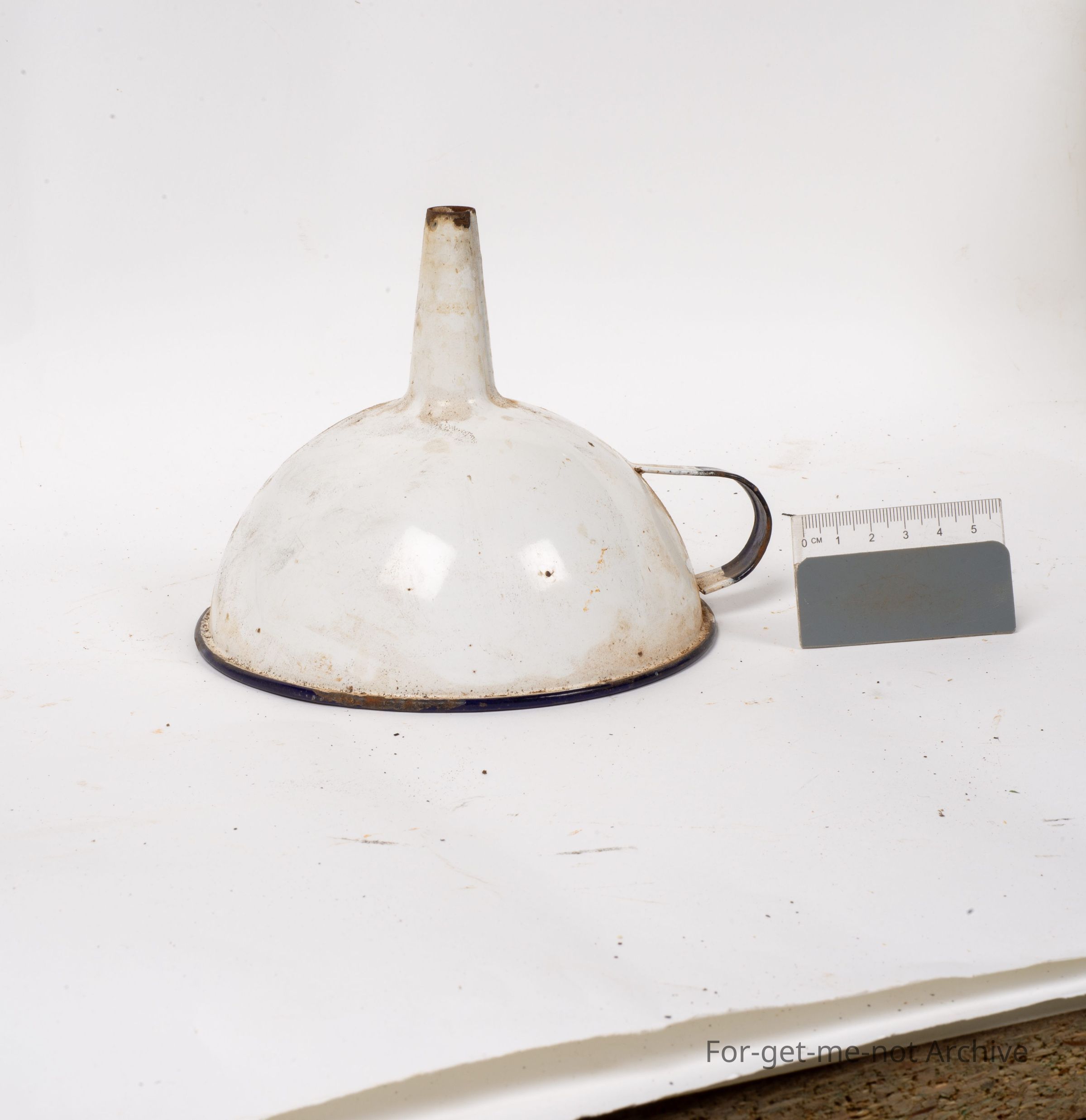 Is an early enamel funnel with a handle, possibly not all that old, but a lovely piece of enamel kitchenware,