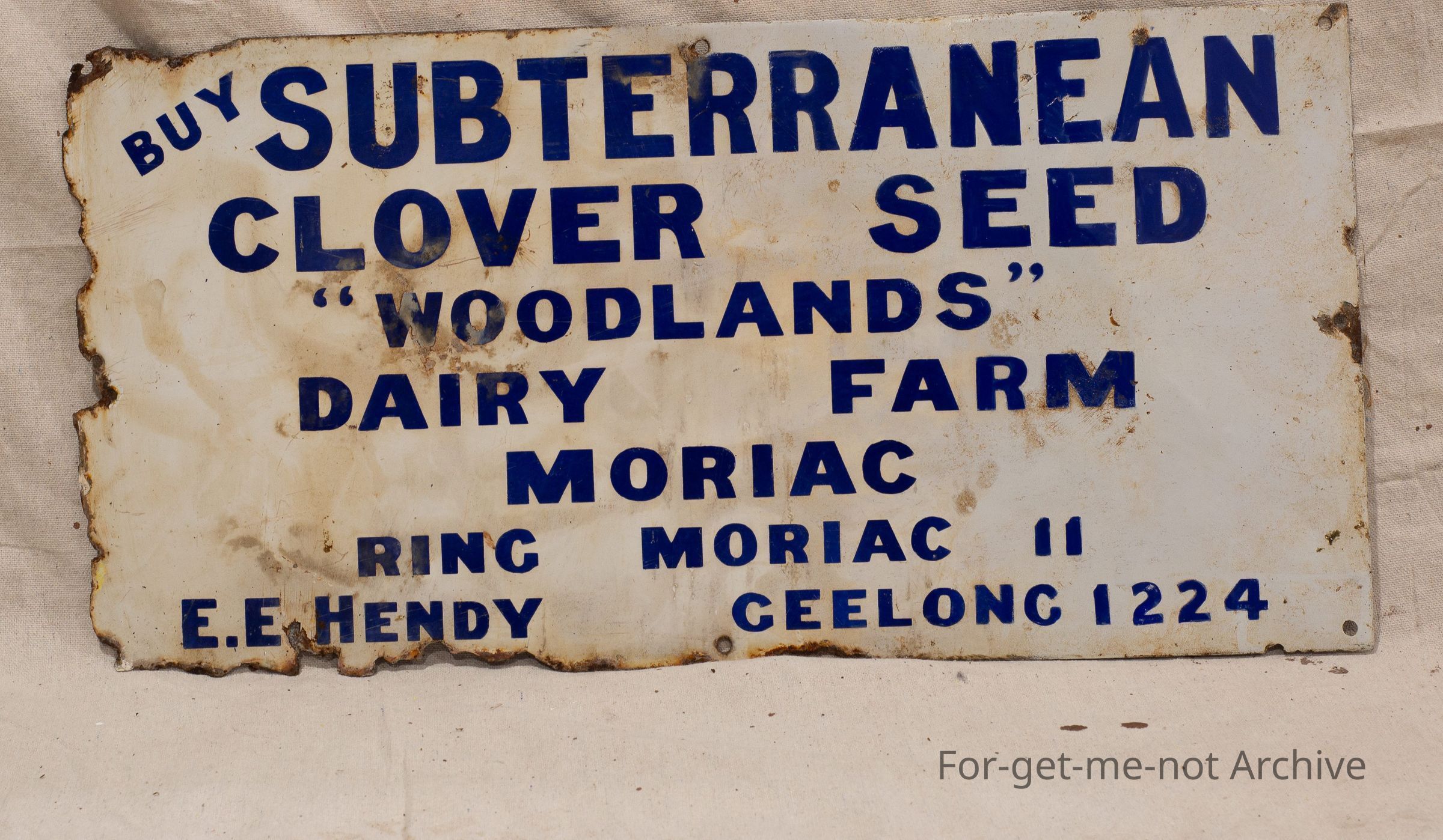 white background blue writing advertising clover seed from Woodlands Moriak
