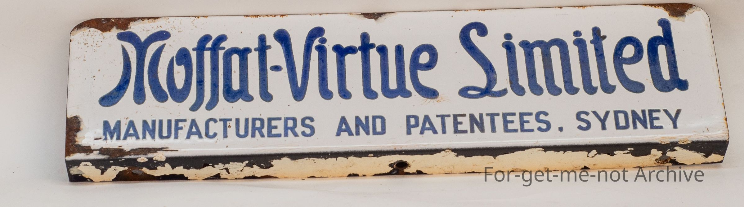 Is an enamel sign from Moffett Virtue Limited Manufacturers and Patent T Sydney. This particular sign would have been put on the overhead plank for shafting. This one is in very good condition. It came from Ettrick Station at Lismore.Collection