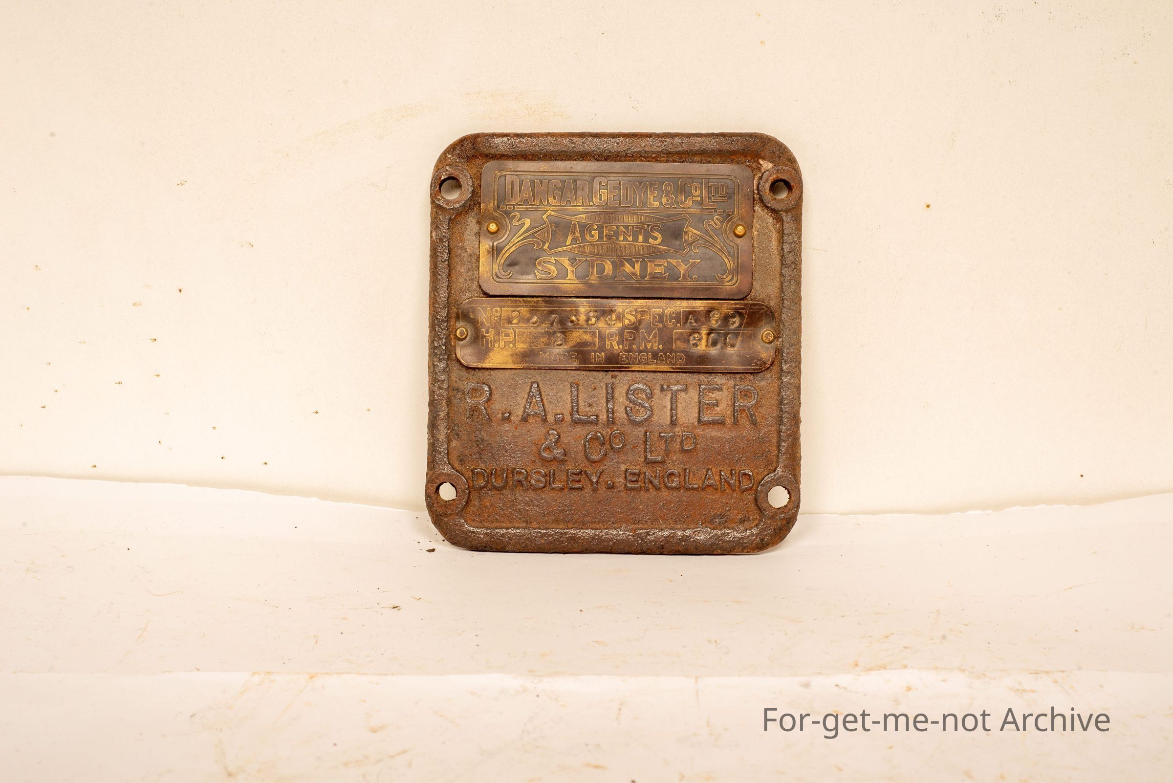 Is a cast iron plate from a Lister motor with a brass manufacturer or a brass plaque from Dangar Gedye Agent Sydney.