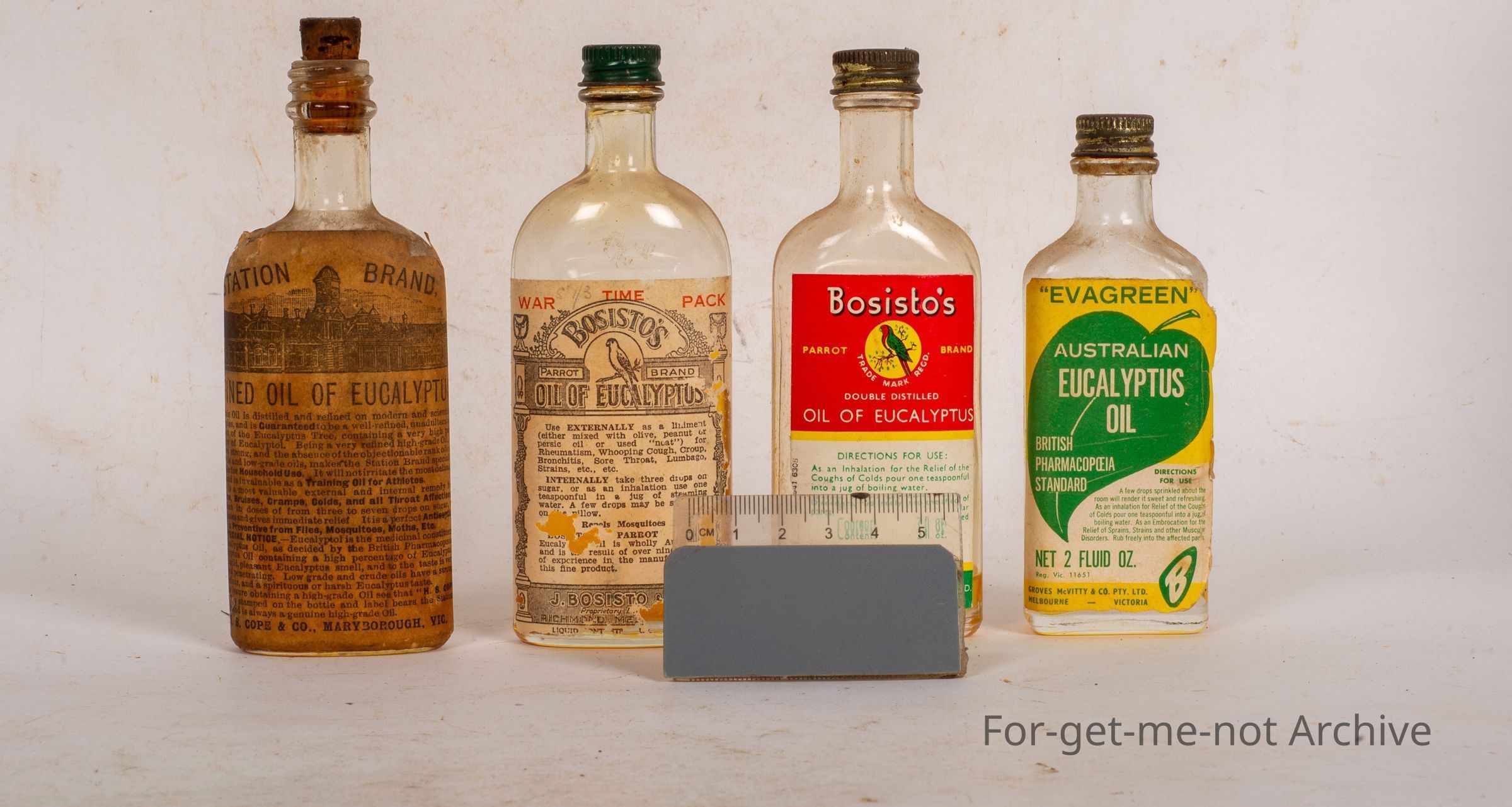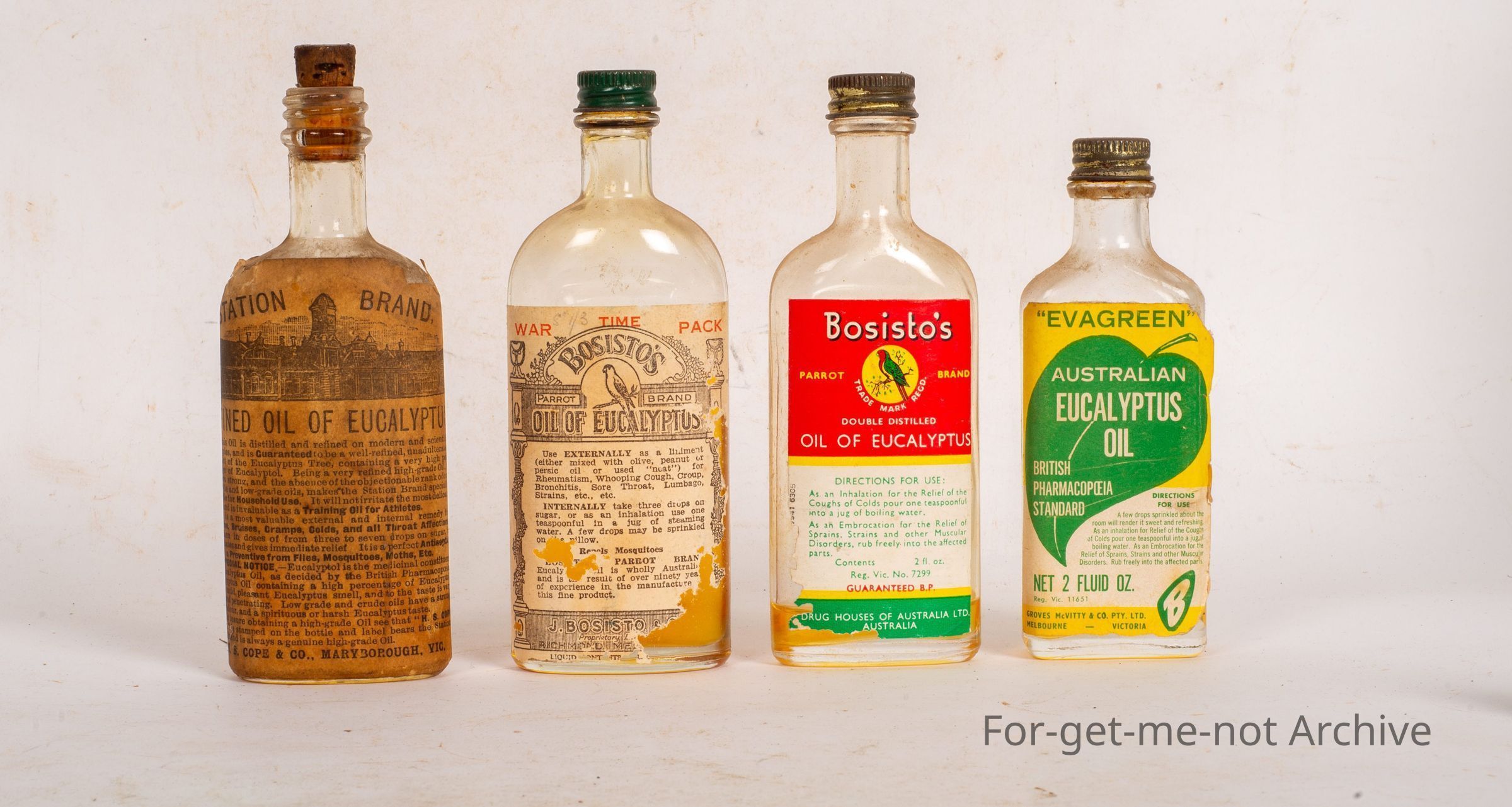 This is a group of 4, eucalyptus oil bottles, mainly 2 ounce. First one, Station brand, refined oil of eucalyptus, Maryborough, Victoria. 2nd one, this is an early, label from Bosistos. All time pack, eucalyptus oil, packed in Richmond. Number 3 is Bosisto's Common and Garden, label. Still seen as a contemporary label today. Packed by Drug houses of Australia. And the next one is Evergreen Australian Eucalyptus Oil, packed in Melbourne, Victoria by Groves McVitte.Collection