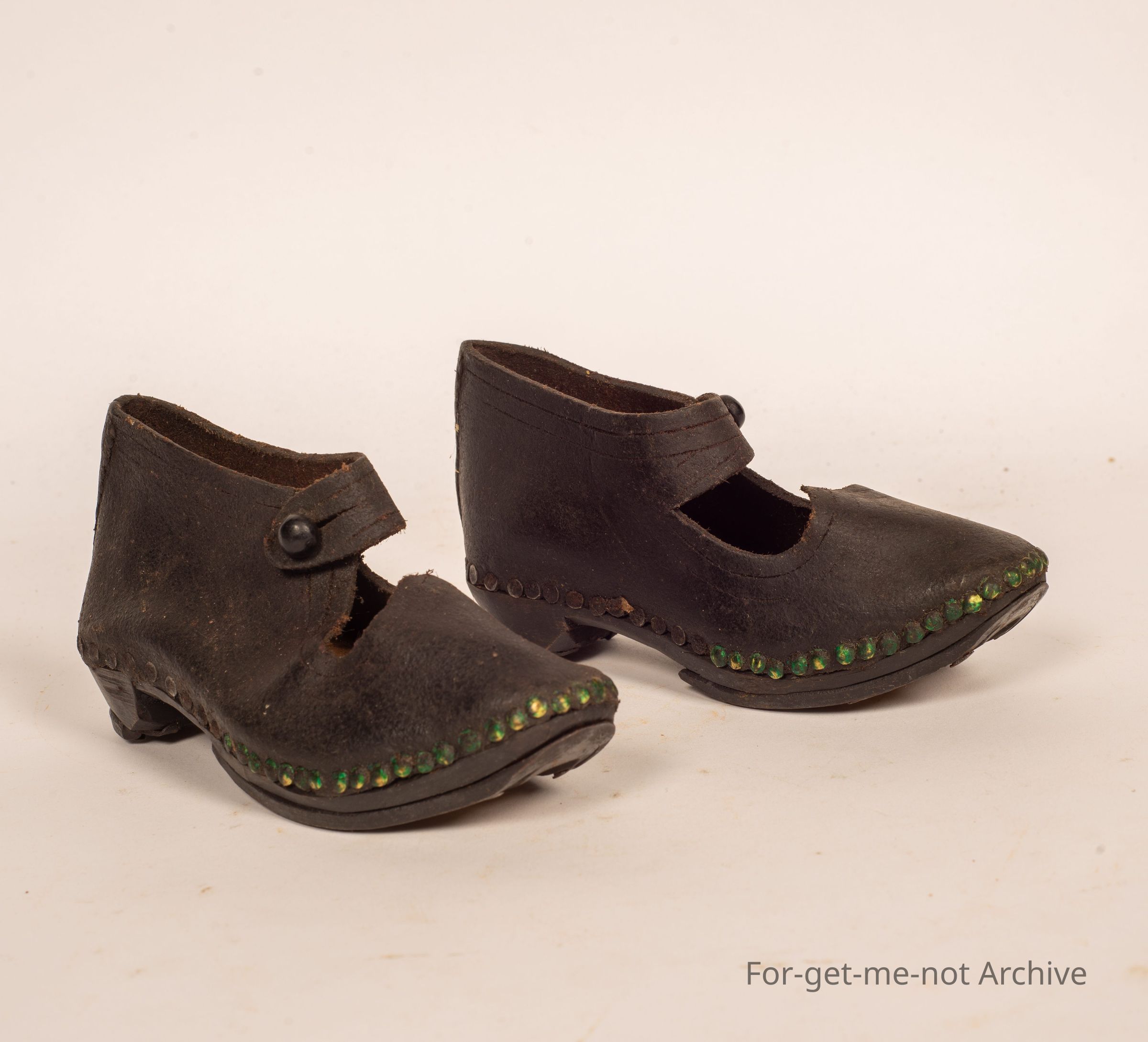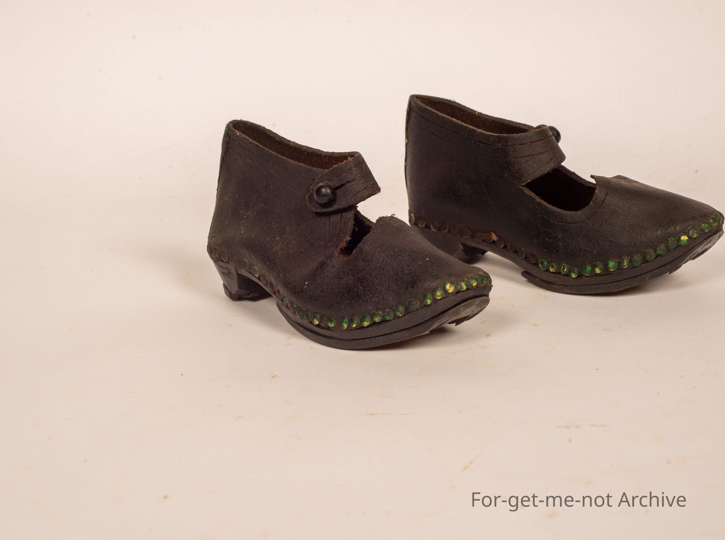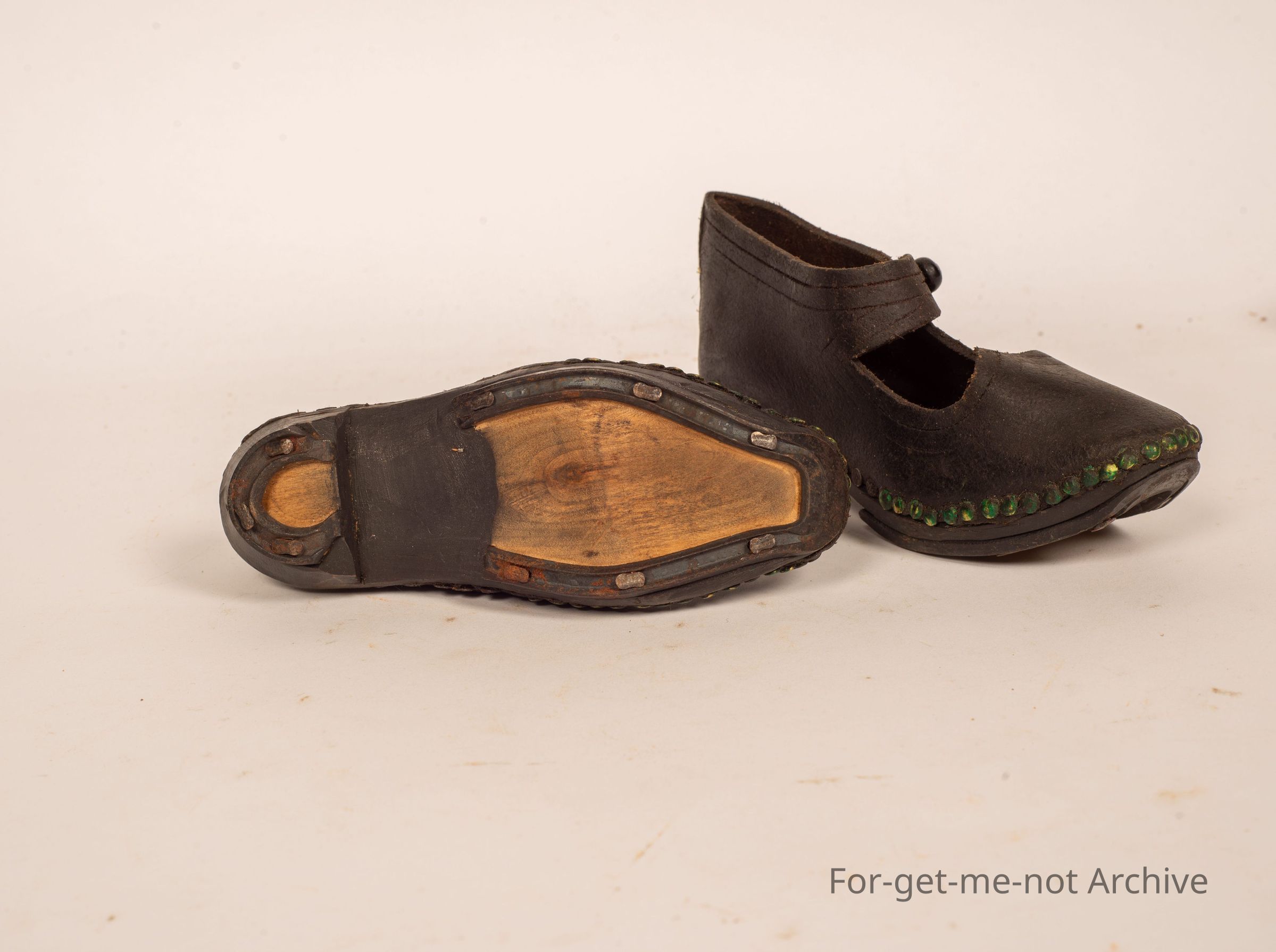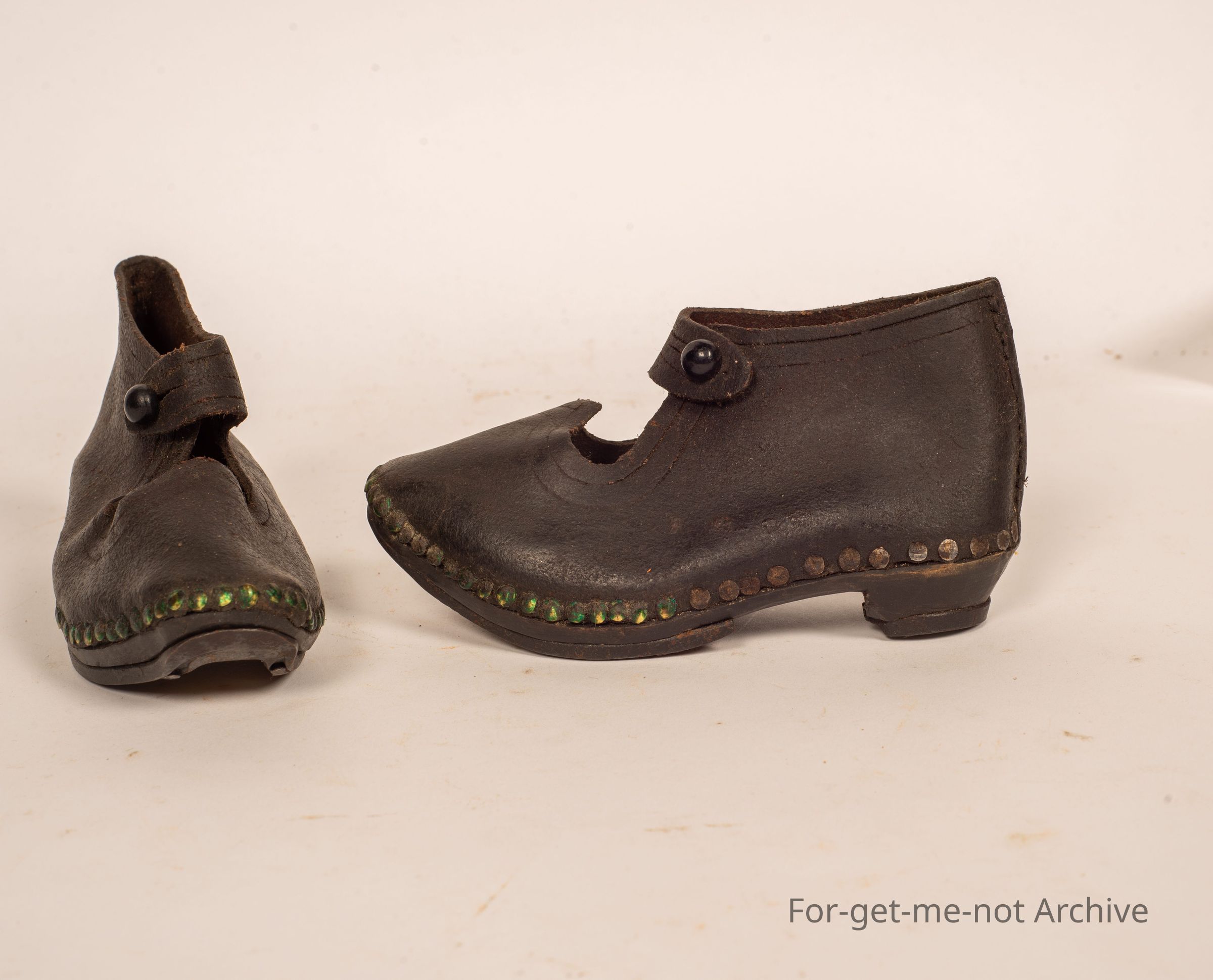 Are a pair of kids, European shoes. Very small size. The feature of these, they're wooden soled leather uppers with seemingly mother of pearl type stuff to tack the leather onto the wooden sole. These are quite, quite an amazing pair of shoes. No doubt European.Collection