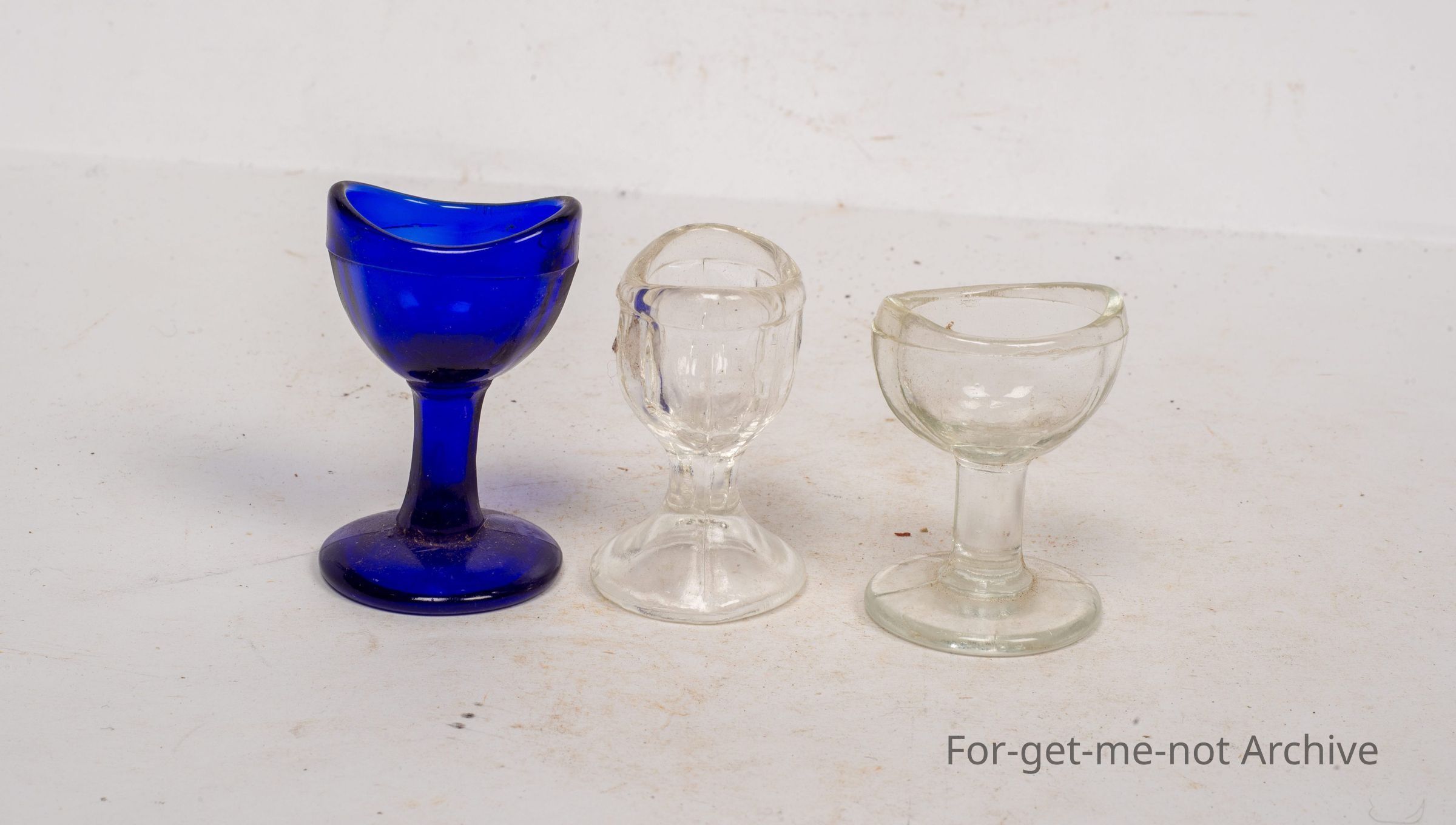 Is a group of 3 glass eye baths.1, beautiful blue, the other 2, clear glass, but of different design and shape.
