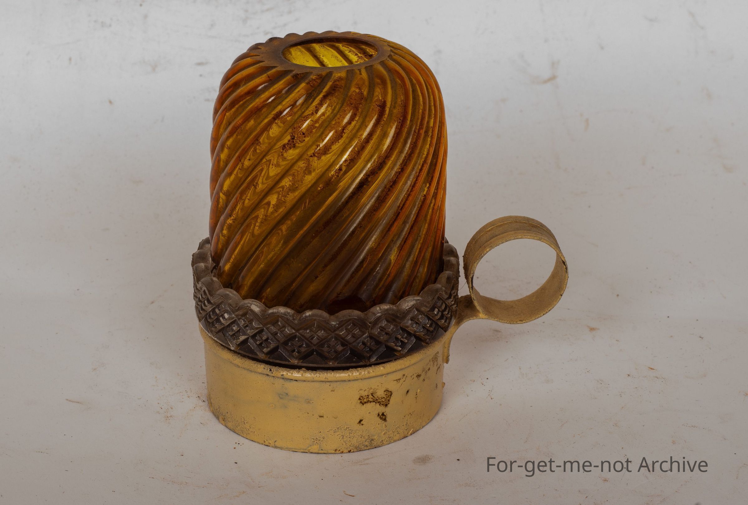 This is a beautiful little German equivalent of a Clark's fairy light. Beautiful swirled pattern in the shade. A little tin holder with a finger grip thing on it, for carrying it around. An absolute gem piece,Collection