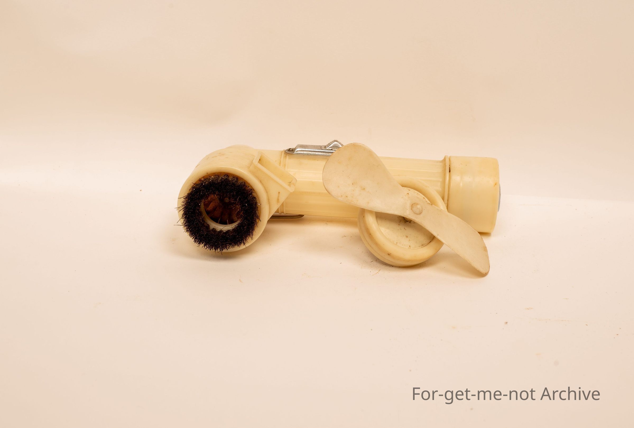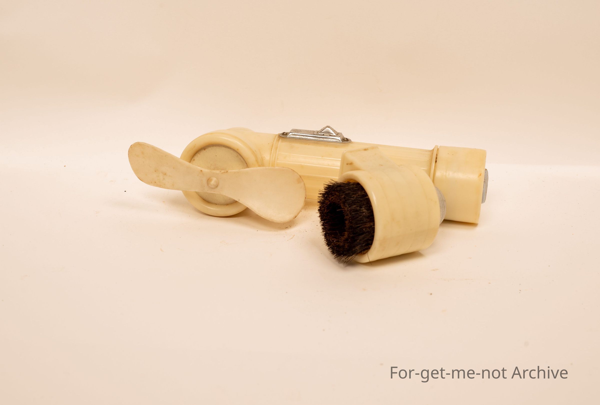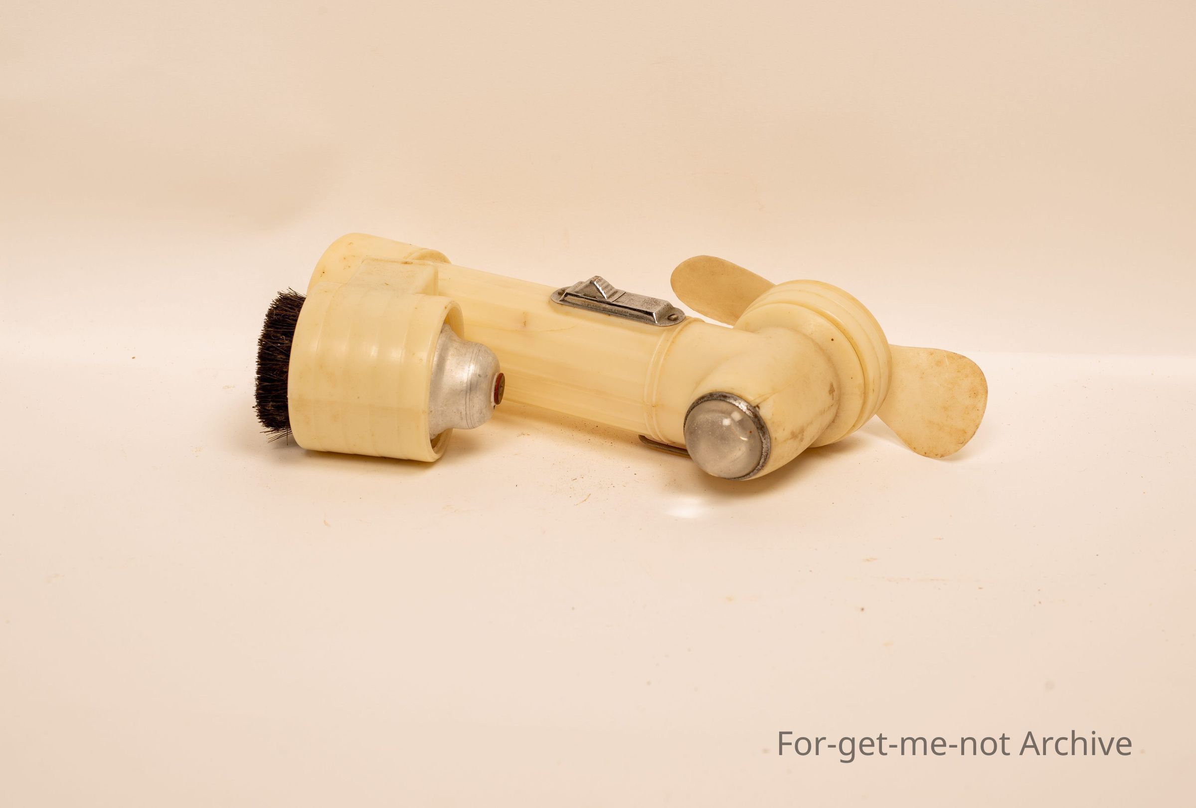 Plastic dual purpose tool which seconds as a fan and also as a brush. And a large battery operated made of plastic part of a set made in Hong Kong
