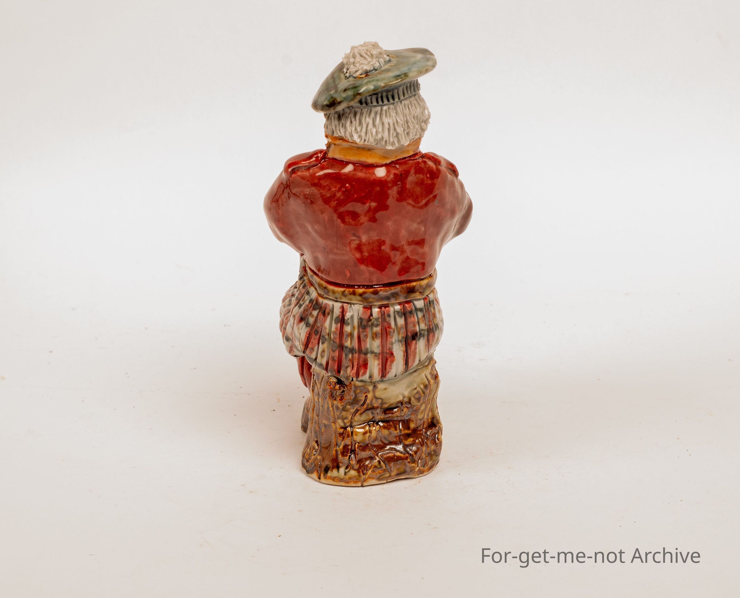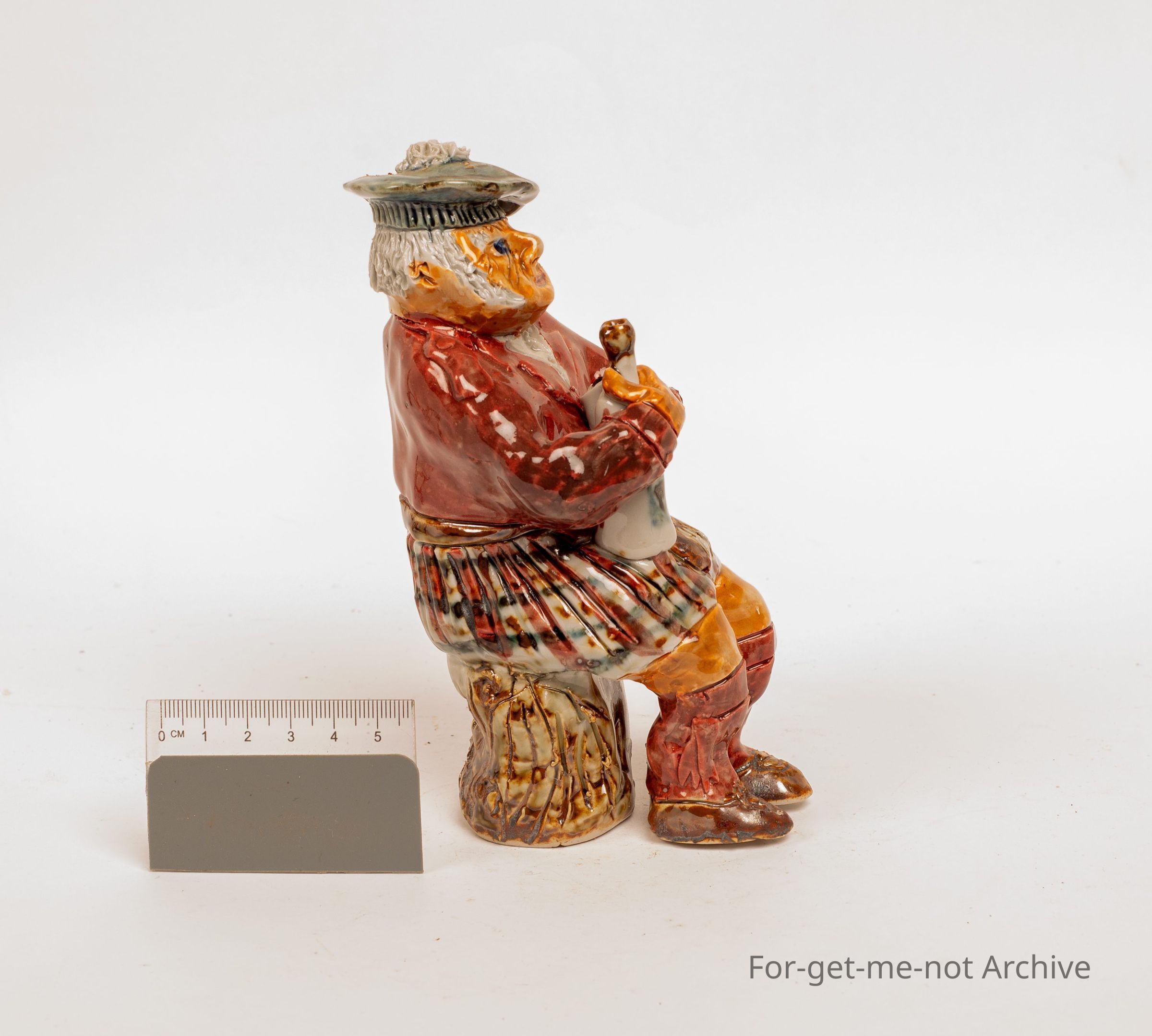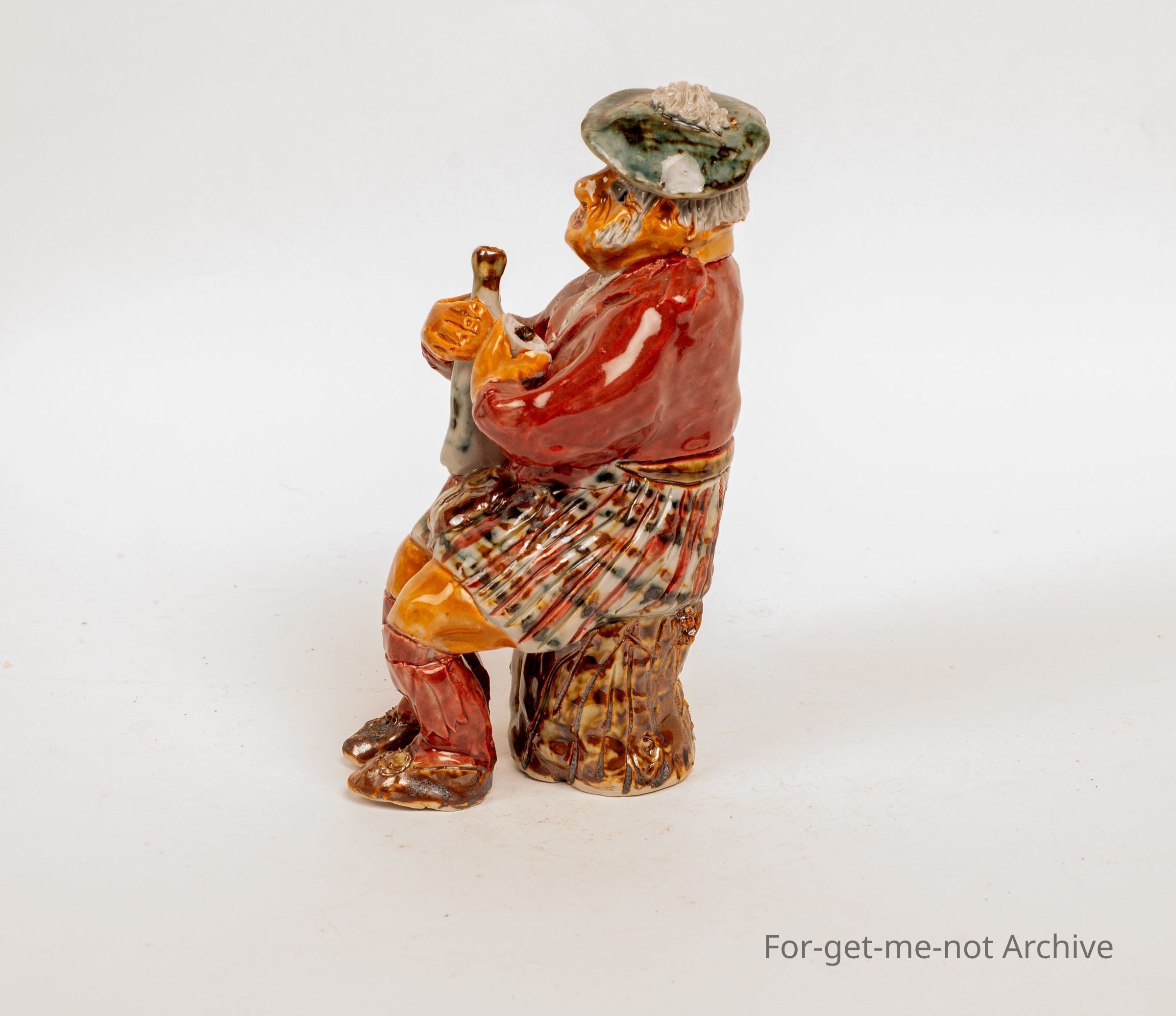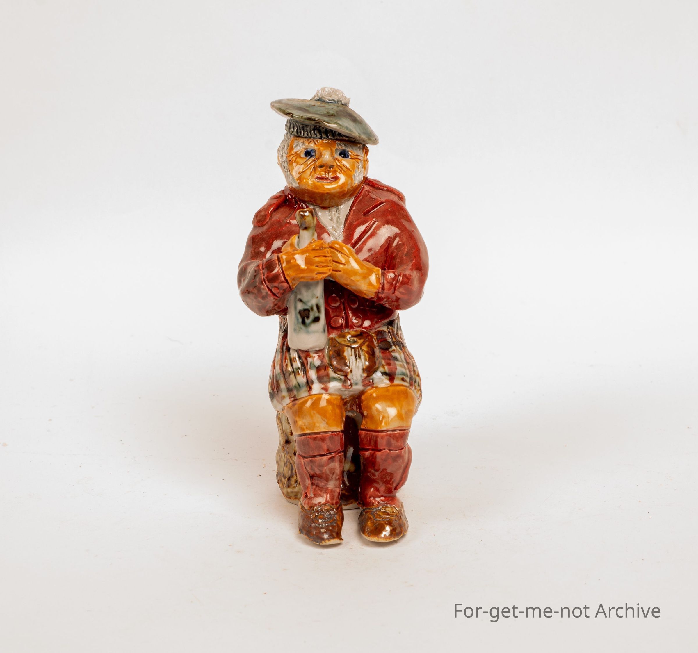 A figurine, of a Scotsman with a bottle of whiskey, made at Saddleworth Pottery by Jane Kerr.