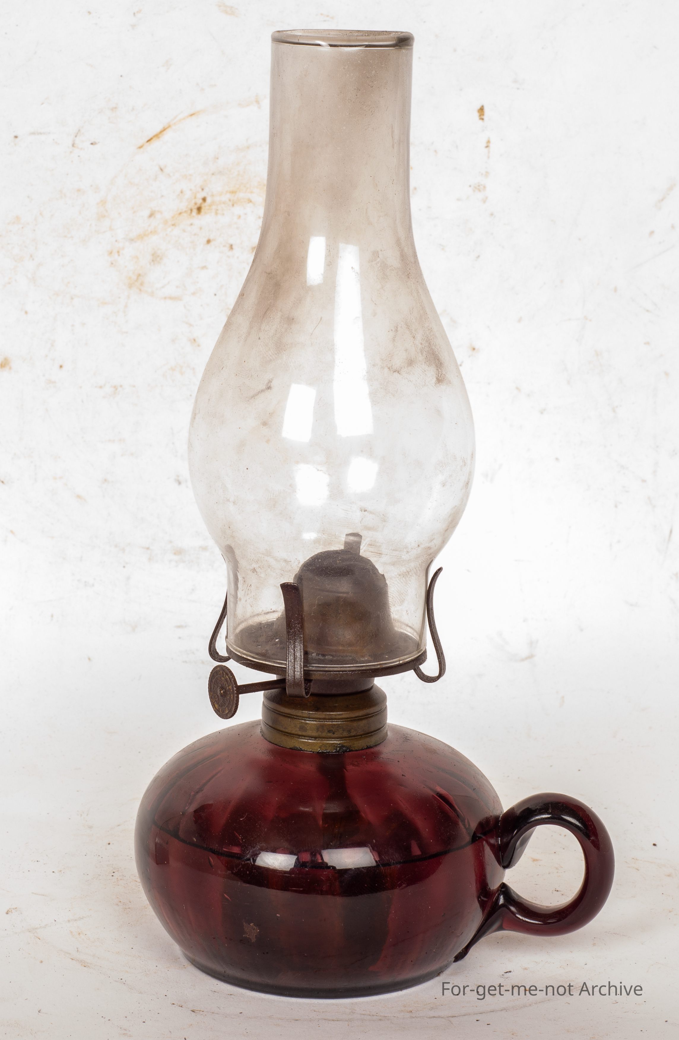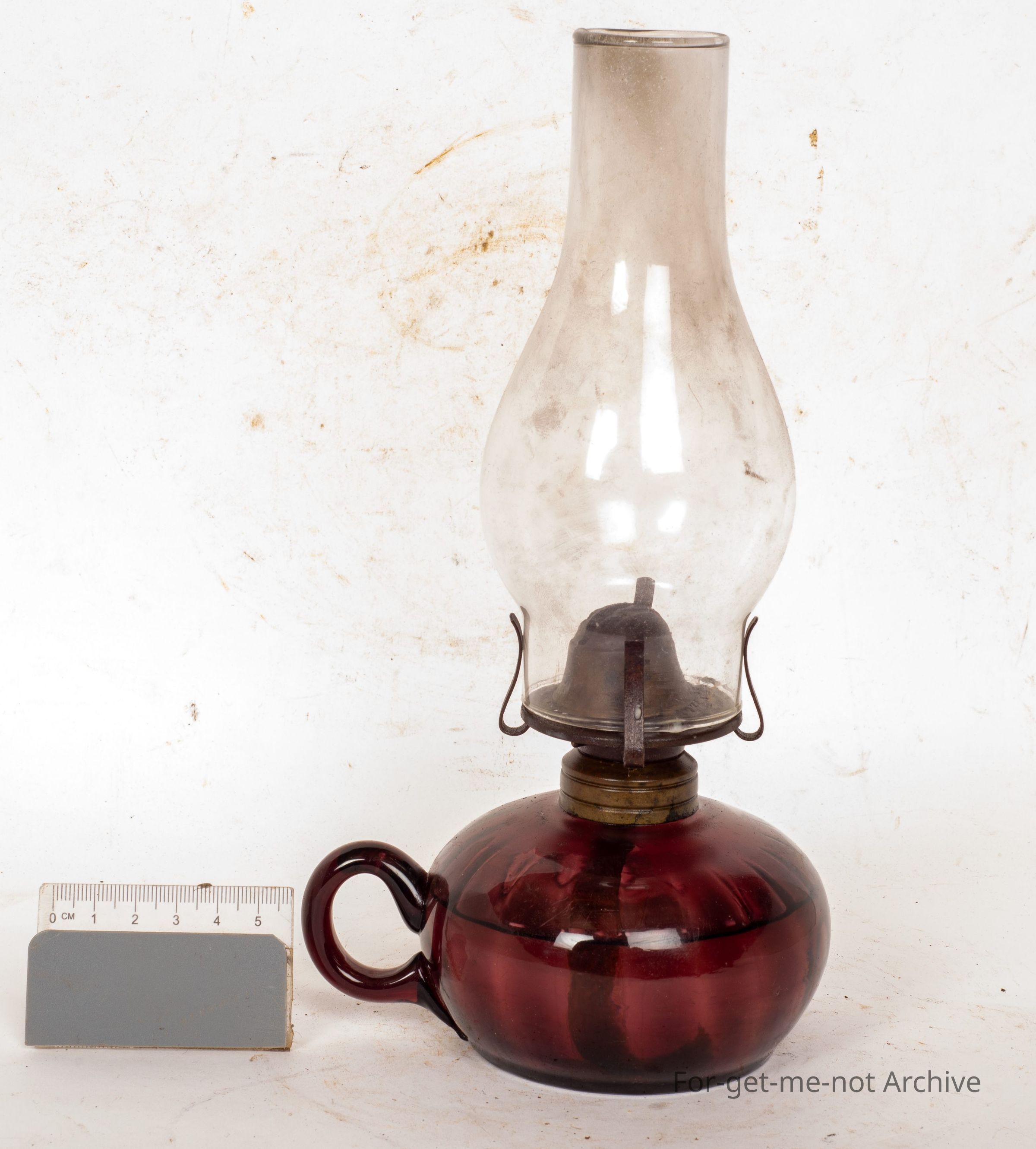 This is a beautiful little finger lamp. A deep burgundy coloured font with ribbing through the whole perimeter of it, in very good order. A very attractive little piece.