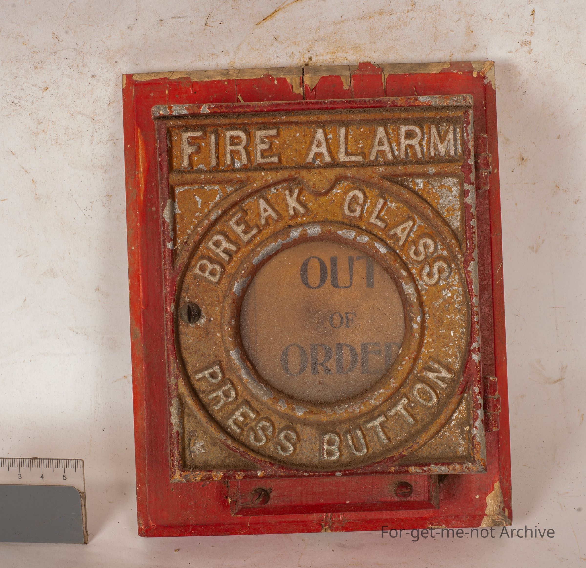 This is an old fashioned fire alarm stating brake glass press button. In the behind the glass is a paper piece saying outer water. Looks all complete