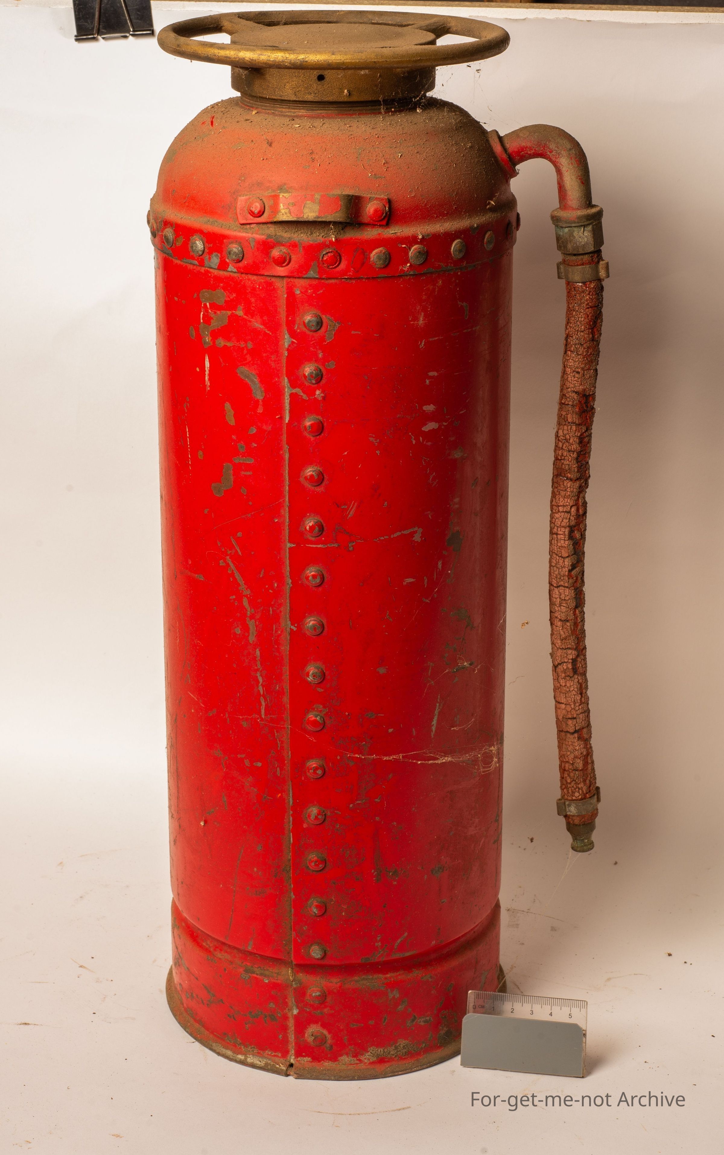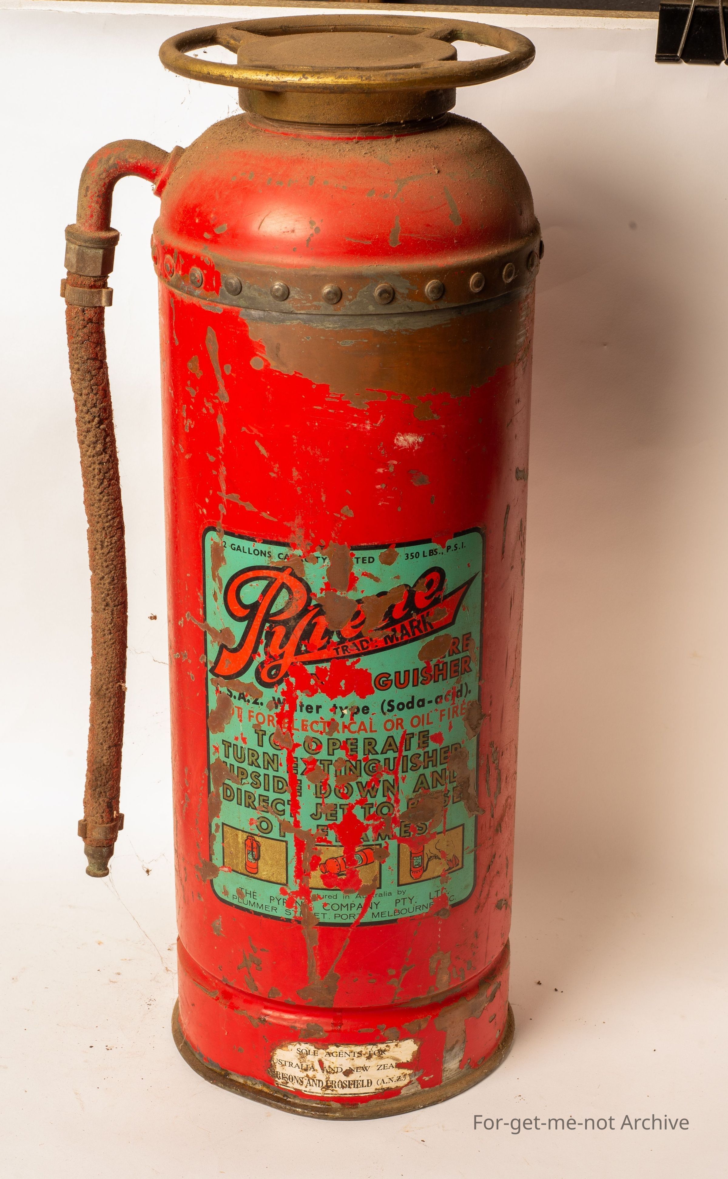 This is a large brass fire extinguisher called the called the Pyrene. Probably still in workable order. Hose, the tap at the top, everything there, lovely piece.