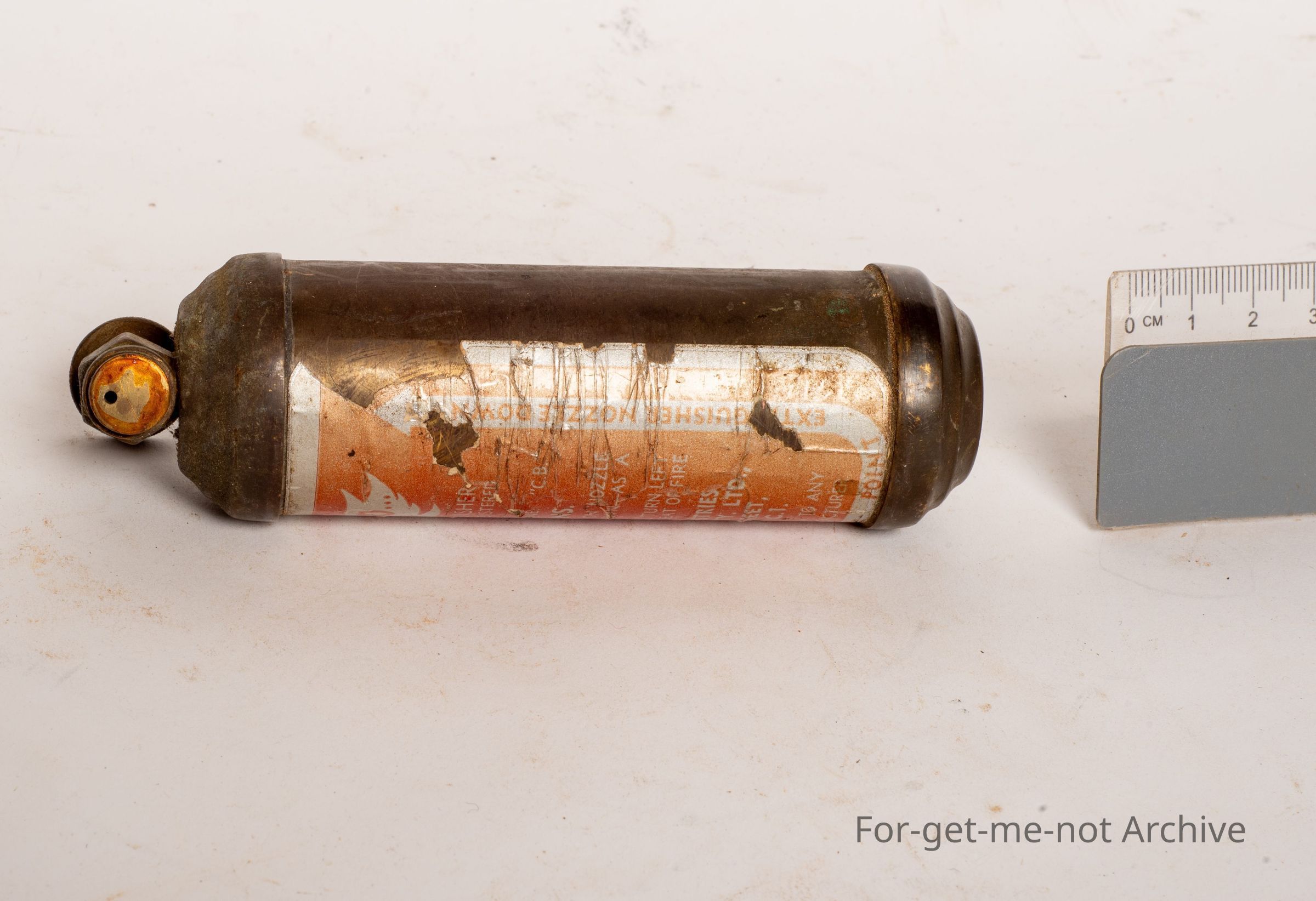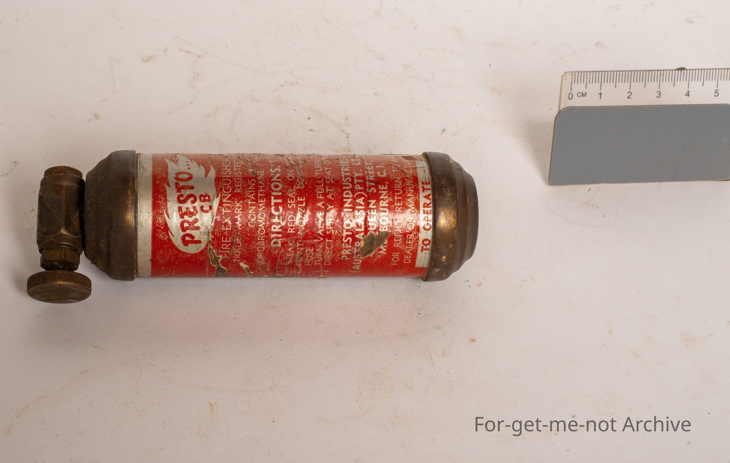 This is a miniature fire extinguisher called Presto c b. Possibly may have been kept in a car or some other thing where there's likely to be small fires.