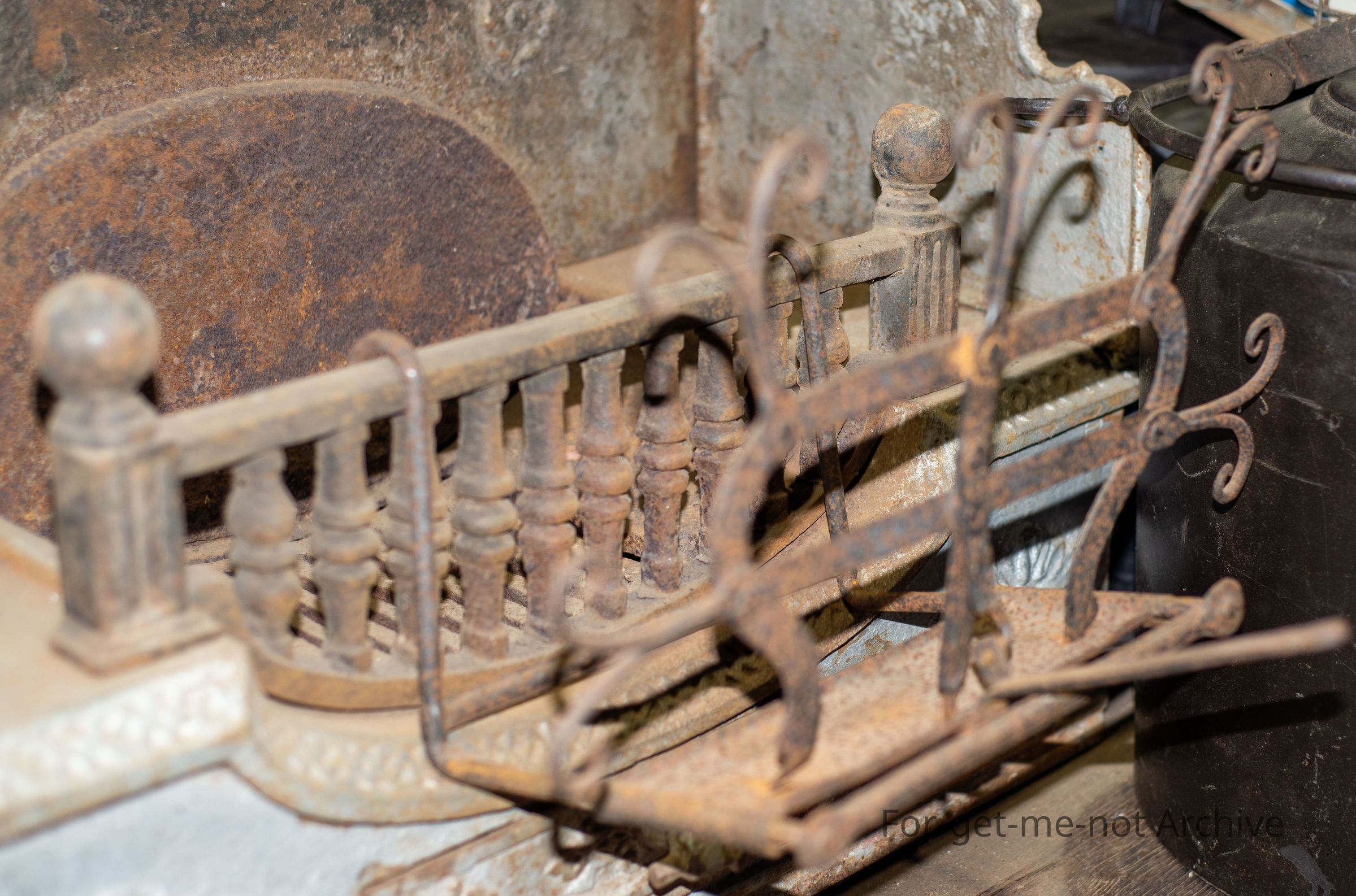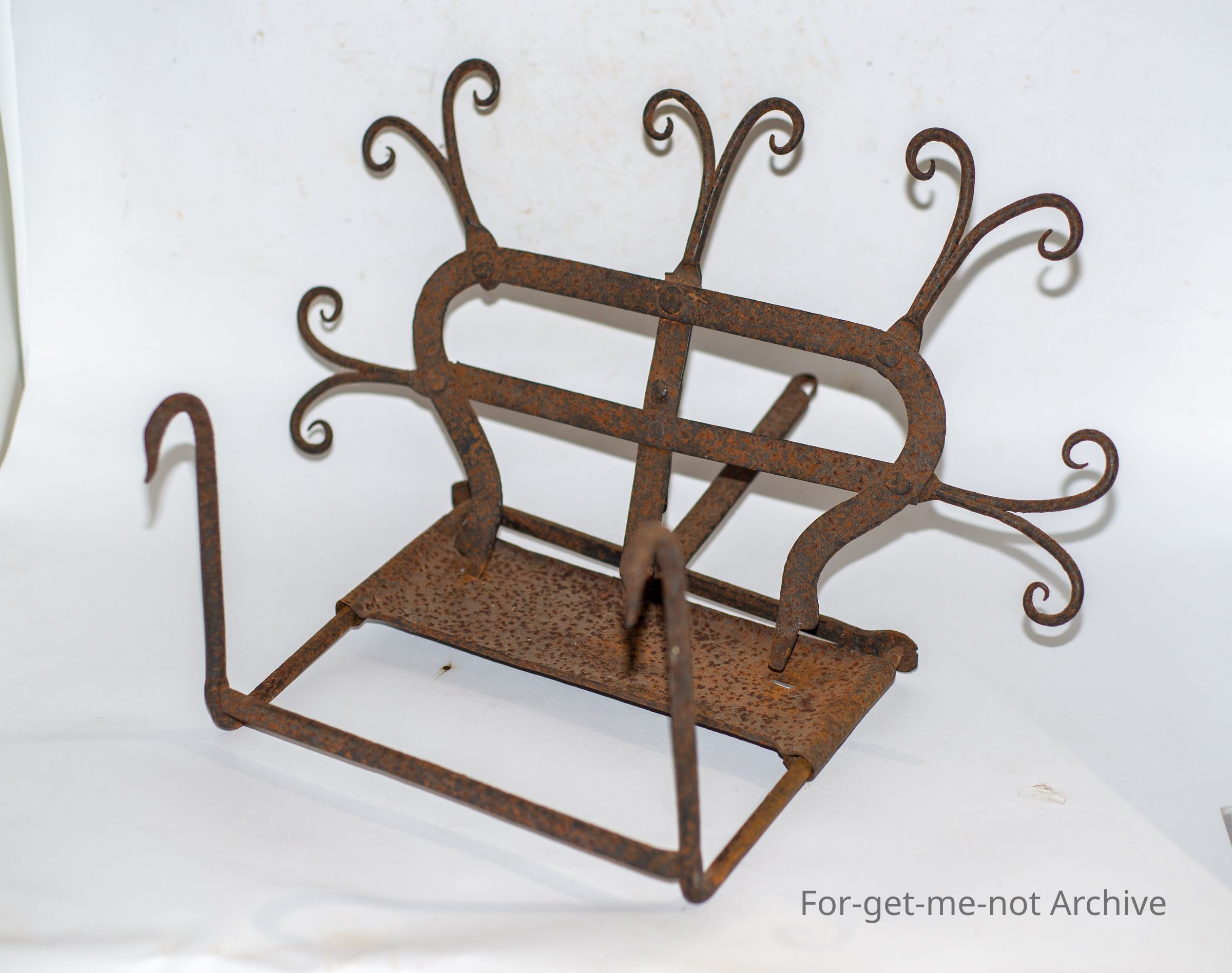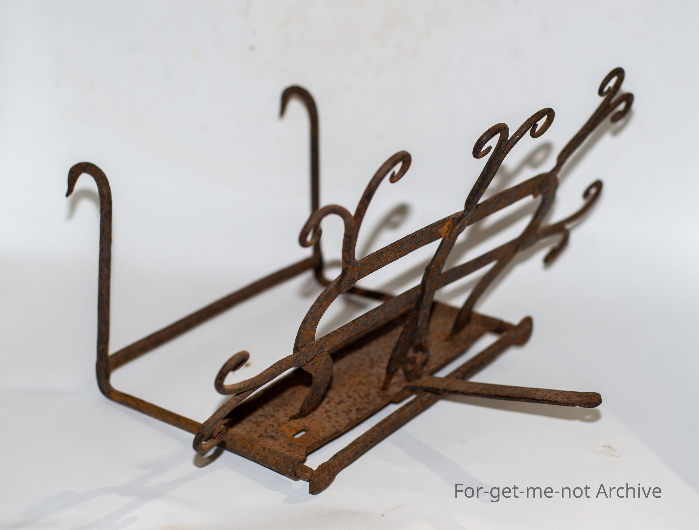 This is a fire roasting jack that has been made by a blacksmith, all metal , food is attached to the frame and can be cooked from the heat of the fire, the jack attaches to the front bar of a cast iron fire placeCollection