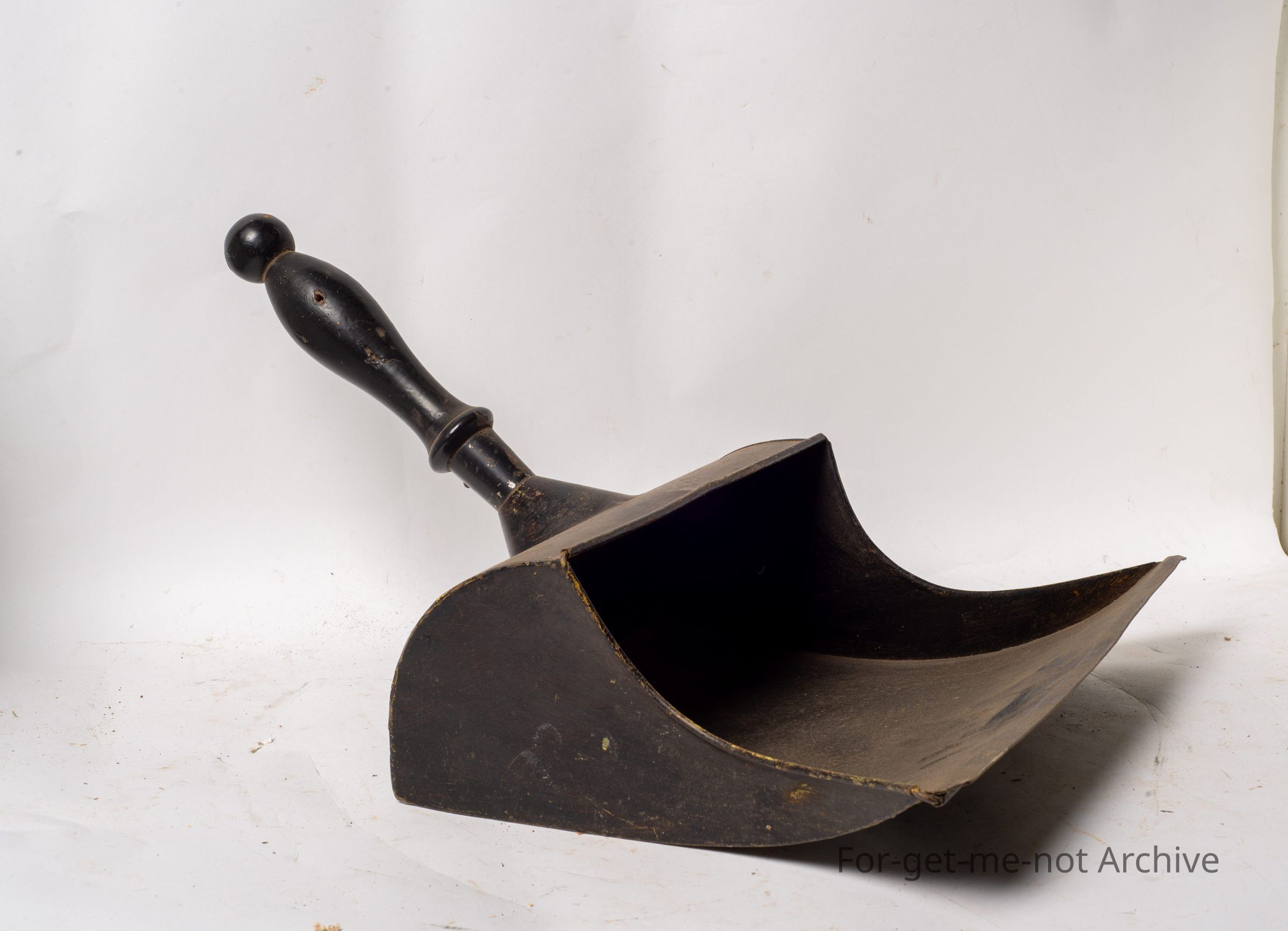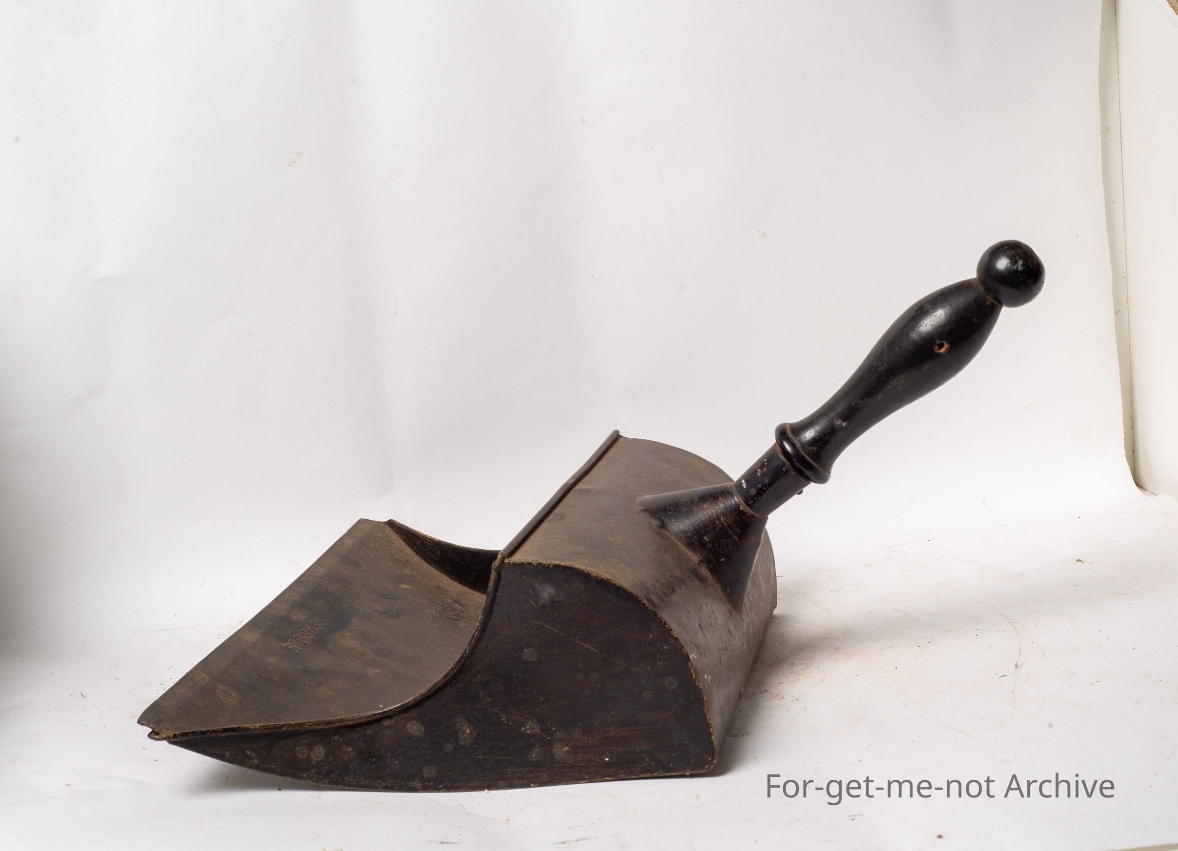 This is the fireside shovel that would have gone with the bucket and the broom. This would be English made as it is a registered design, wooden handle, quite an ornate thing, and a very effective shovel.Collection