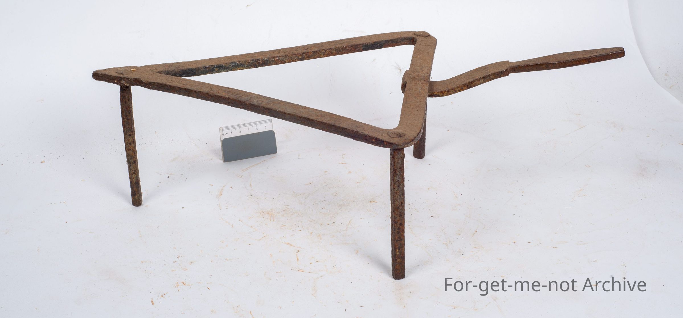 This is a fireplace trivet on 3 legs, handle. These were used for cooking in coals in the fireplace or lifting boilers, from the fireplace off the fireplace crane to sit them to check how the food's cooking. This is all blacksmith made. Blacksmith joins a beautiful, very early skilfully made piece.Collection