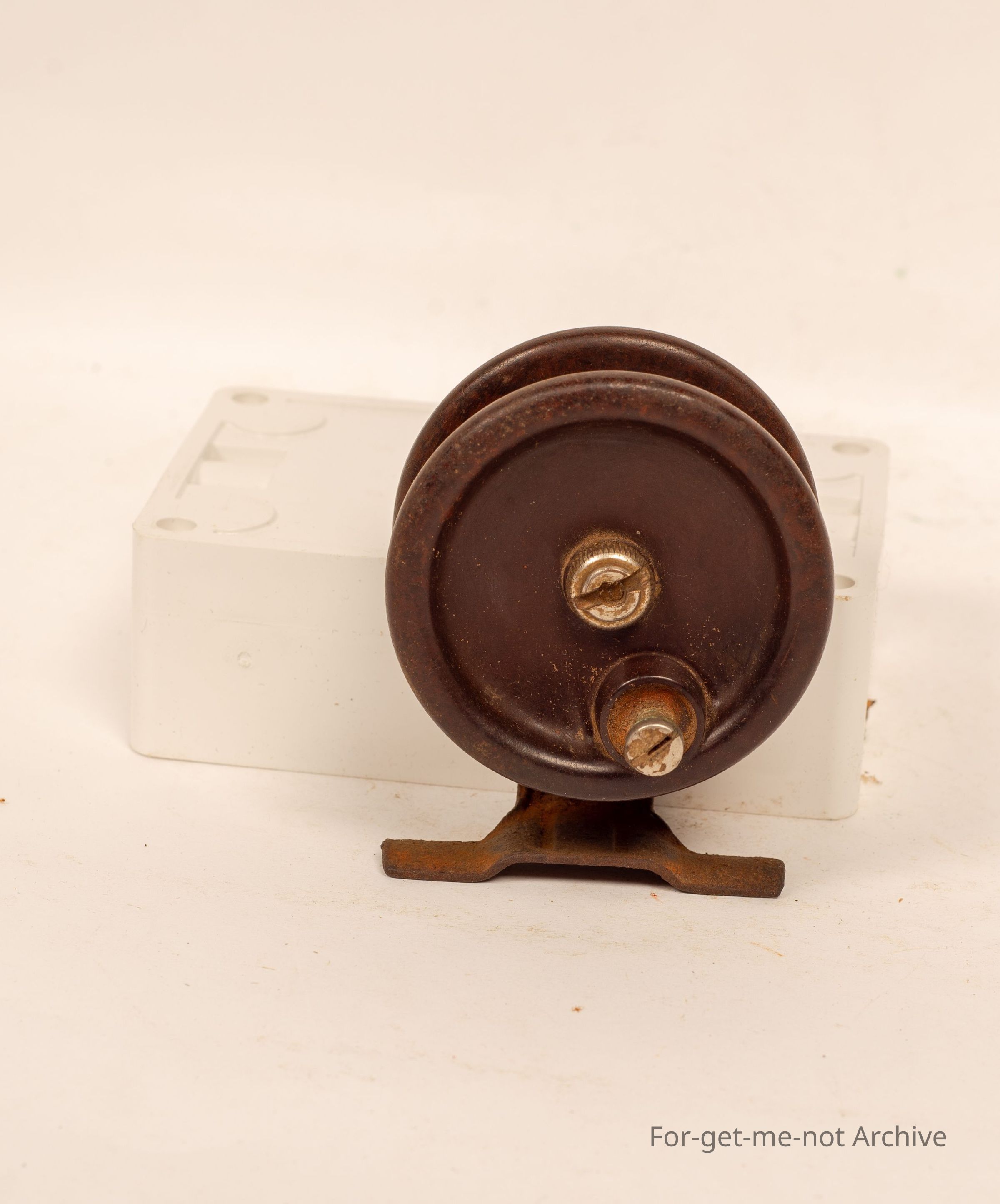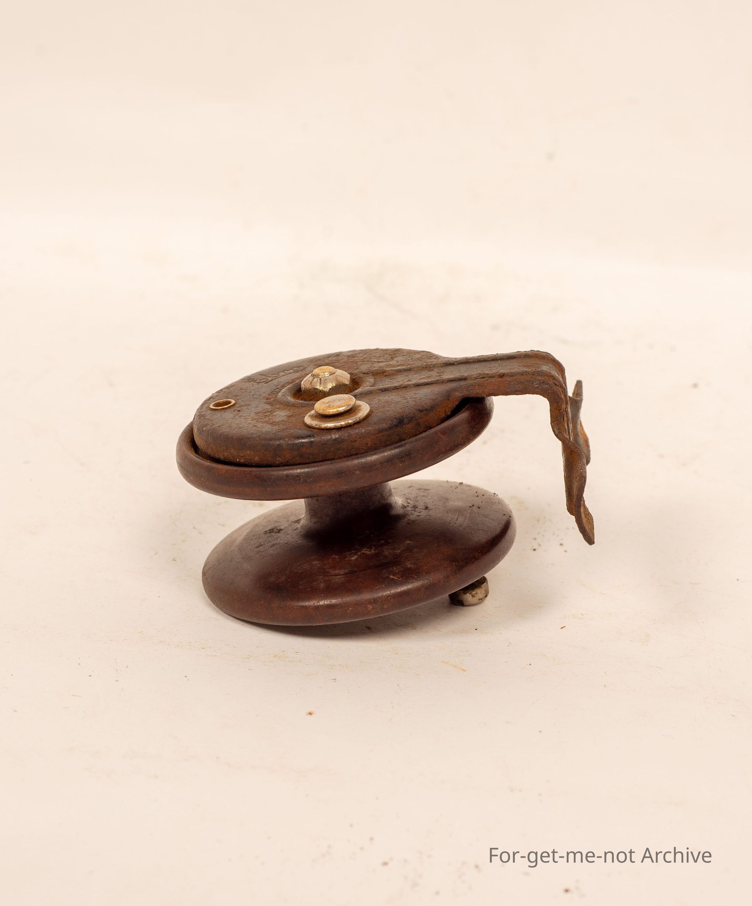 Small fisherman's reel, made of Bakelite Brand. Can't read it.